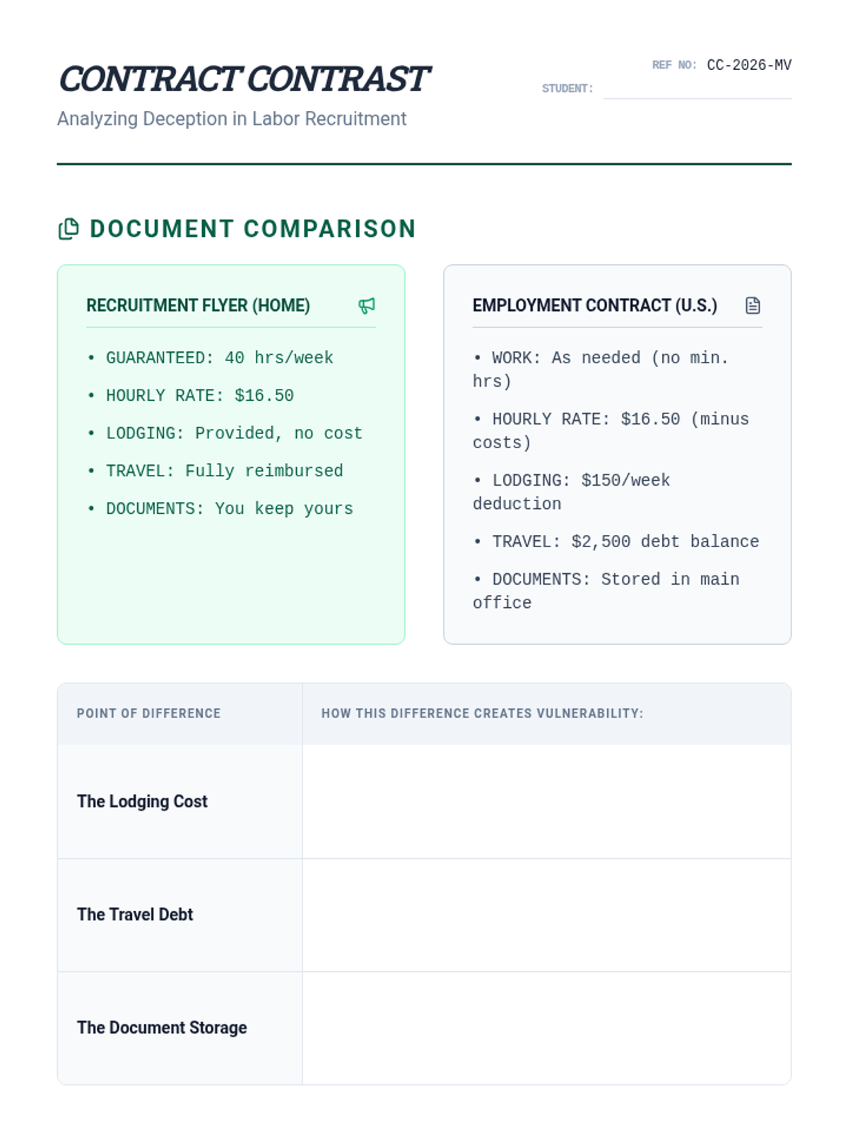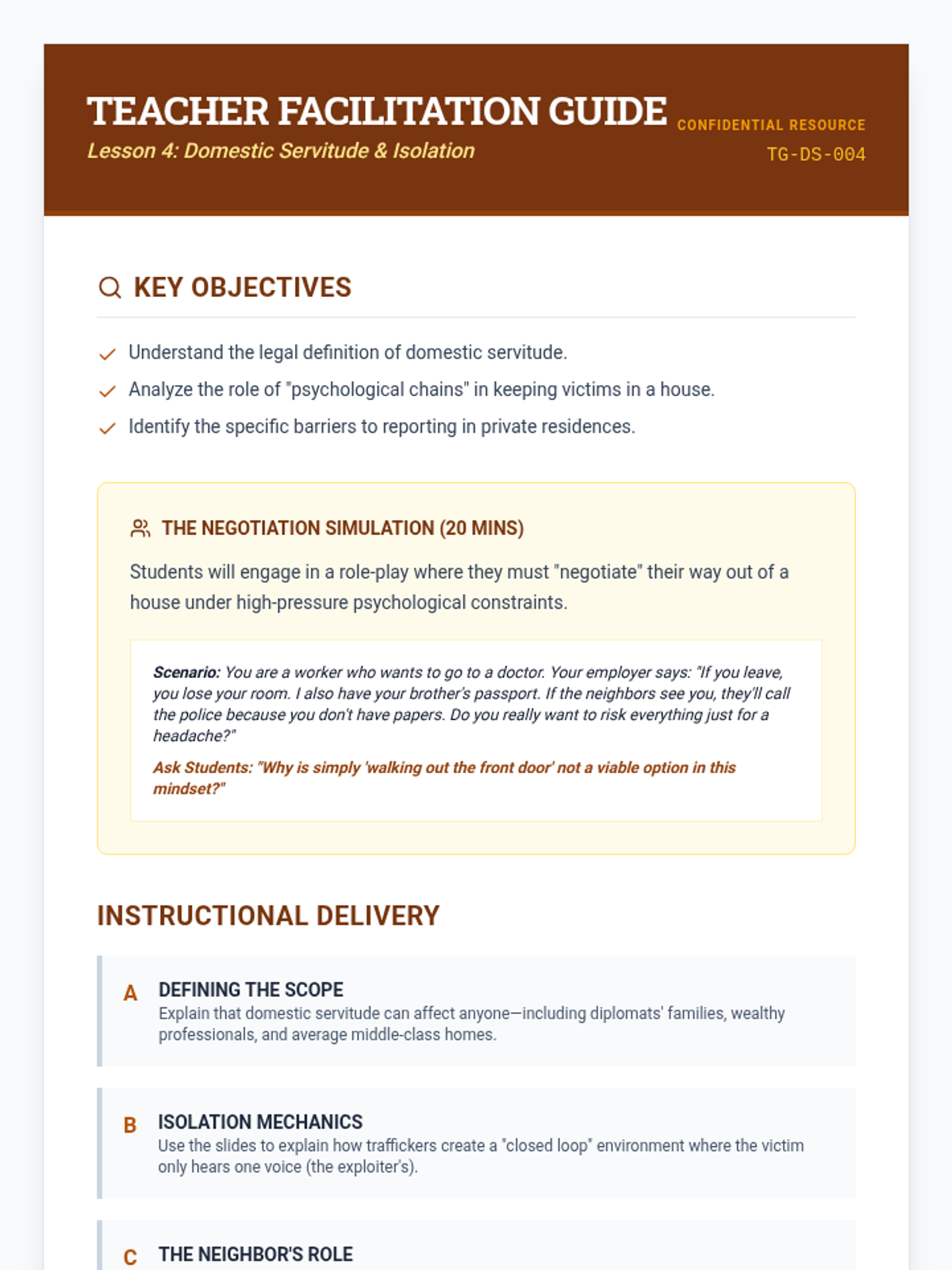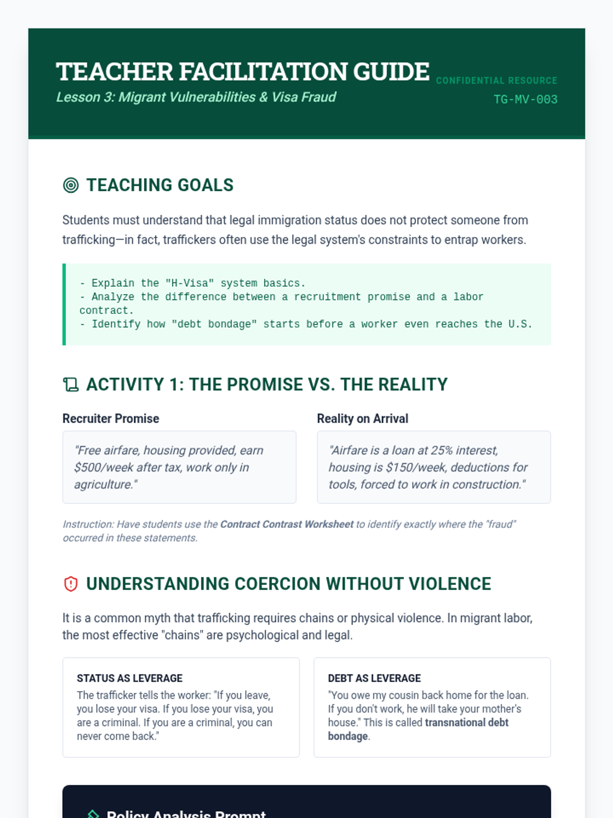 A comprehensive sequence for 11th-grade students focusing on labor trafficking and economic exploitation. Students will learn to identify indicators of forced labor, analyze global supply chains, understand the vulnerabilities of migrant workers, and recognize signs of exploitation in their own communities.
