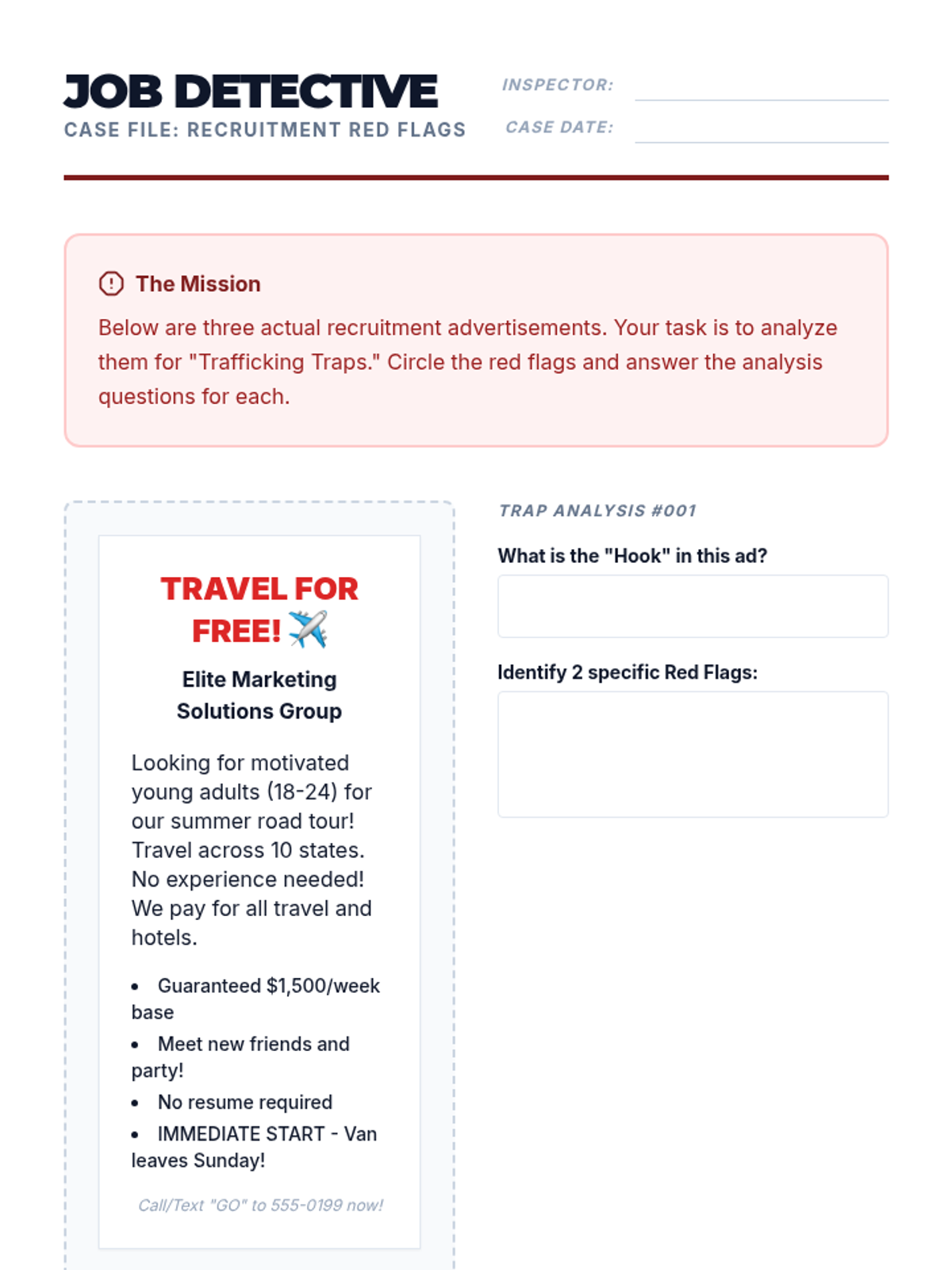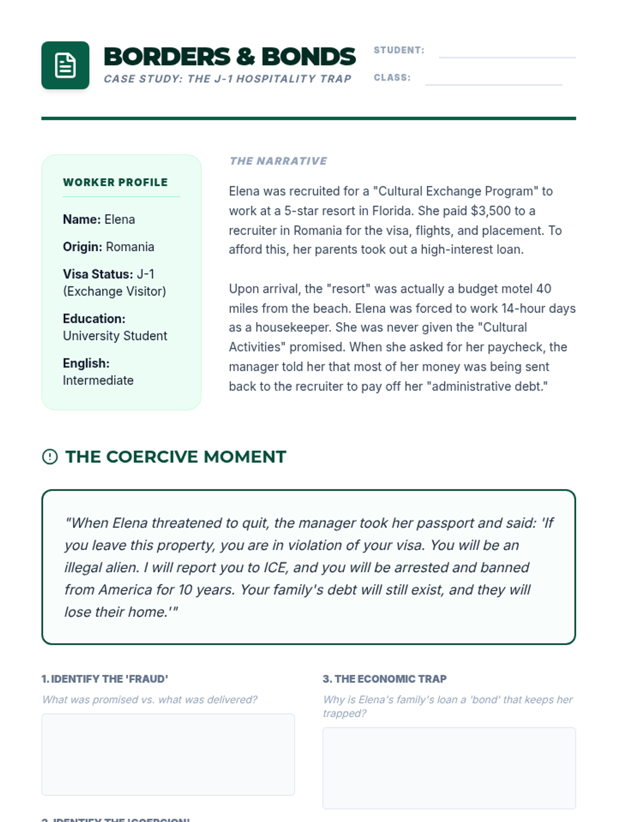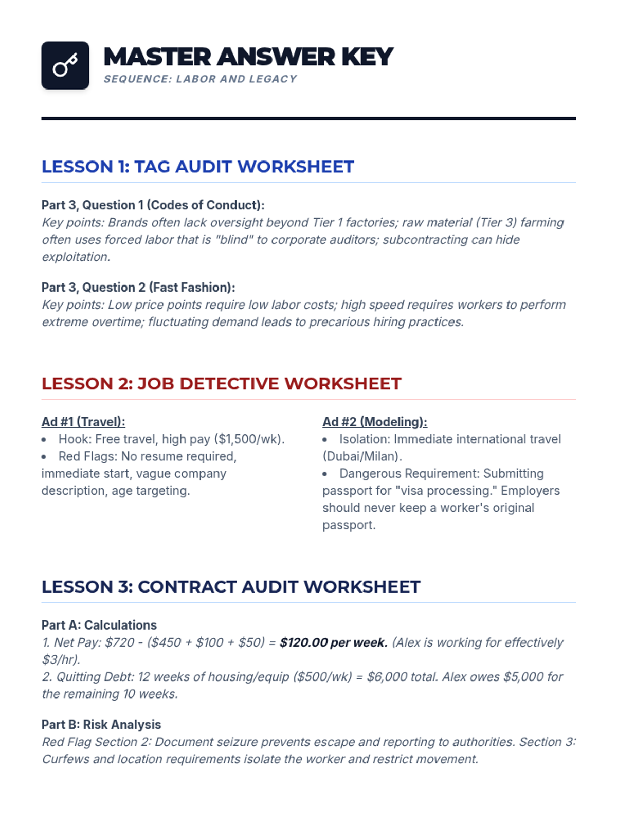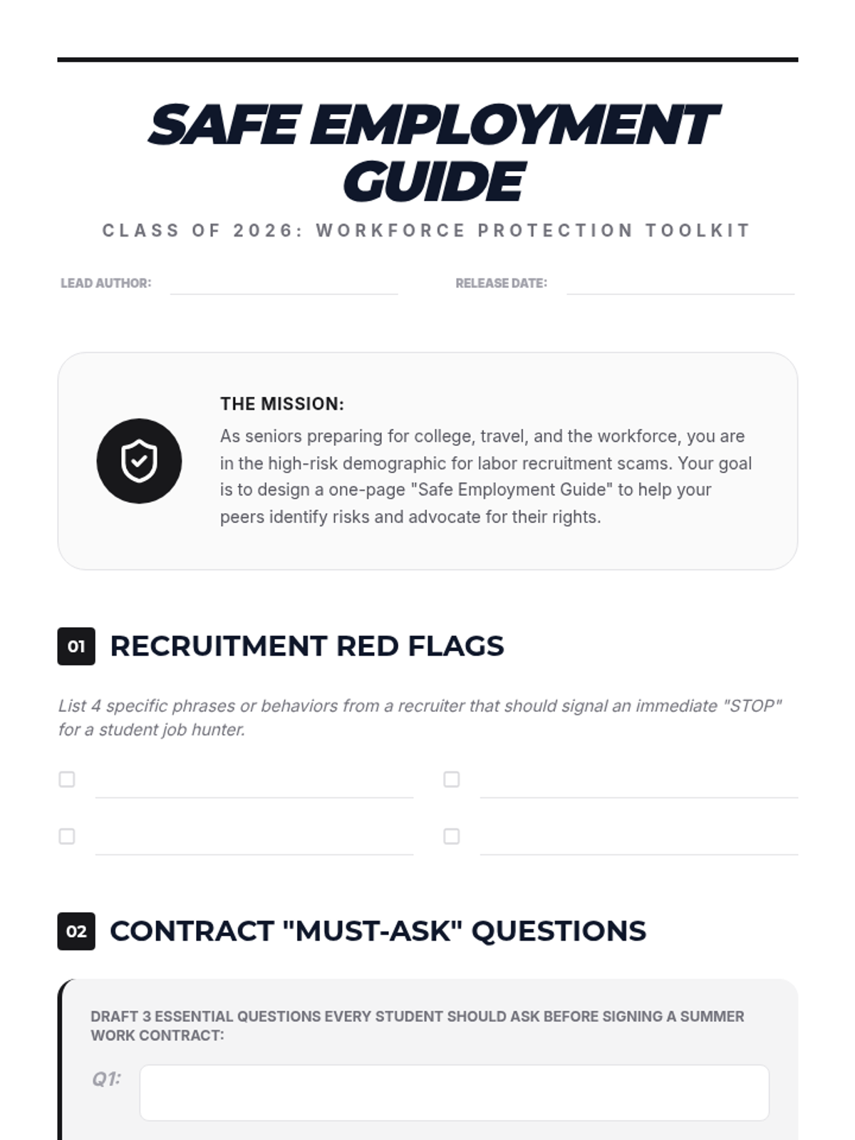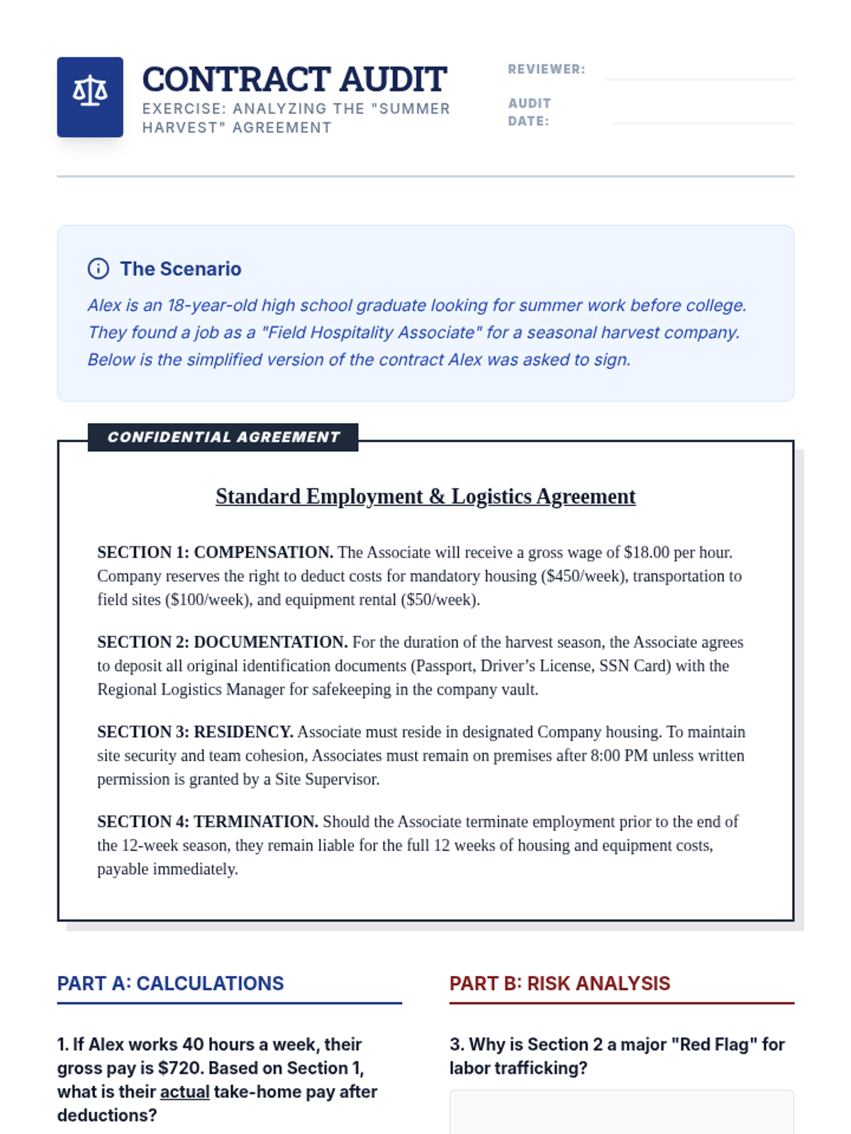 A comprehensive sequence for 12th-grade students focusing on labor trafficking, economic exploitation, and employment safety. Students will learn to identify recruitment scams, analyze coercive contracts, and understand the systemic vulnerabilities that facilitate trafficking in global supply chains.