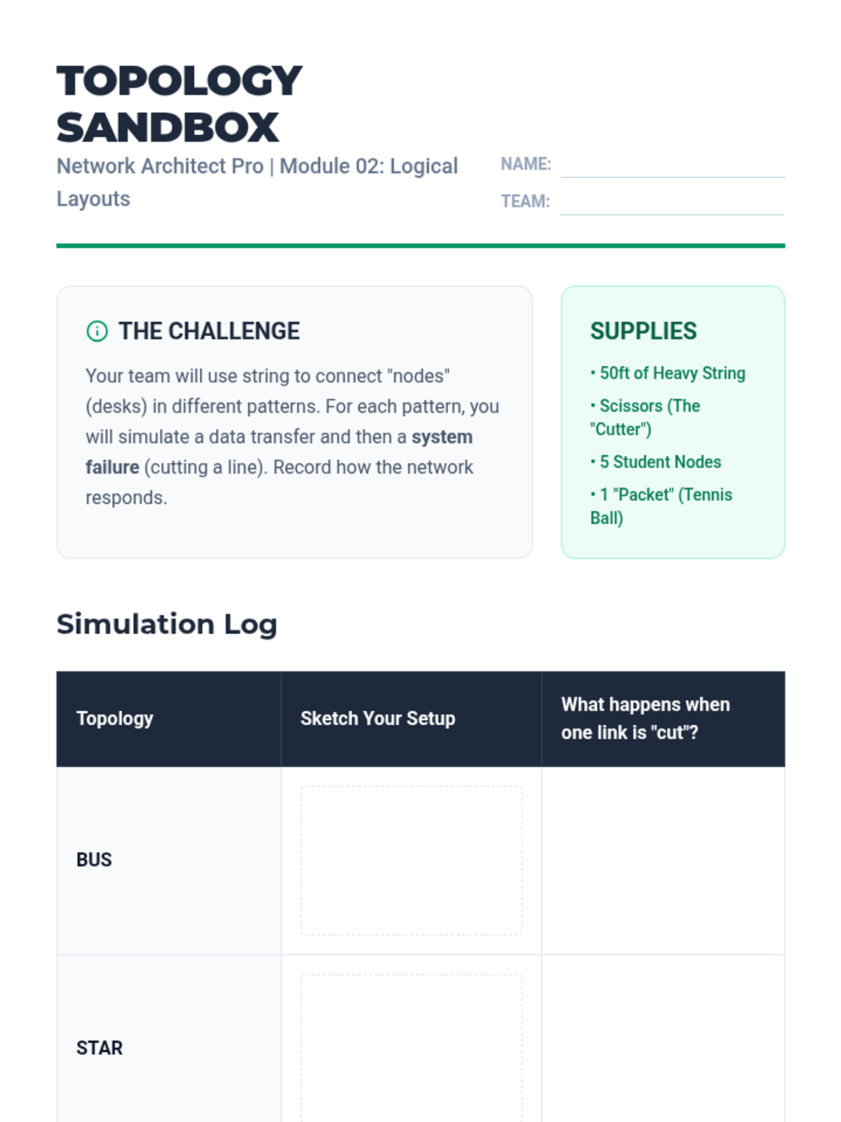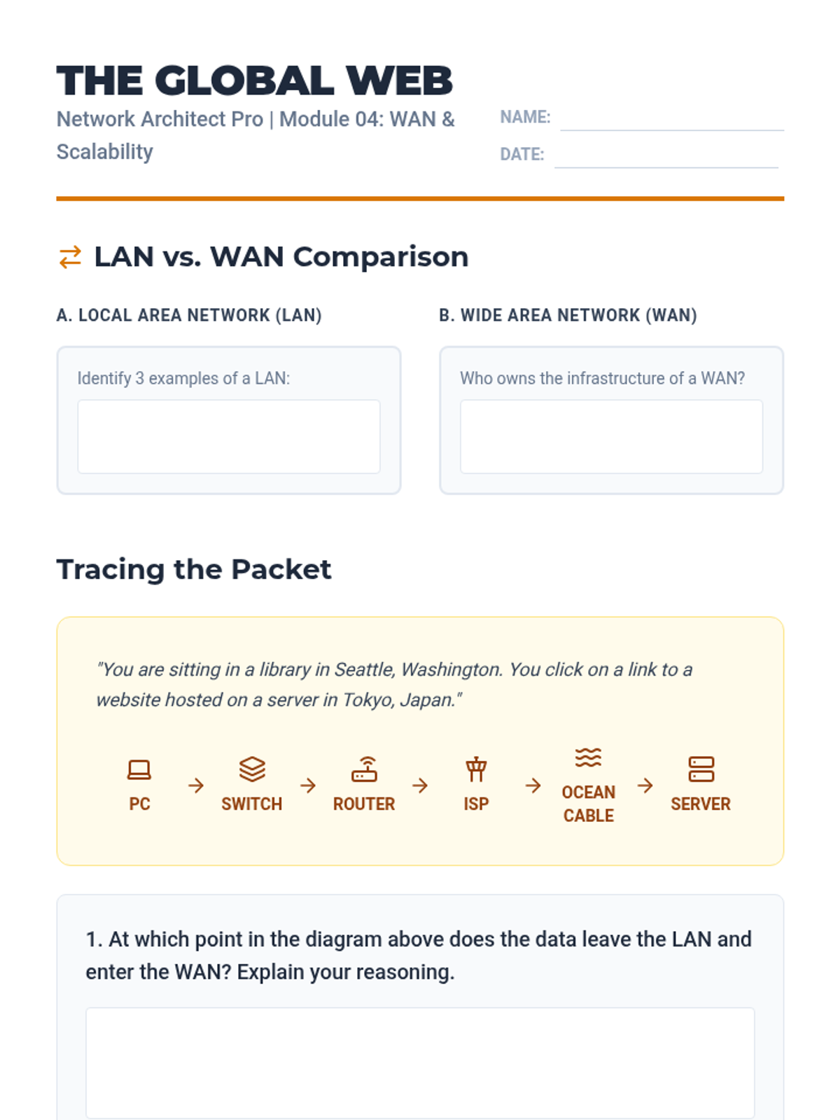 A comprehensive unit for 9th-grade students on the physical and logical structures of computer networks, covering hardware, topologies, LAN/WAN differences, and architecture design.