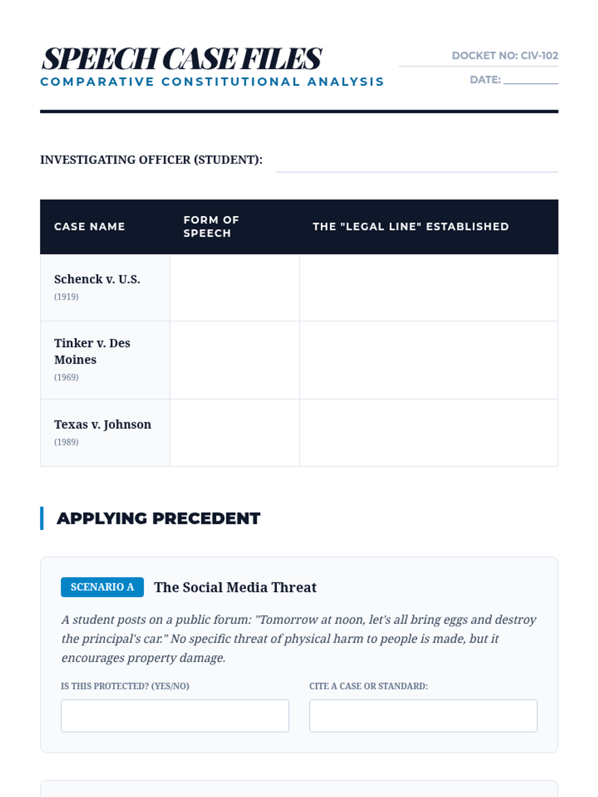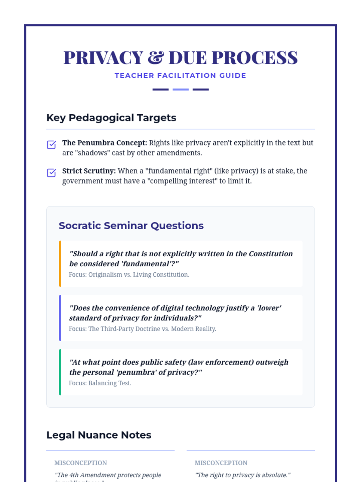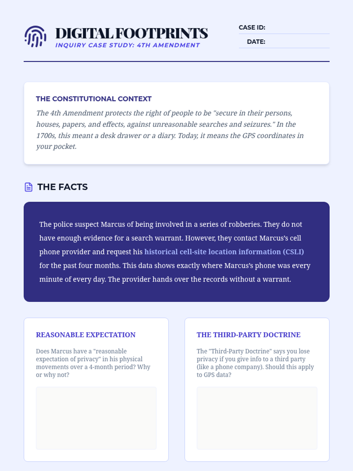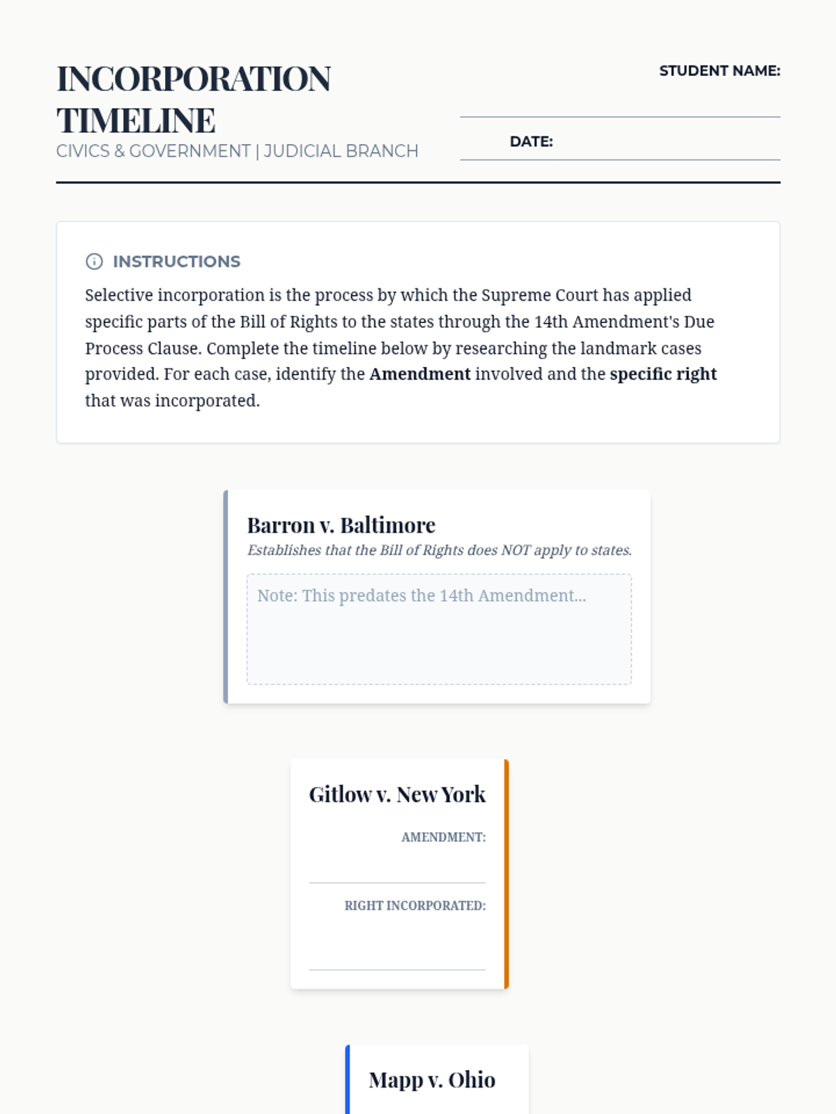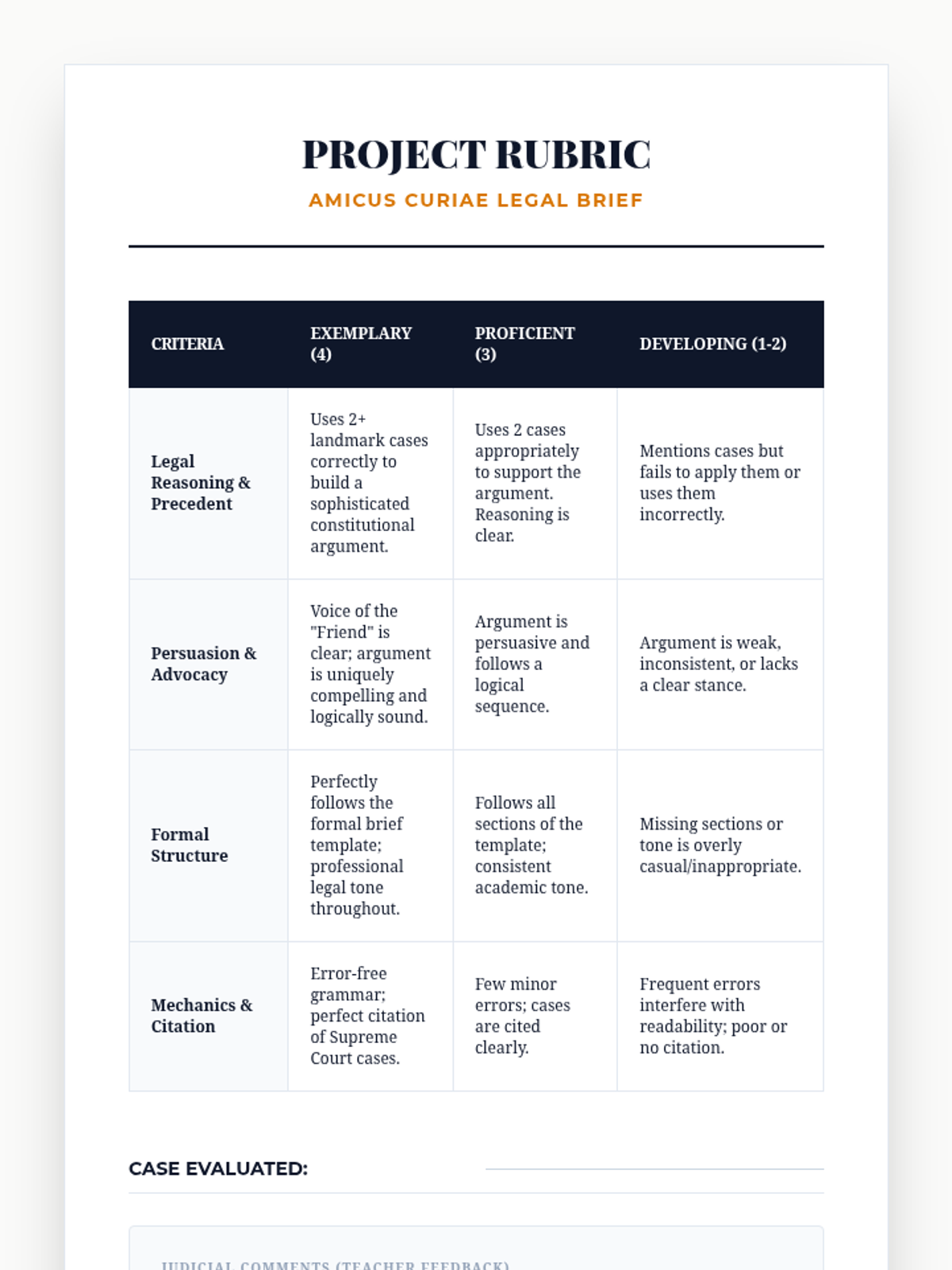 This project-based sequence analyzes how the Judicial Branch shapes society by defining and protecting civil liberties over time. Students investigate landmark cases and synthesize legal history to create a final Amicus Curiae brief on a modern controversy.