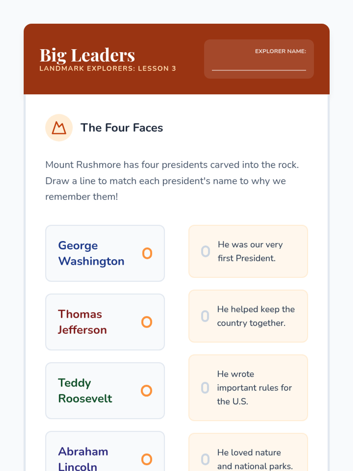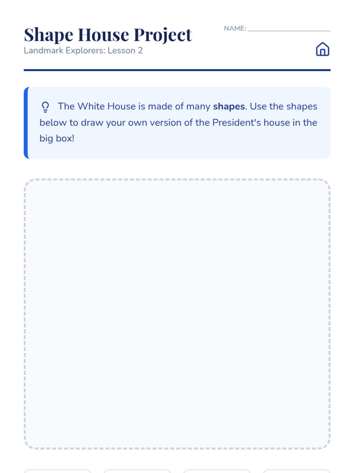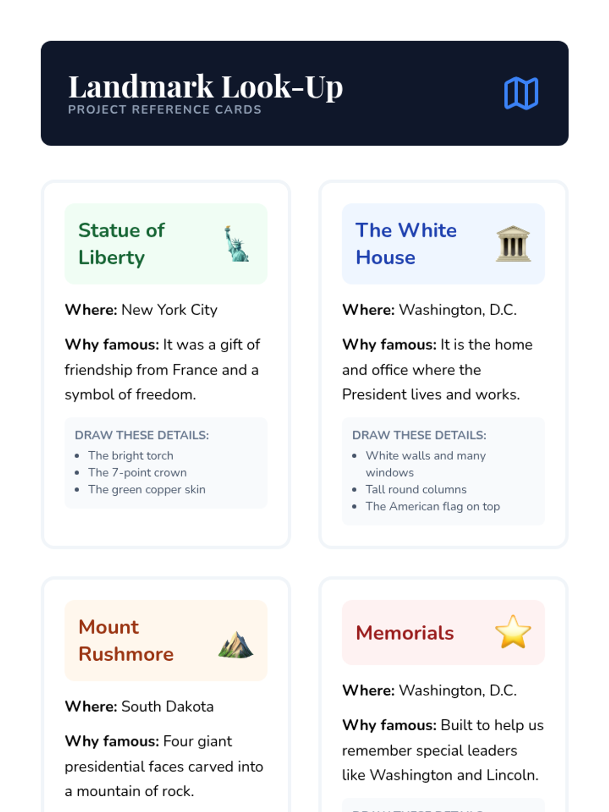 A 5-lesson unit for 1st grade exploring iconic American landmarks including the Statue of Liberty, the White House, and Mount Rushmore, focusing on their significance as national symbols.