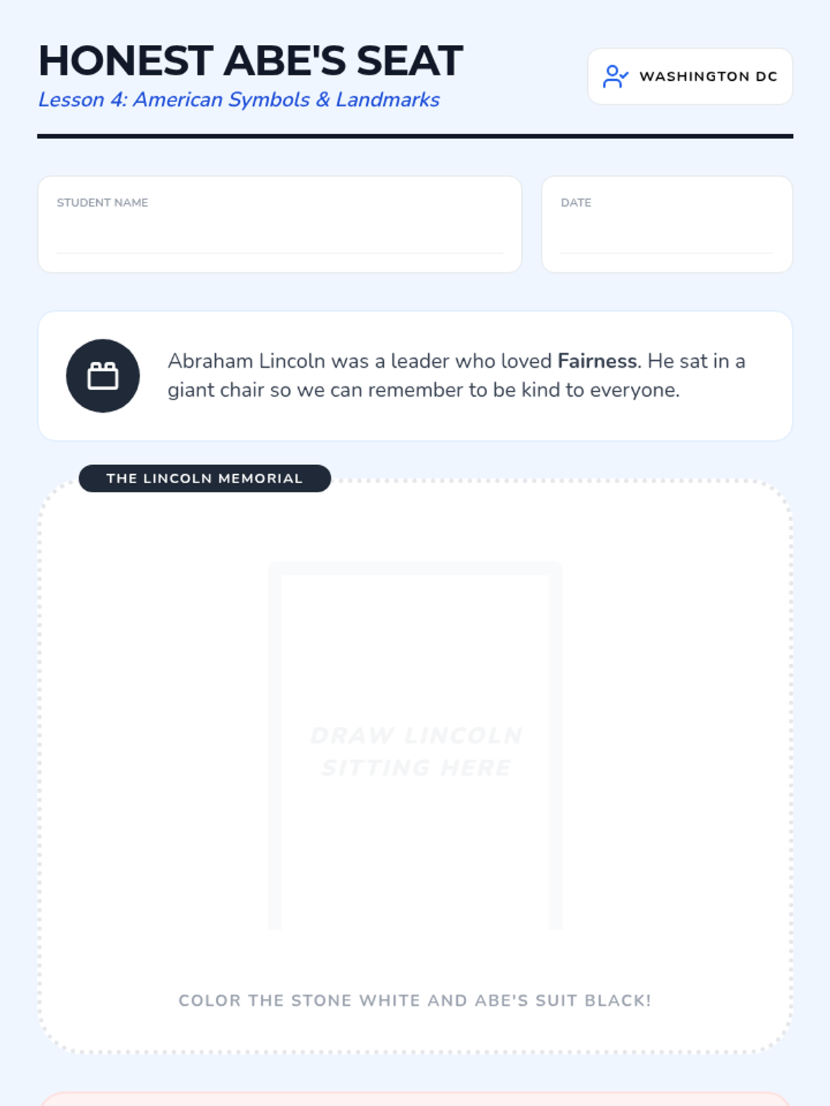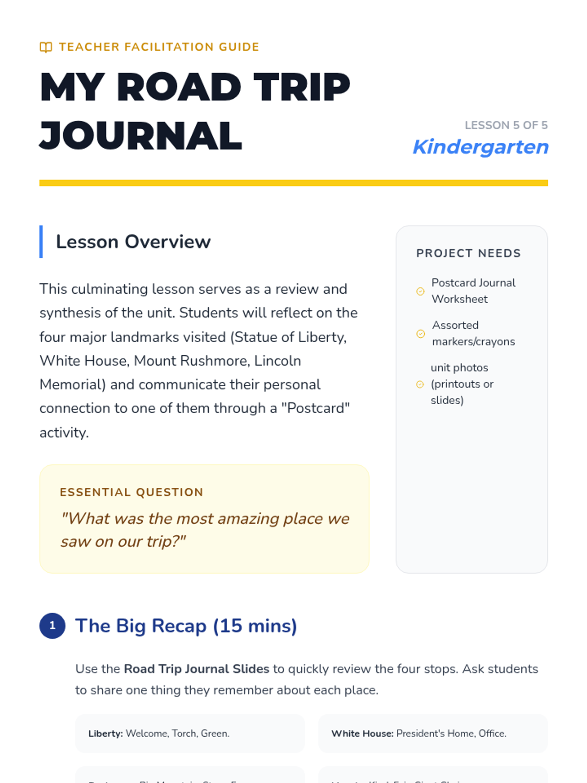 A Kindergarten geography sequence that takes students on a 'virtual road trip' to explore iconic American landmarks and monuments, focusing on themes of welcome, leadership, and national heritage.