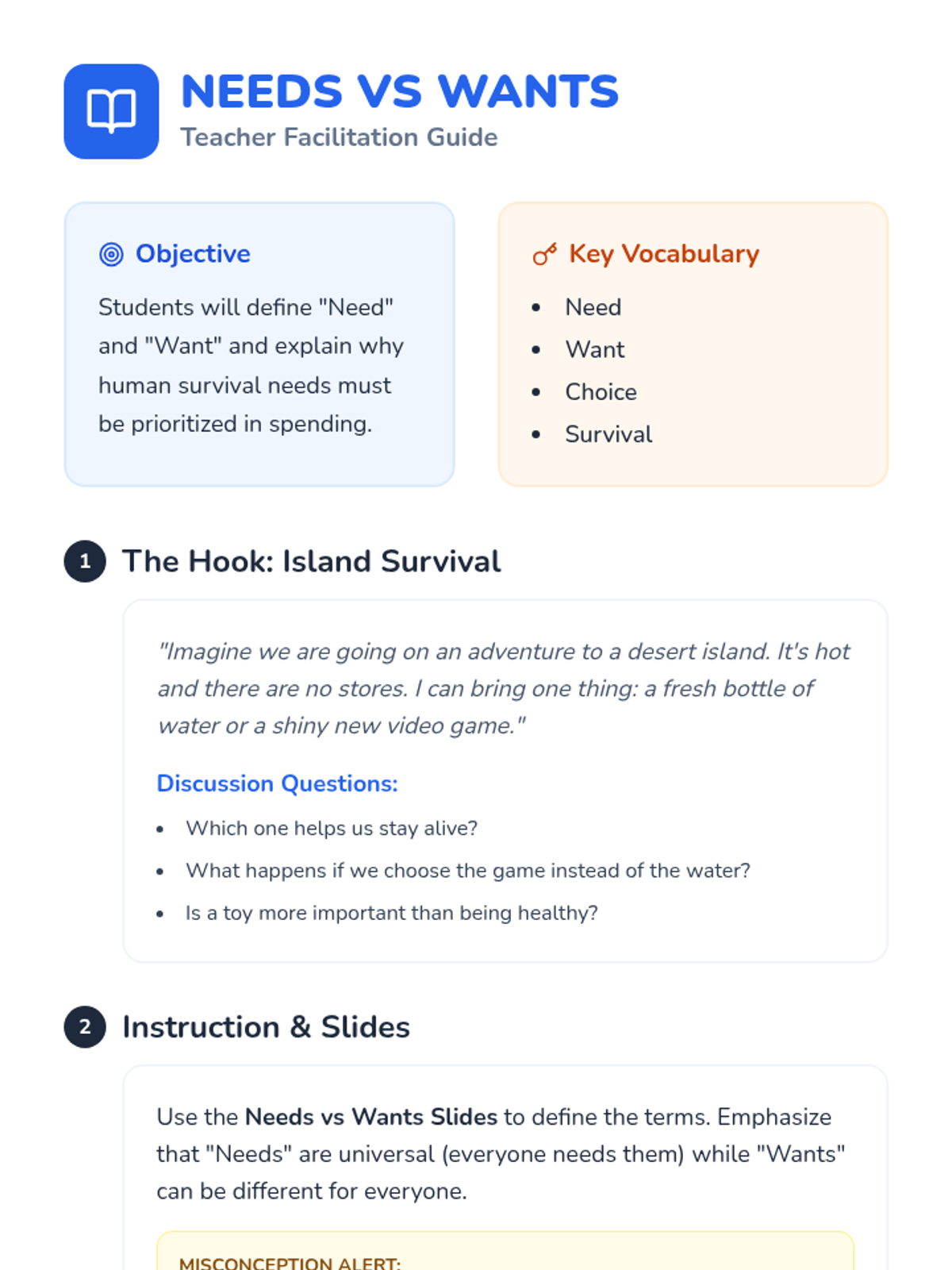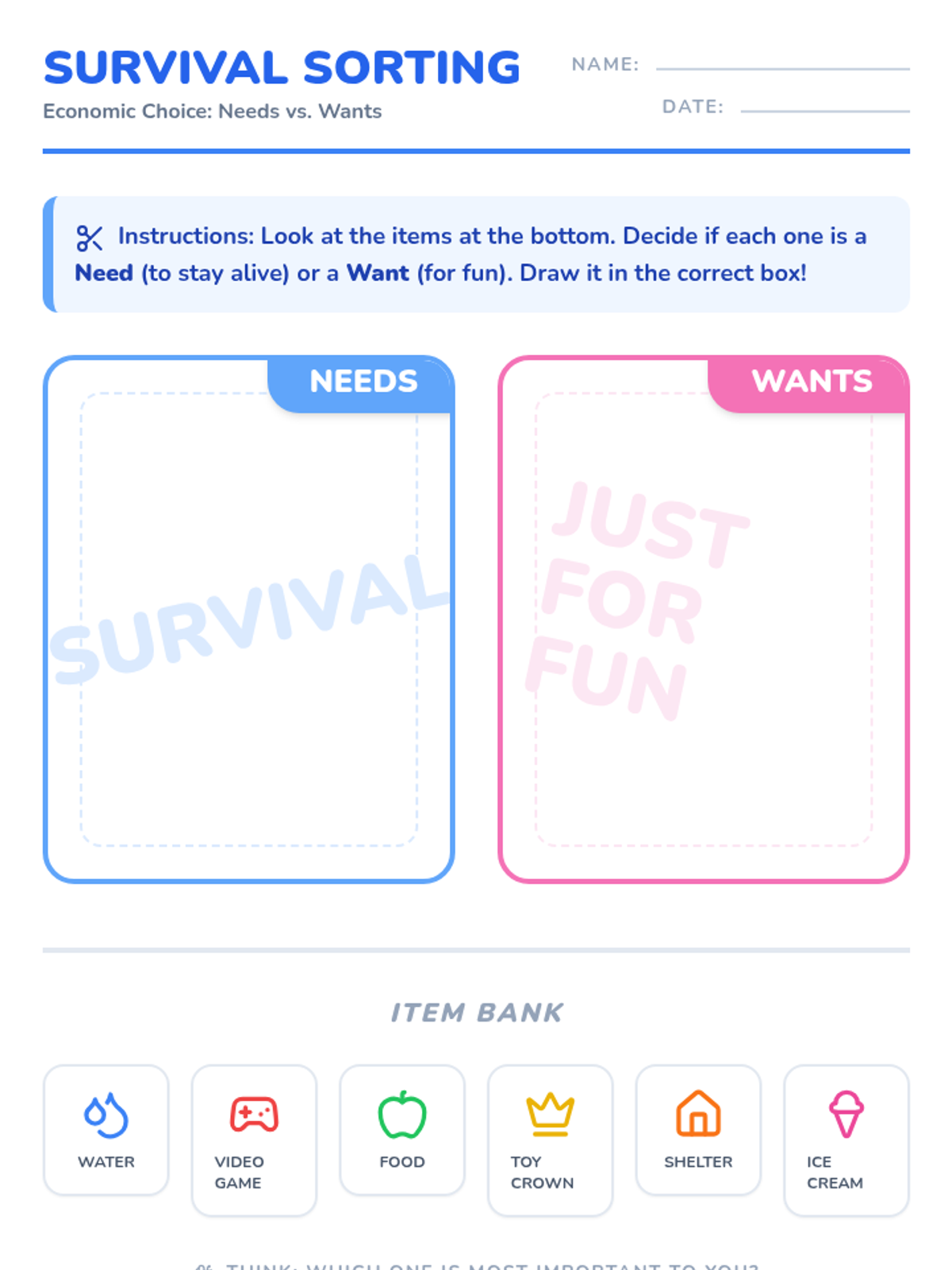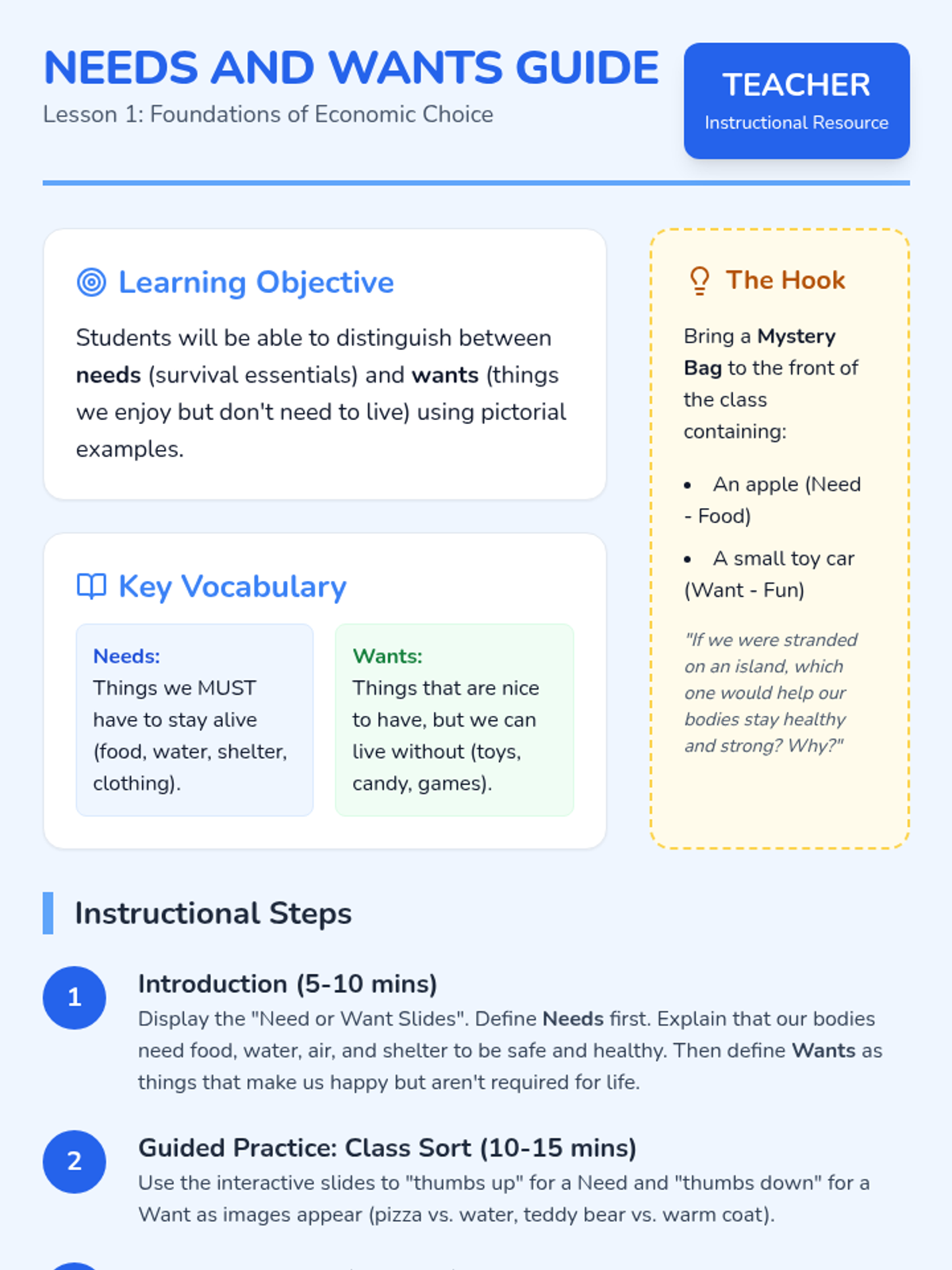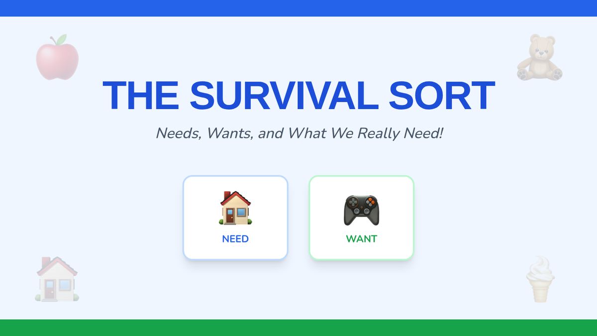 This Kindergarten sequence introduces the foundational economic concept of distinguishing between essential needs and discretionary wants through interactive discussions, sorting activities, and simple budgeting simulations. Students move from identifying survival items to making prioritized choices, building a baseline for financial literacy.