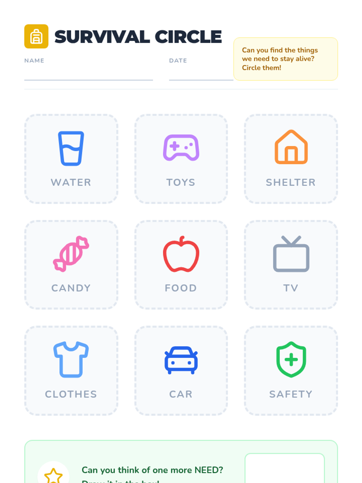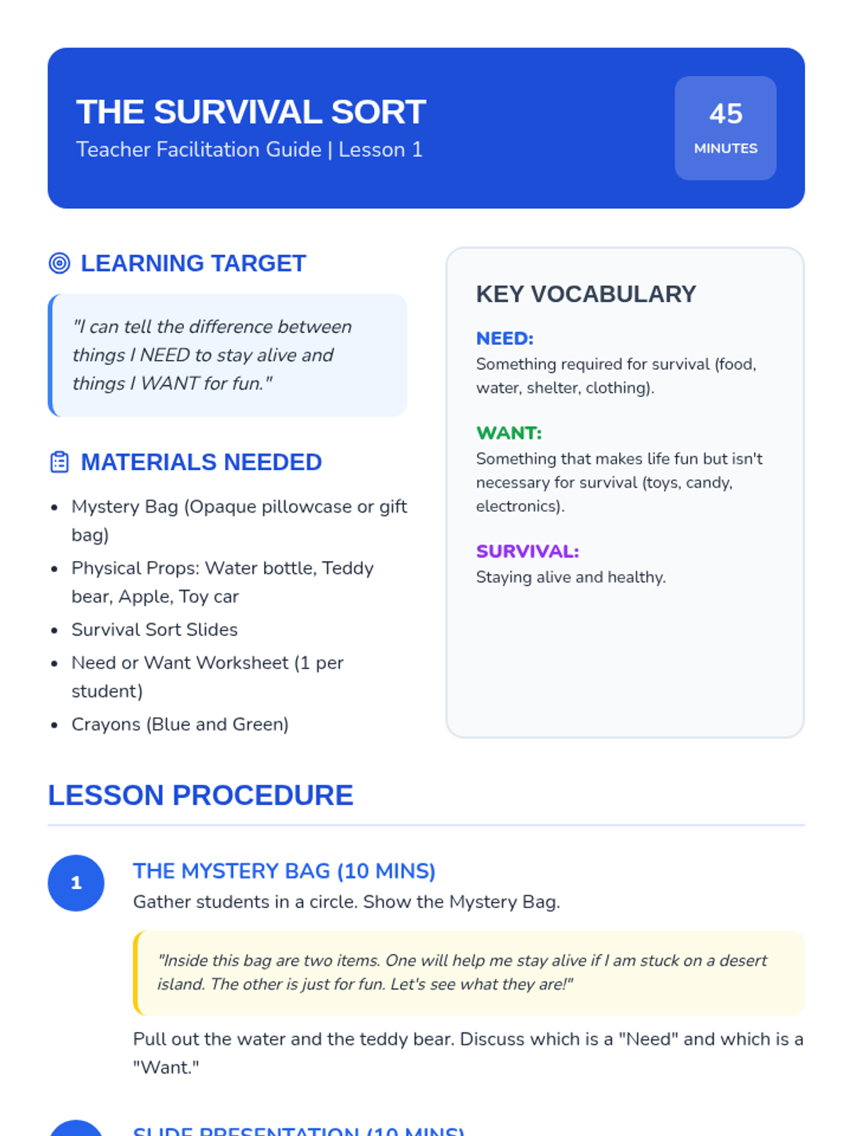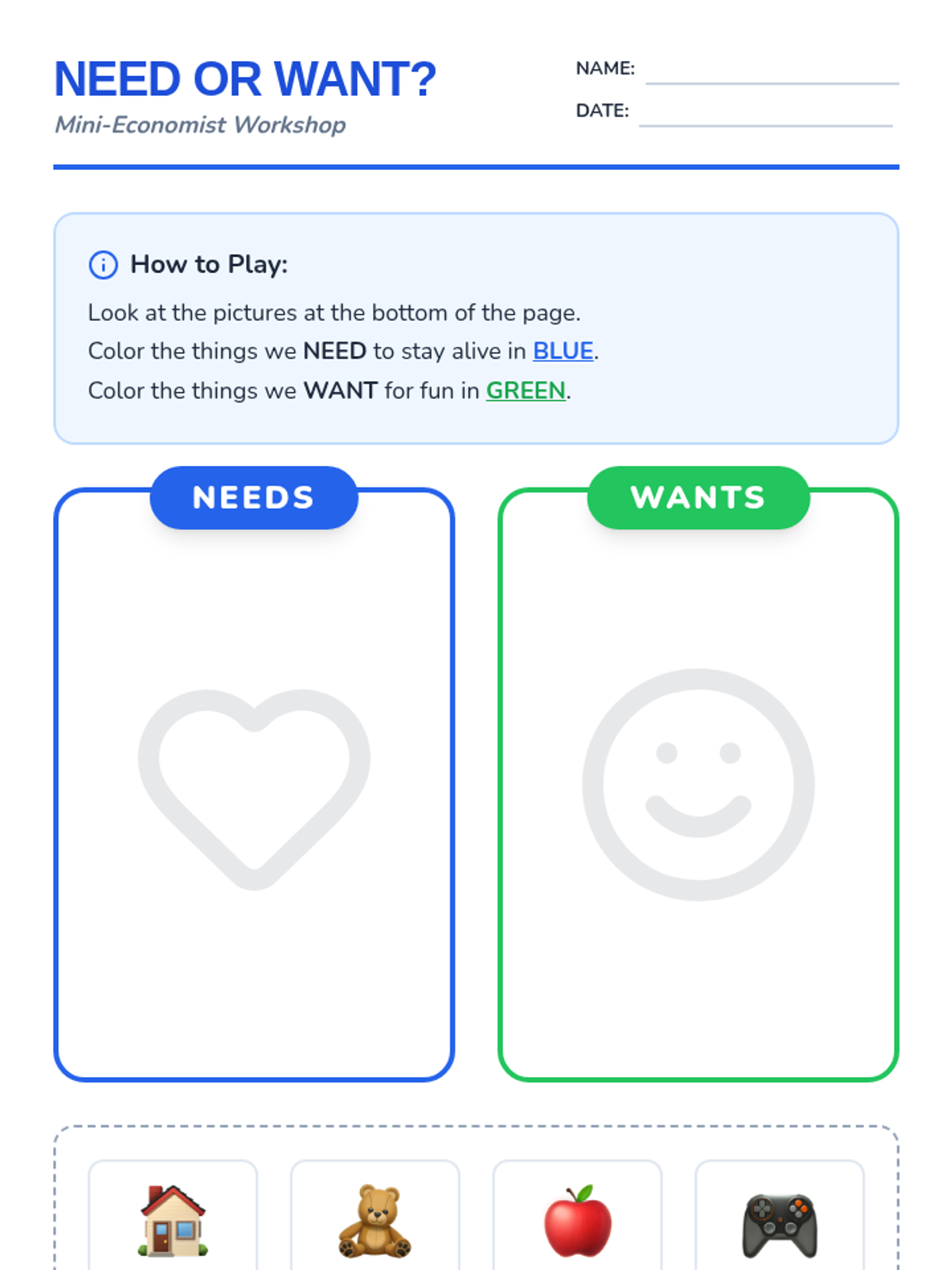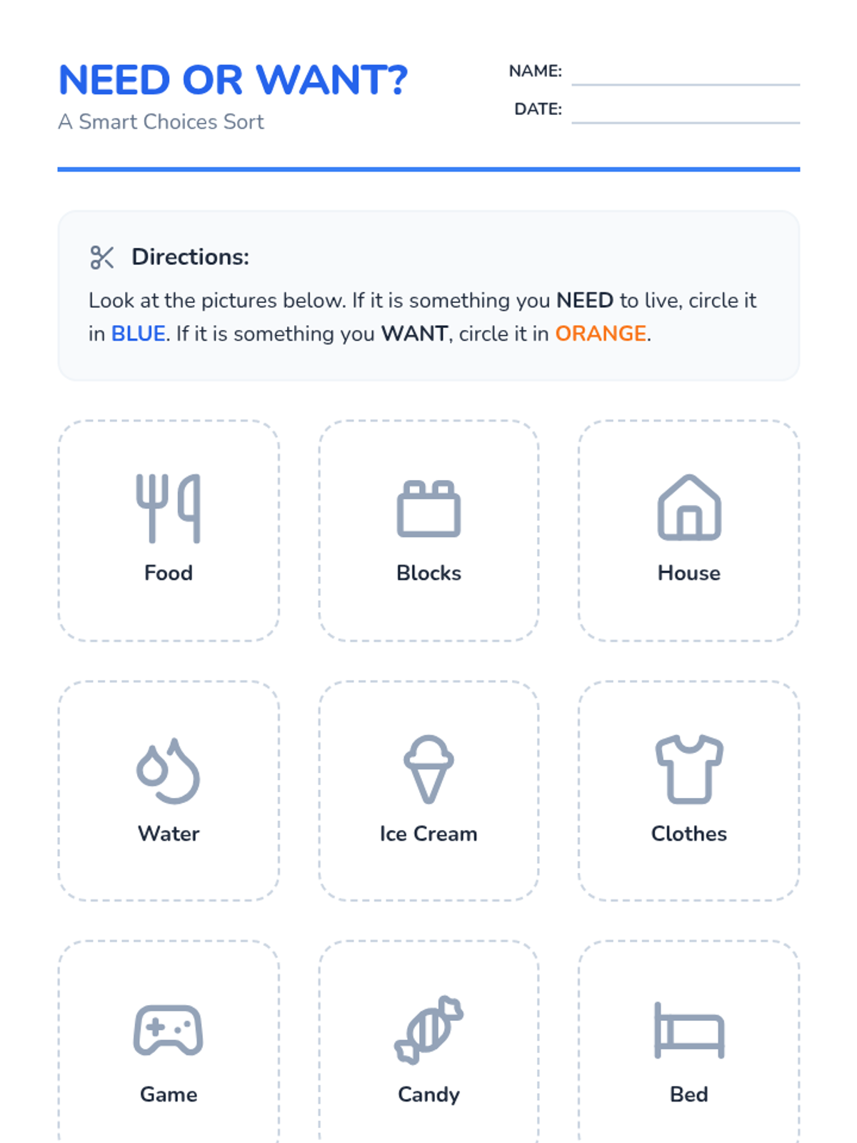 This Kindergarten sequence introduces the foundational economic concept of distinguishing between essential needs and discretionary wants through interactive discussions, sorting activities, and simple budgeting simulations. Students move from identifying survival items to making prioritized choices, building a baseline for financial literacy.
