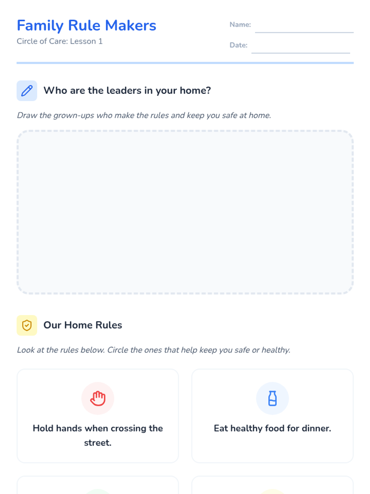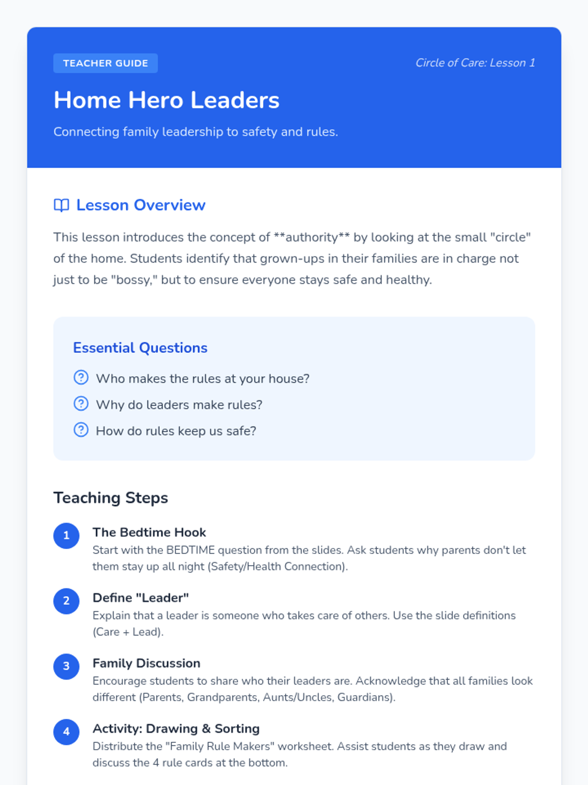 A Kindergarten civics sequence that introduces the concept of authority figures and the purpose of rules at home, in school, and in the community. Students learn why rules exist for safety and fairness, and conclude by collaboratively creating a classroom constitution.