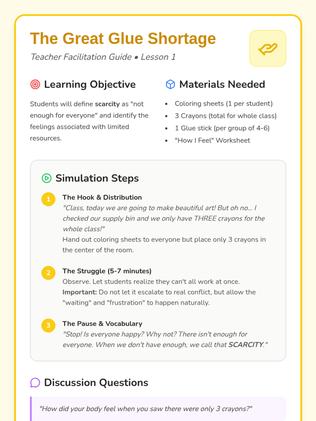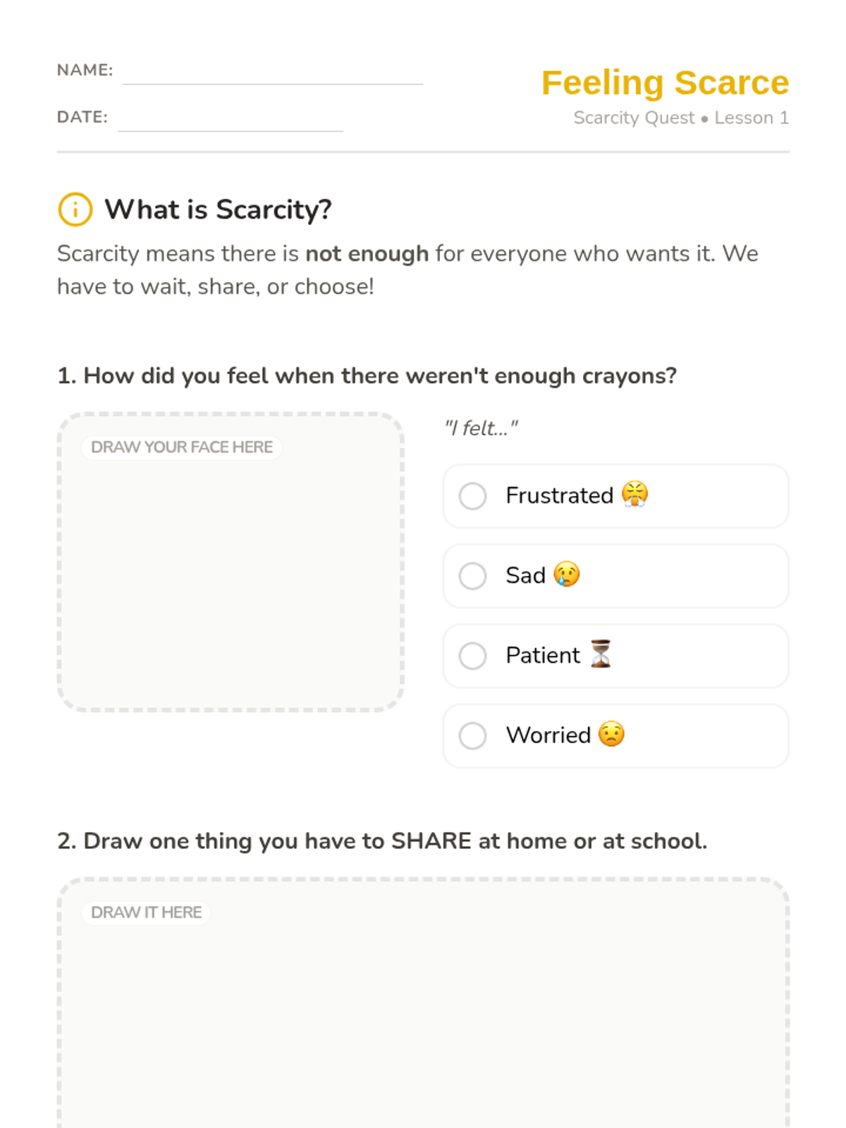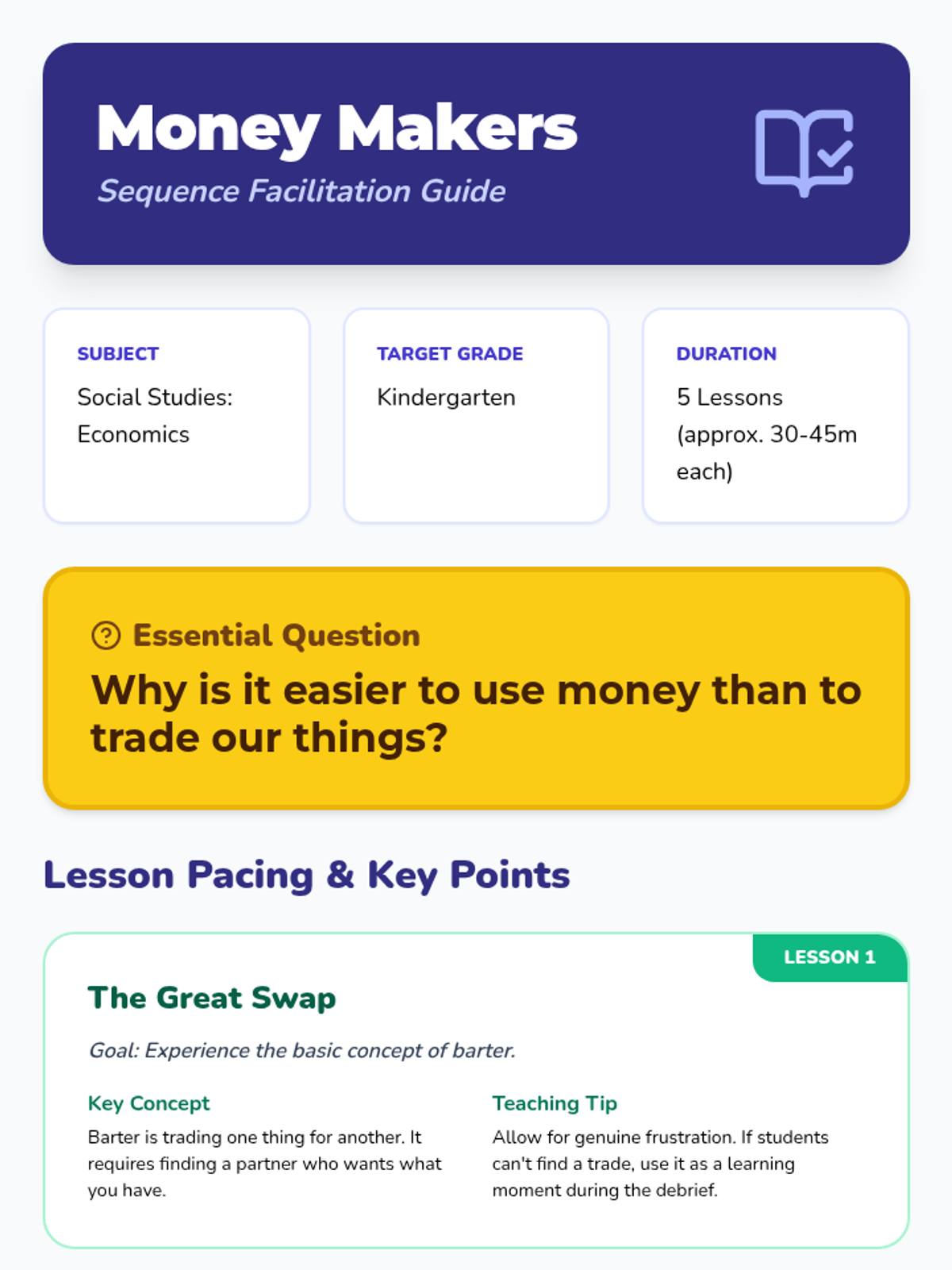 This sequence introduces Kindergarten students to foundational economic concepts through concrete experiences. Students explore the difference between needs and wants, encounter scarcity through a limited resource simulation, practice decision-making with trade-offs, and participate in a classroom market using earned tokens.