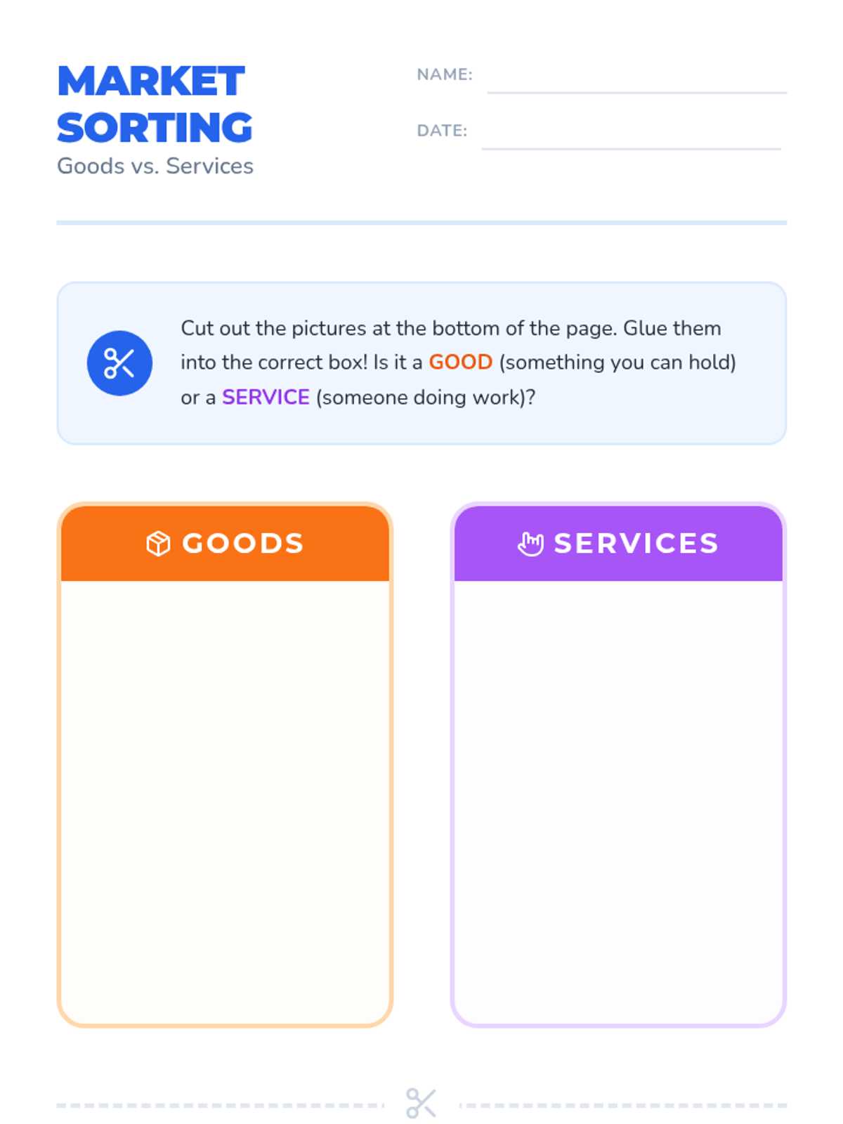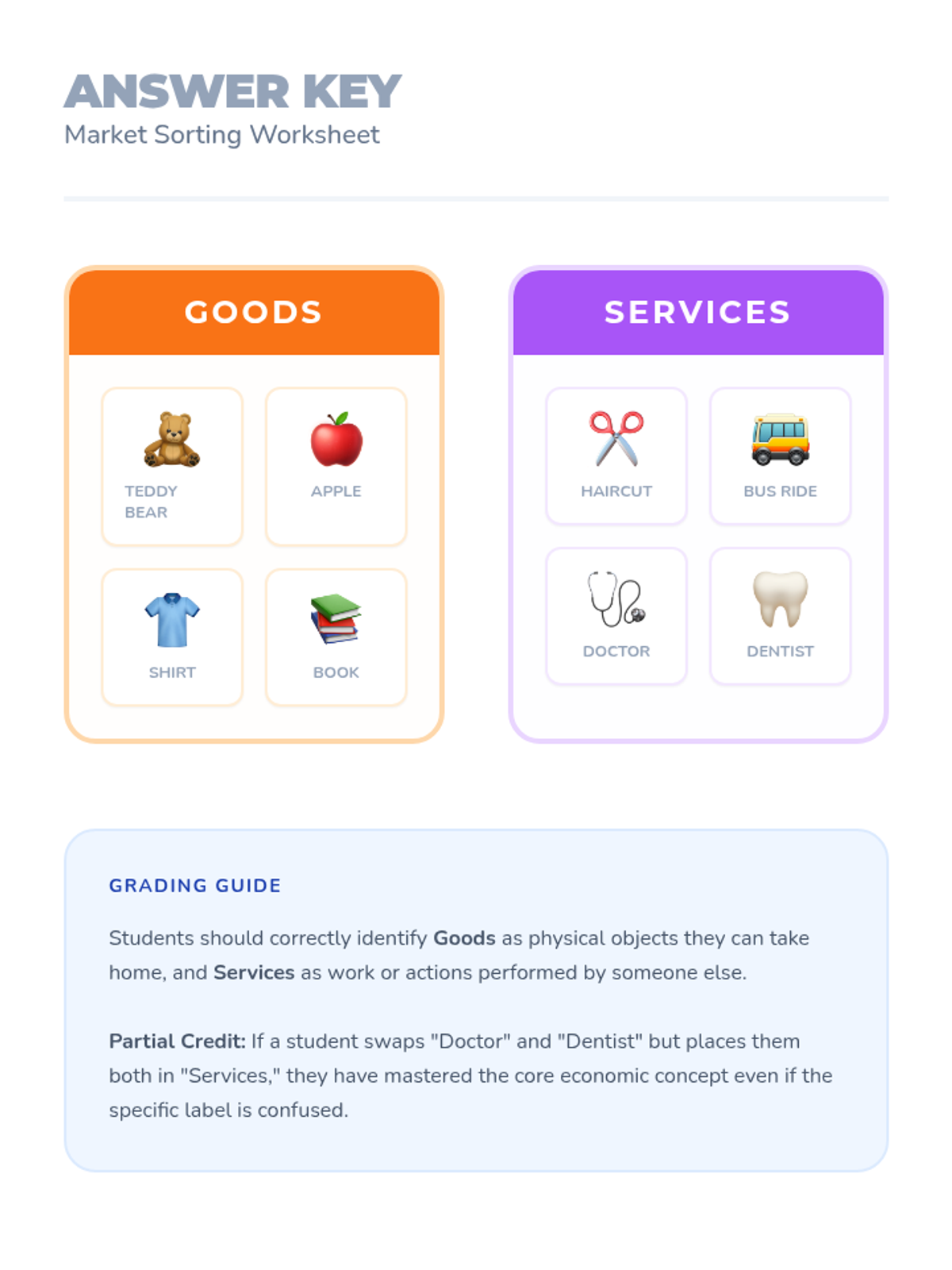 A comprehensive introduction for Kindergarteners to the basics of economy, covering the difference between goods and services, how money is earned through work, and how it is used in a marketplace.