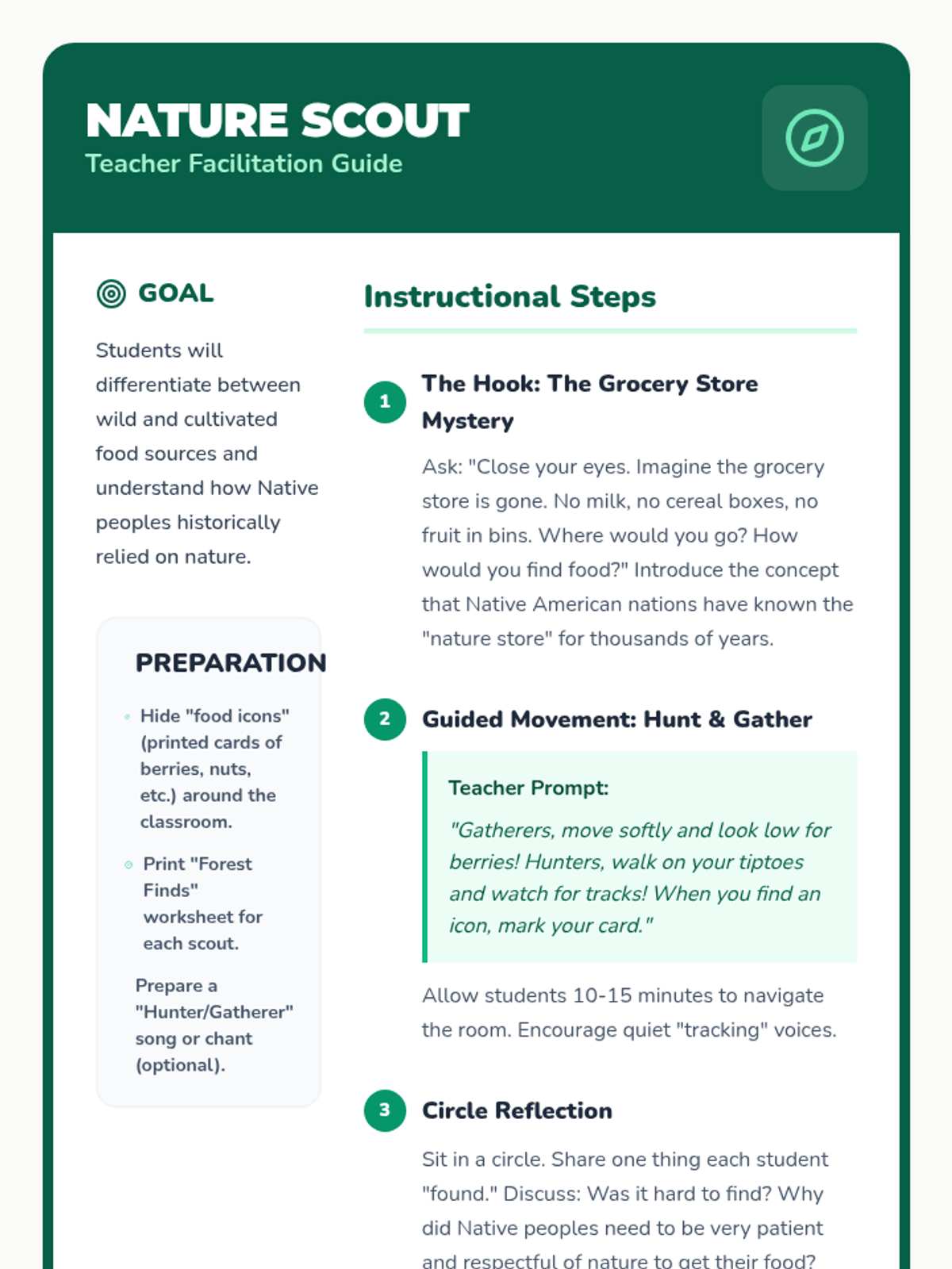 A Kindergarten sequence exploring how various Native American nations historically obtained food through hunting, gathering, and agriculture, with a focus on the Three Sisters and respect for the earth.