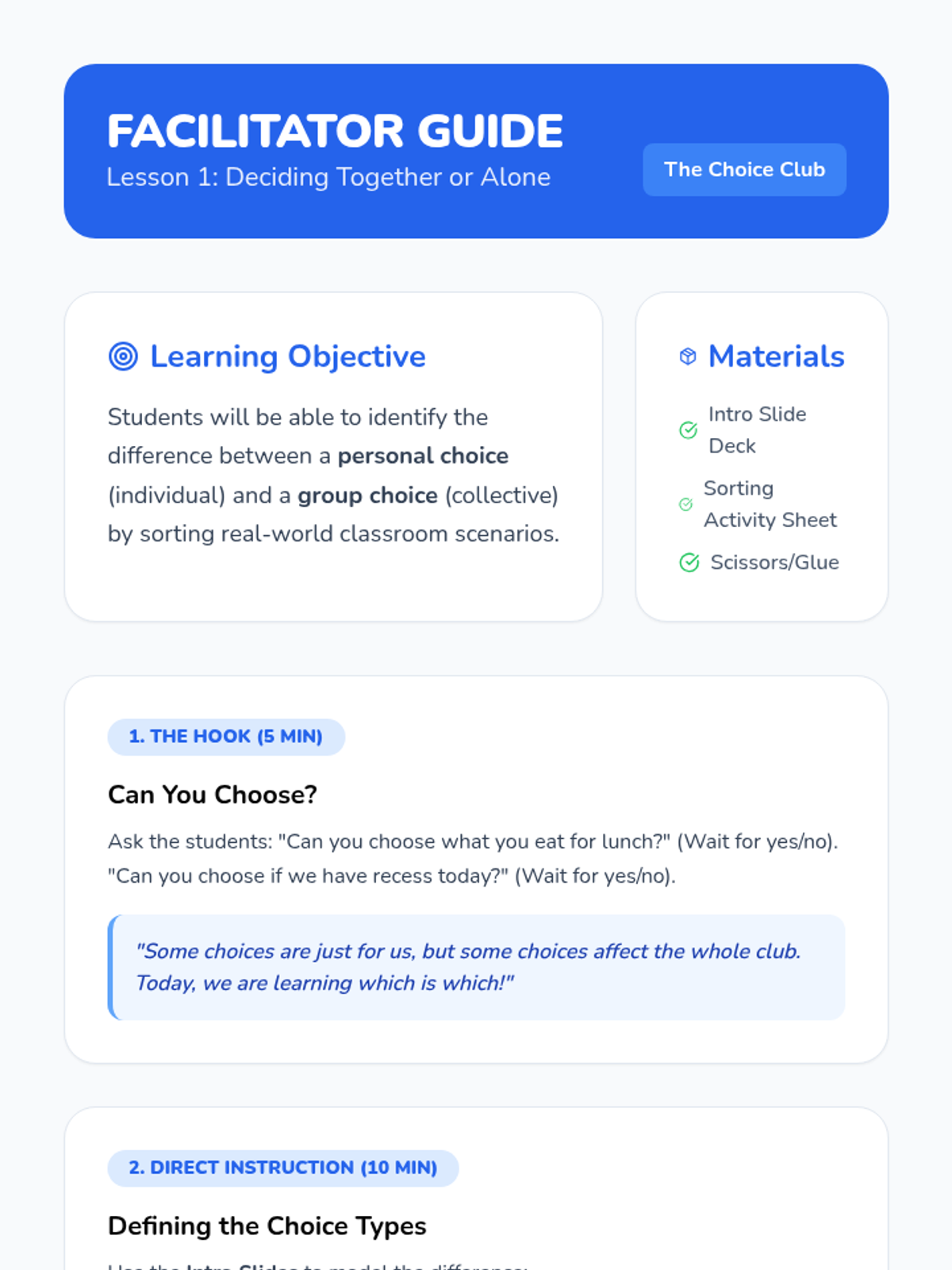 A Kindergarten sequence introducing the economic concepts of choices and opportunity cost. Students learn that choosing one thing means giving up another through games, stories, and reflection.