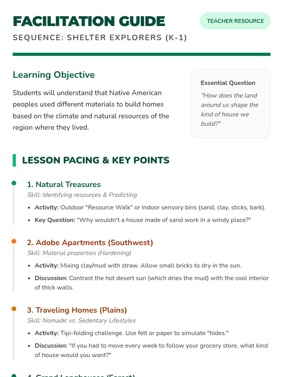 Students explore how geography and natural resources influenced the traditional homes of Native American peoples across North America. The sequence focuses on observation, material properties, and the relationship between environment and human adaptation.