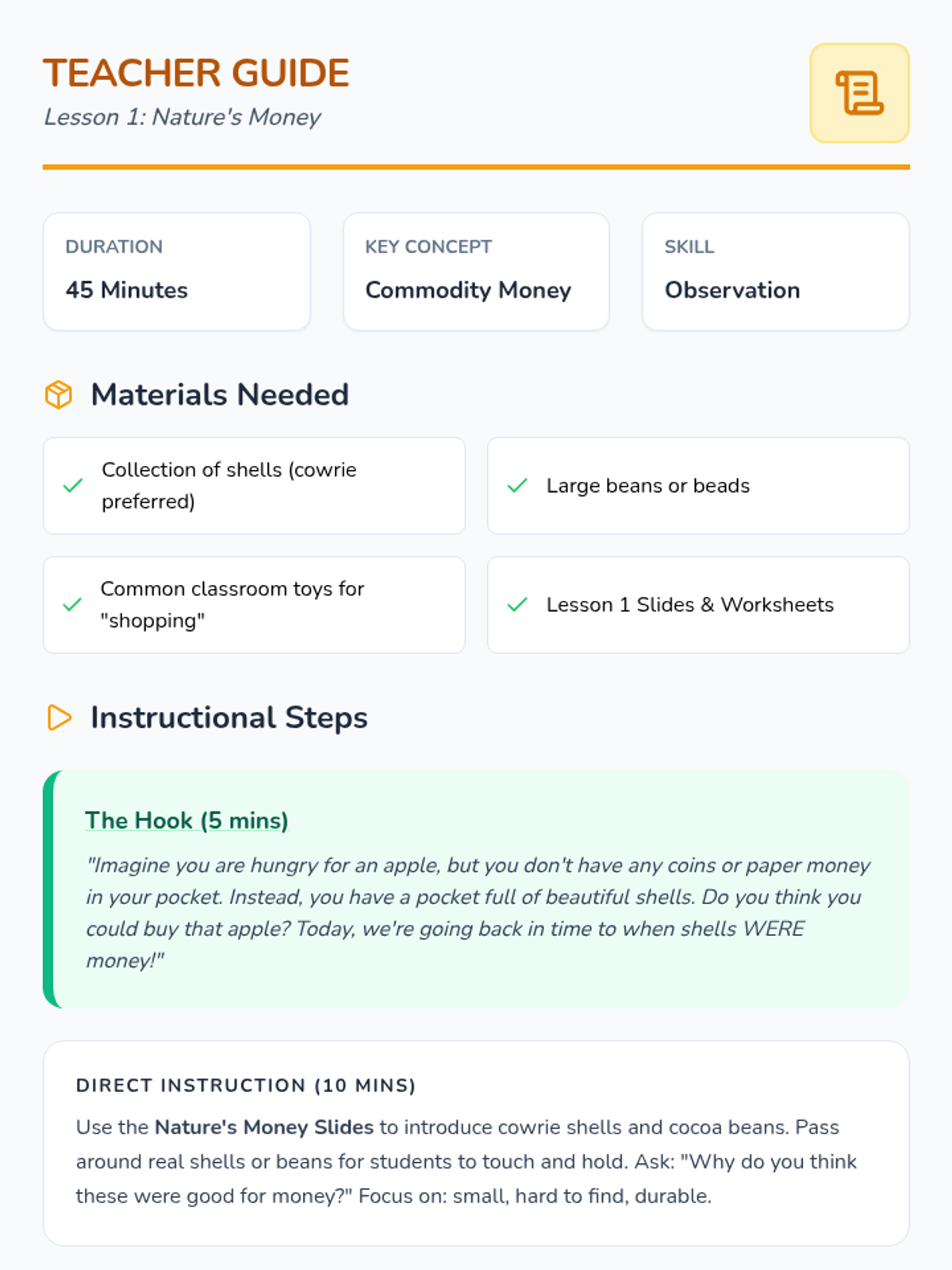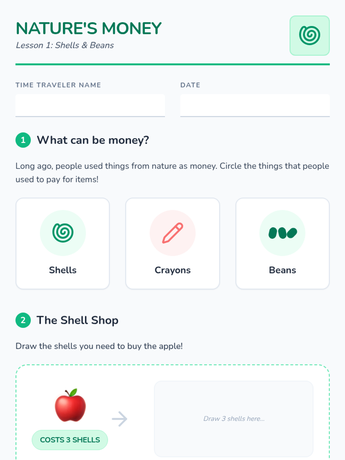 A Kindergarten sequence exploring the evolution of money from natural objects (shells and beans) to physical currency (metal and paper), global variations, digital forms (cards and taps), and future inventions. Students learn that money is a tool for exchange that has changed over time.
