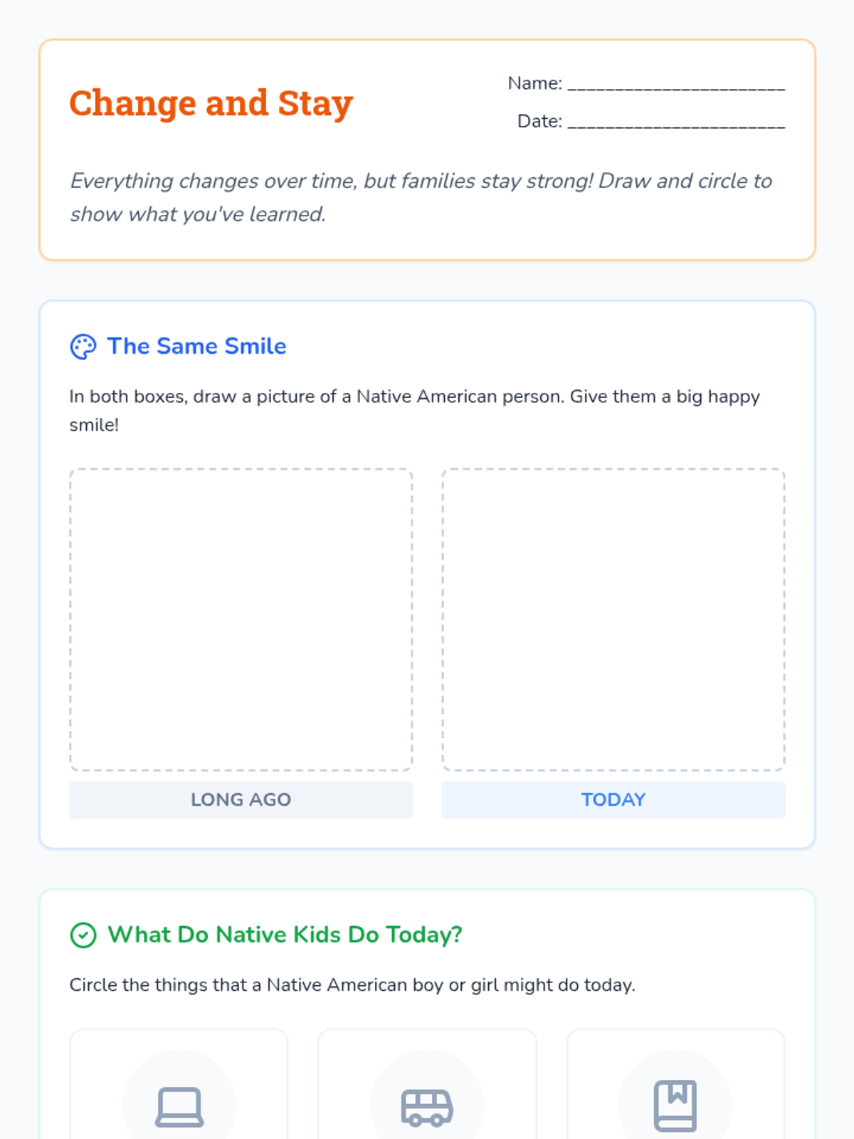 A Kindergarten sequence focused on connecting historical Native American cultures to modern life, debunking misconceptions, and highlighting cultural continuity through family, school, and community values.