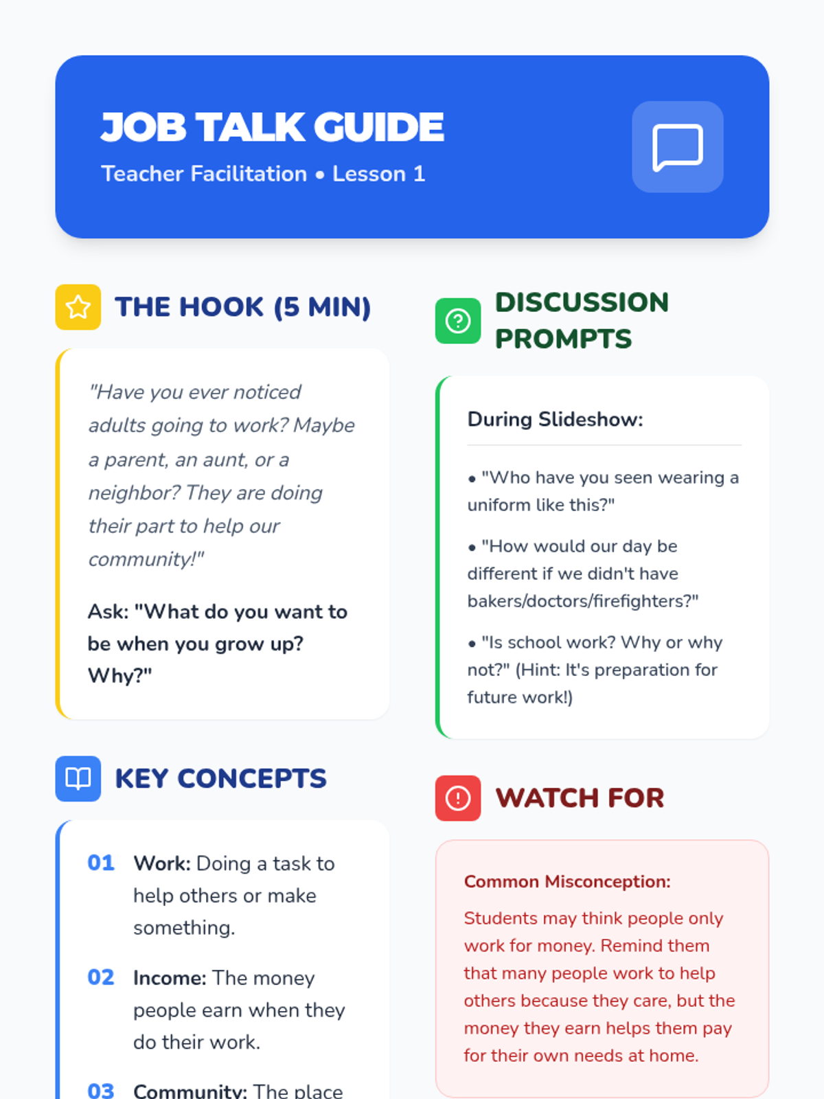 A Pre-K ELA sequence focused on reading comprehension through informational texts about community helpers. Students explore the roles, tools, and processes of firefighters, doctors, mail carriers, and builders through interactive read-alongs and role-play.