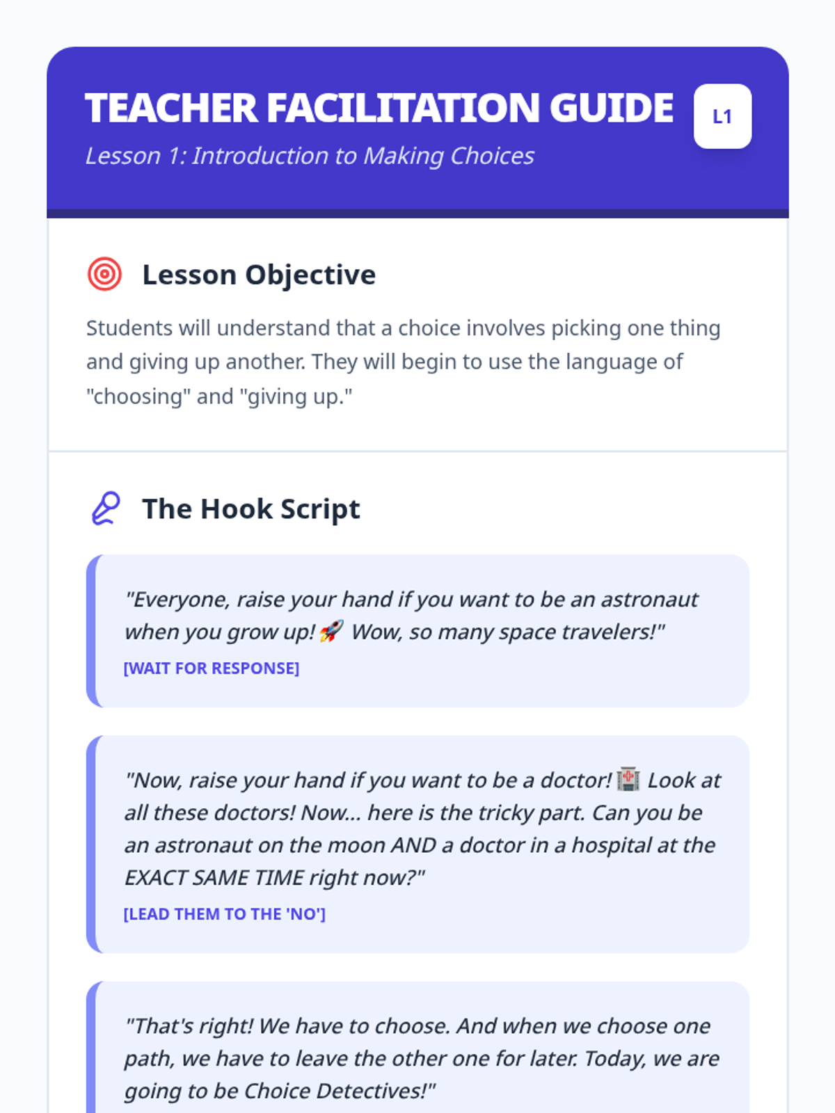 A foundational sequence for Kindergarten students exploring needs versus wants, scarcity, and decision-making through interactive games and hands-on simulations. Students learn that resources are limited and making a choice involves giving something else up, building early financial literacy.