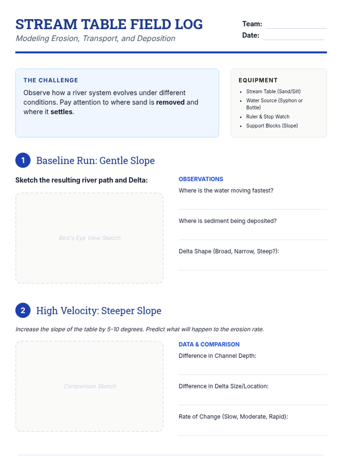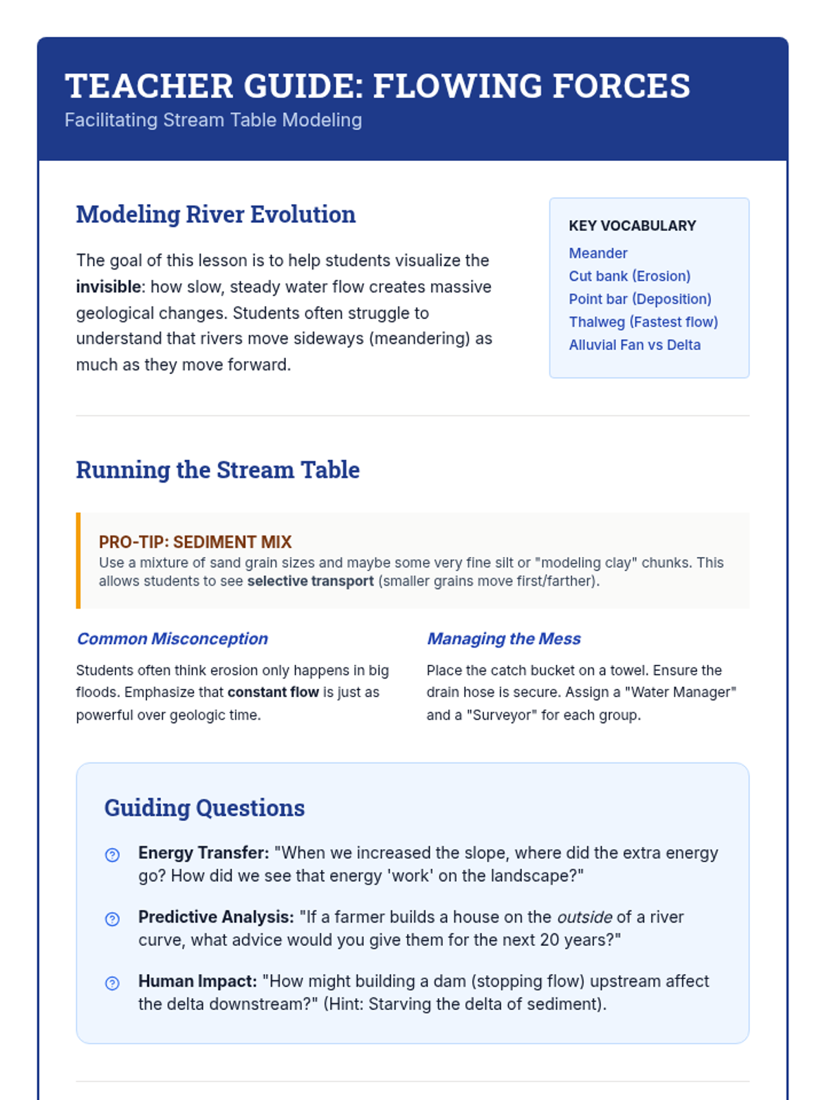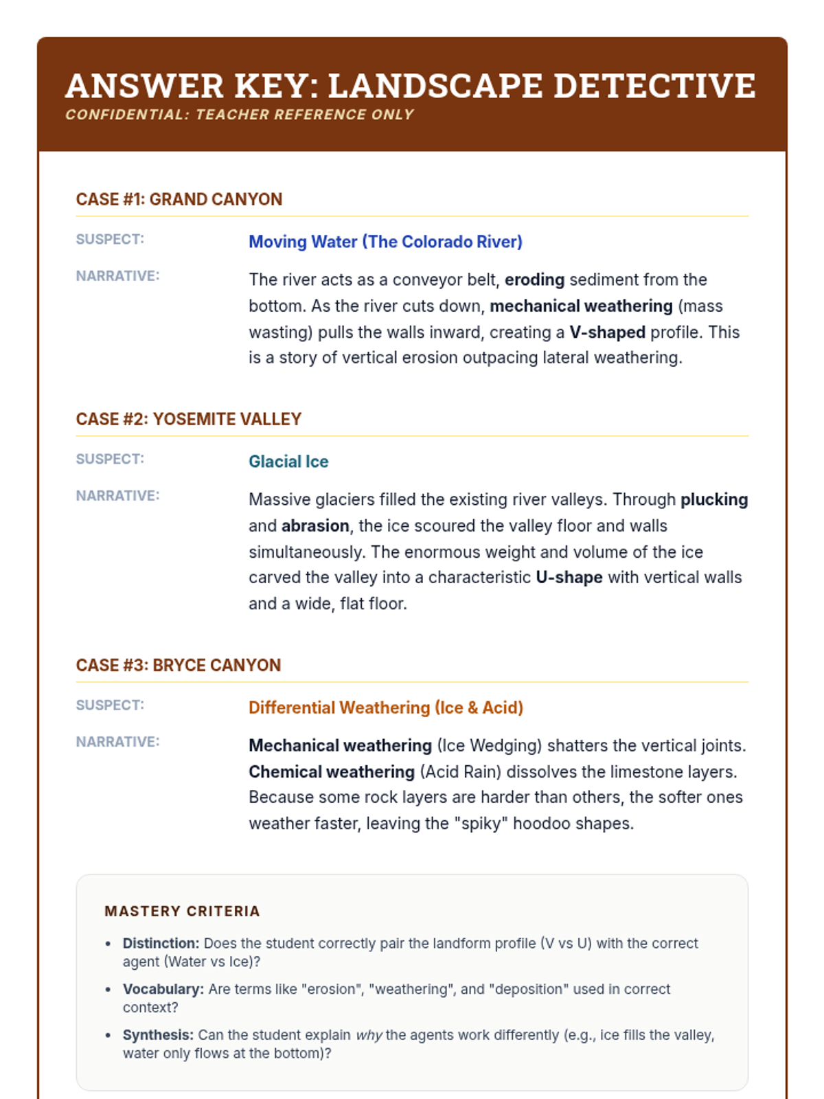 This unit explores the slow but relentless forces that wear down Earth's surface: weathering, erosion, and deposition. Students will investigate chemical and mechanical weathering, model river dynamics with stream tables, explore glacial impacts, analyze soil profiles, and synthesize their learning by interpreting real-world landforms.