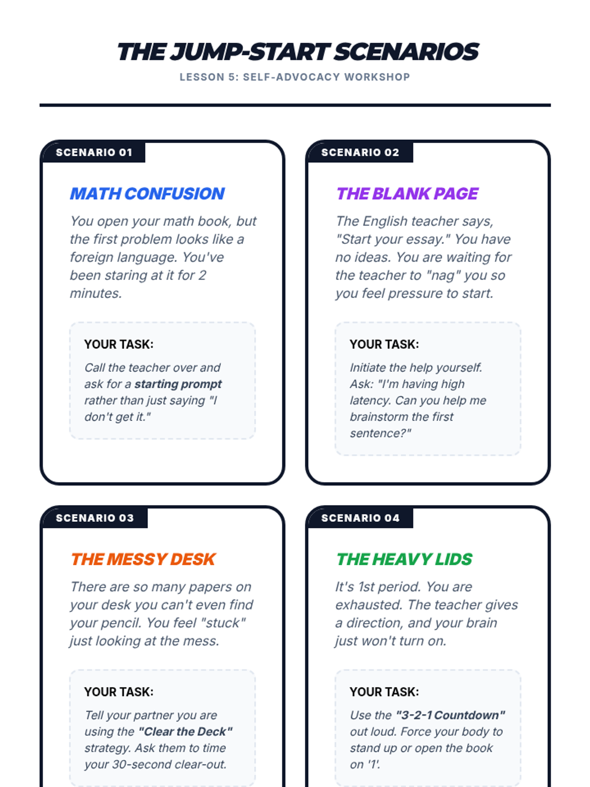 A mastery-based sequence for 9th-grade students focused on reducing task latency through self-monitoring, data tracking, and goal setting. Students learn to frame task initiation as a scientific challenge rather than a behavioral one, empowering them to become independent 'Start Scientists'.