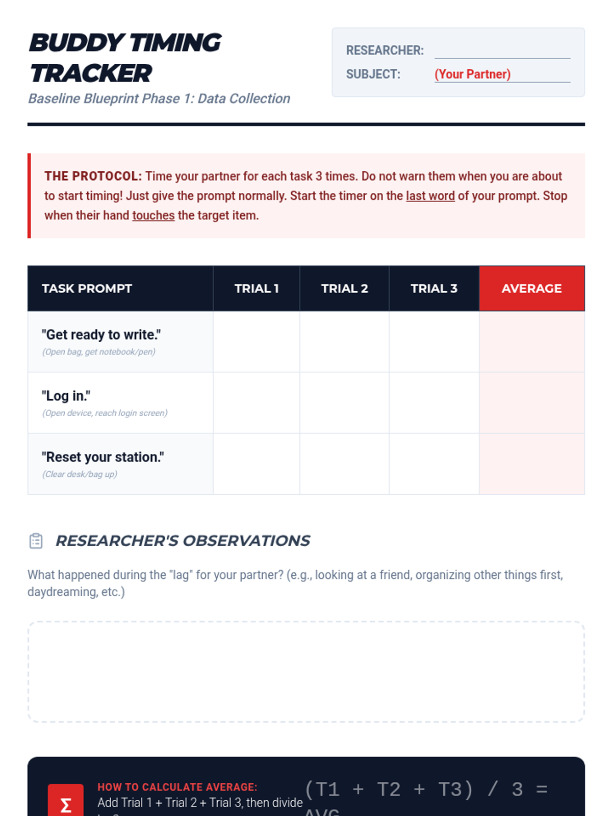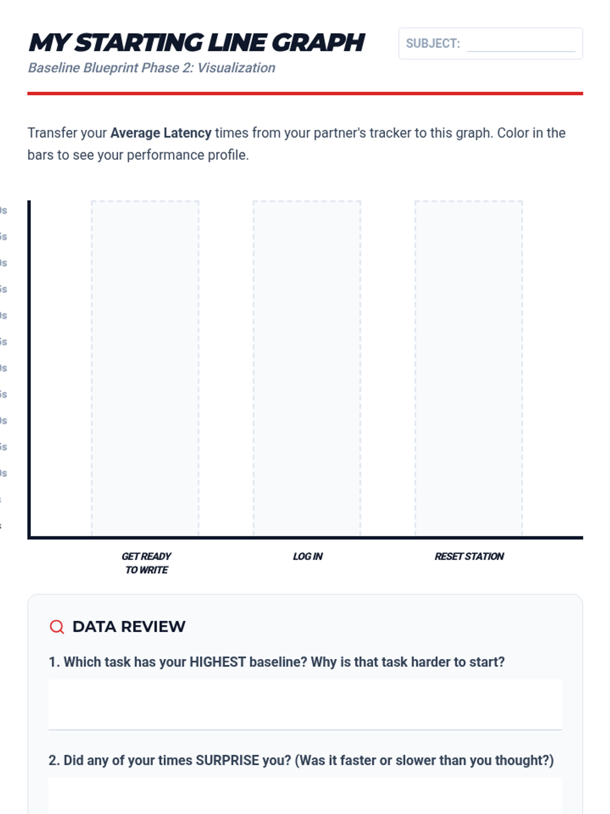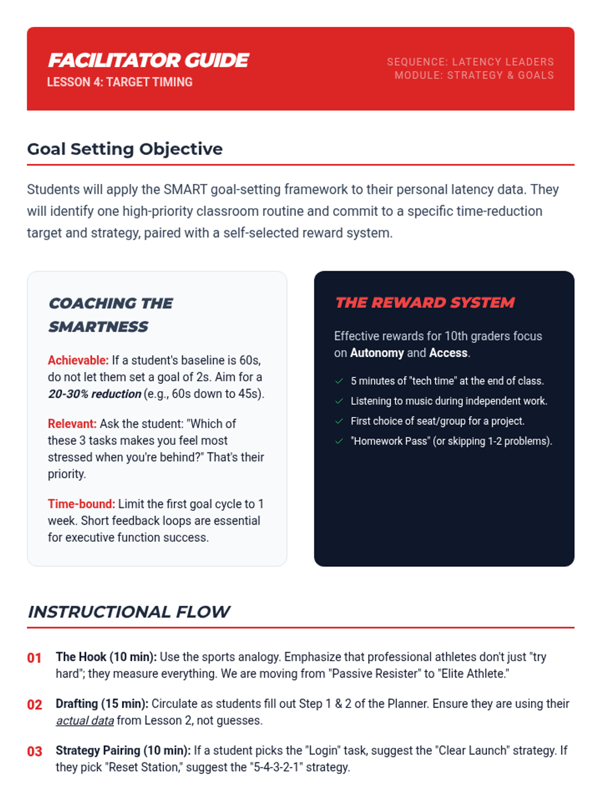 A data-driven executive function sequence where students learn to measure, monitor, and reduce 'latency' (the time between a request and action) using timers and cognitive strategies. Students move from passive resistance to active self-regulation by turning task initiation into a personal performance challenge.