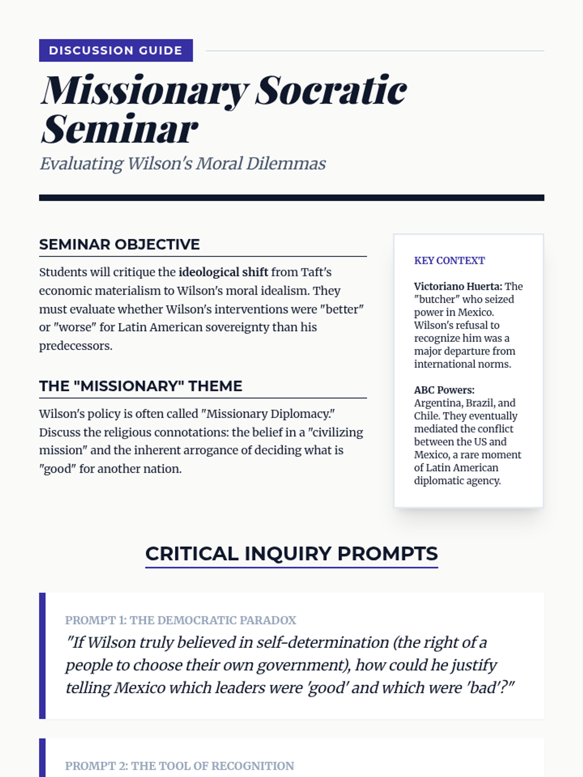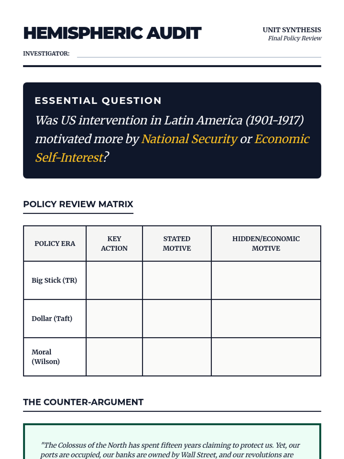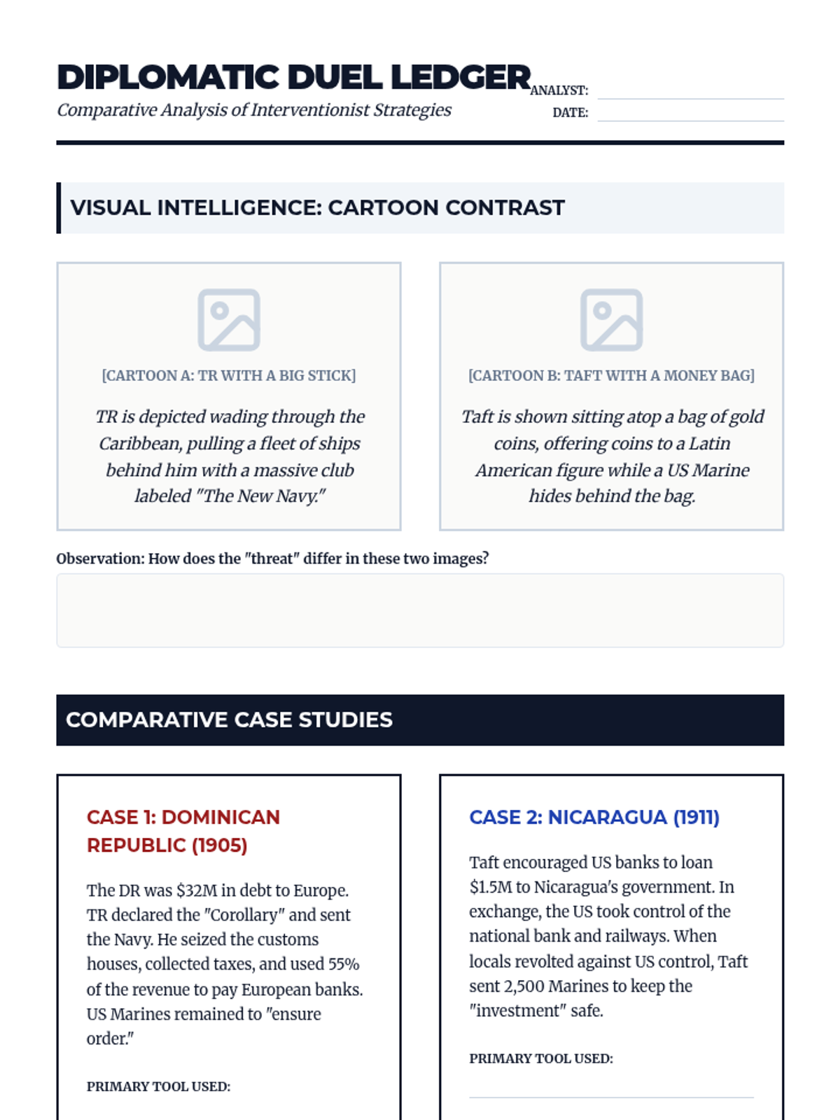 A 12th-grade history sequence exploring the shift in US foreign policy in Latin America from the Panama Canal to Wilson's Moral Diplomacy. Students use simulations, primary source analysis, and comparative studies to evaluate the motivations and impacts of interventionism.