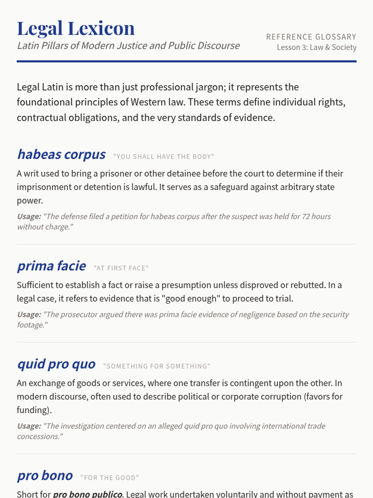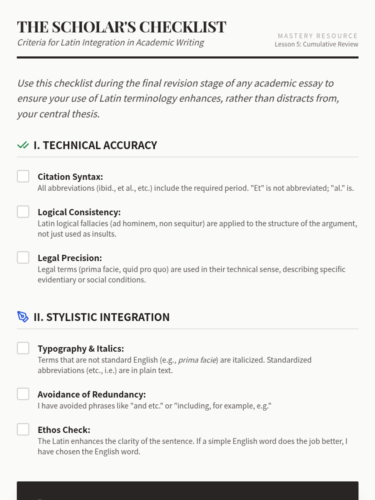 This sequence immerses undergraduate students in the specific lexicon of Latin terminology frequently encountered in academic research, legal documents, and formal logic. Students progress from scholarly abbreviations to complex phrases used in argumentation and legal theory, emphasizing contextual application to enhance academic precision.