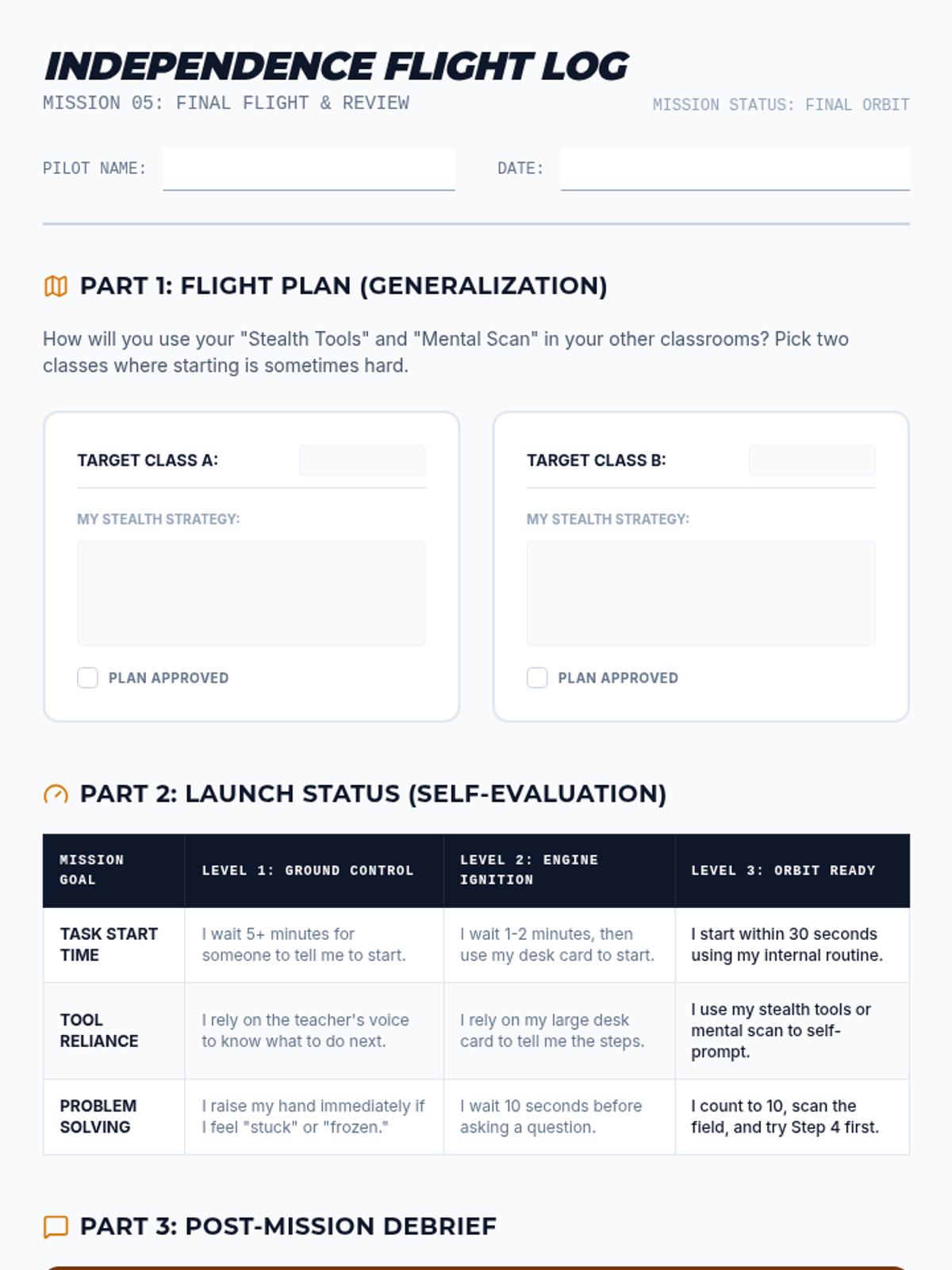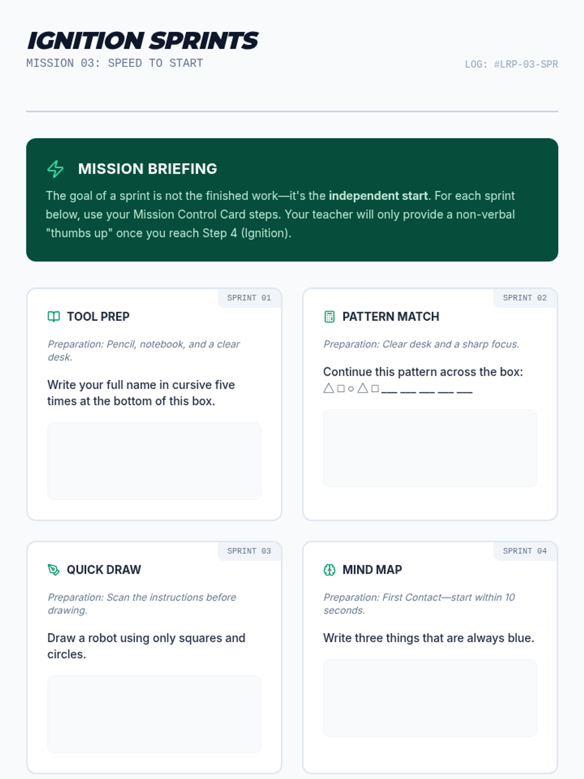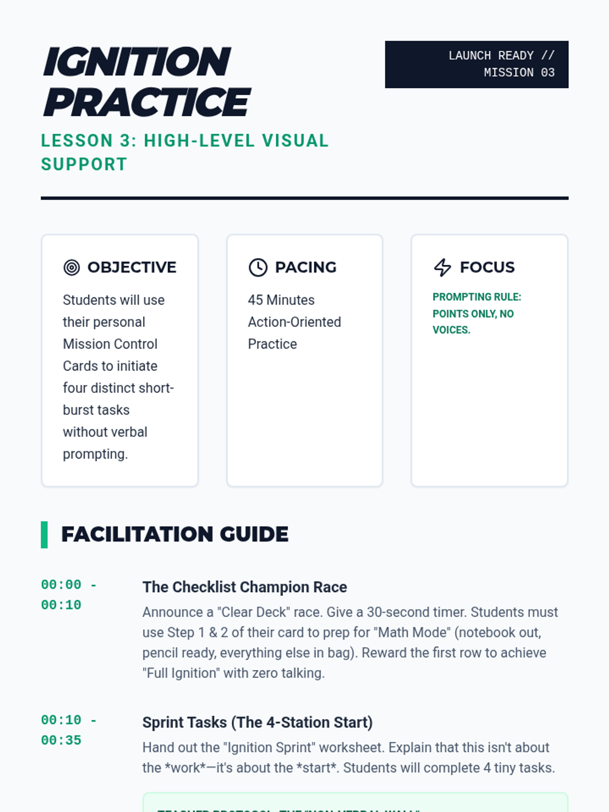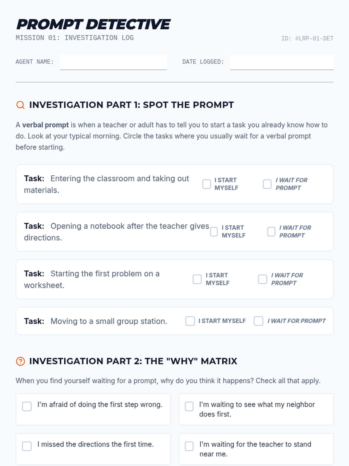 A specialized sequence for 6th-grade students to build independence in task initiation. It moves from identifying prompt dependency to using and internalizing visual checklists, helping students overcome 'waiting behavior' through systematic prompt fading.