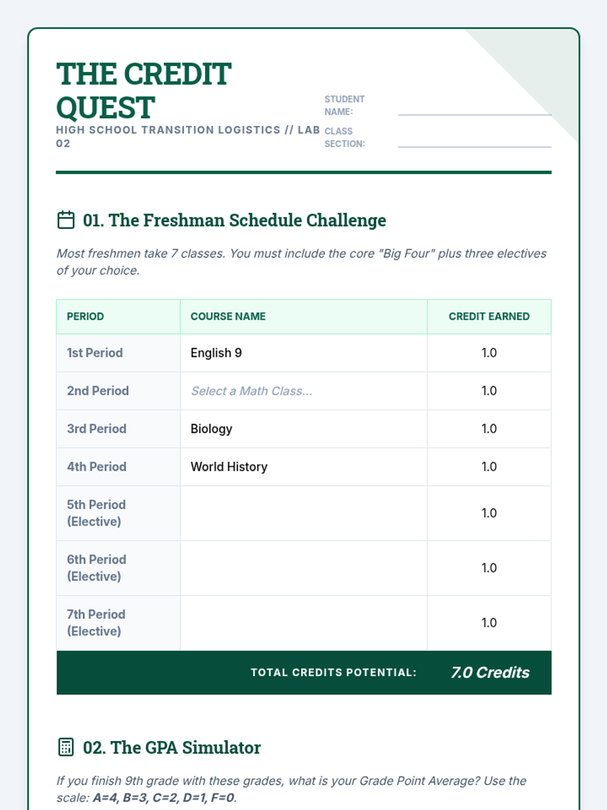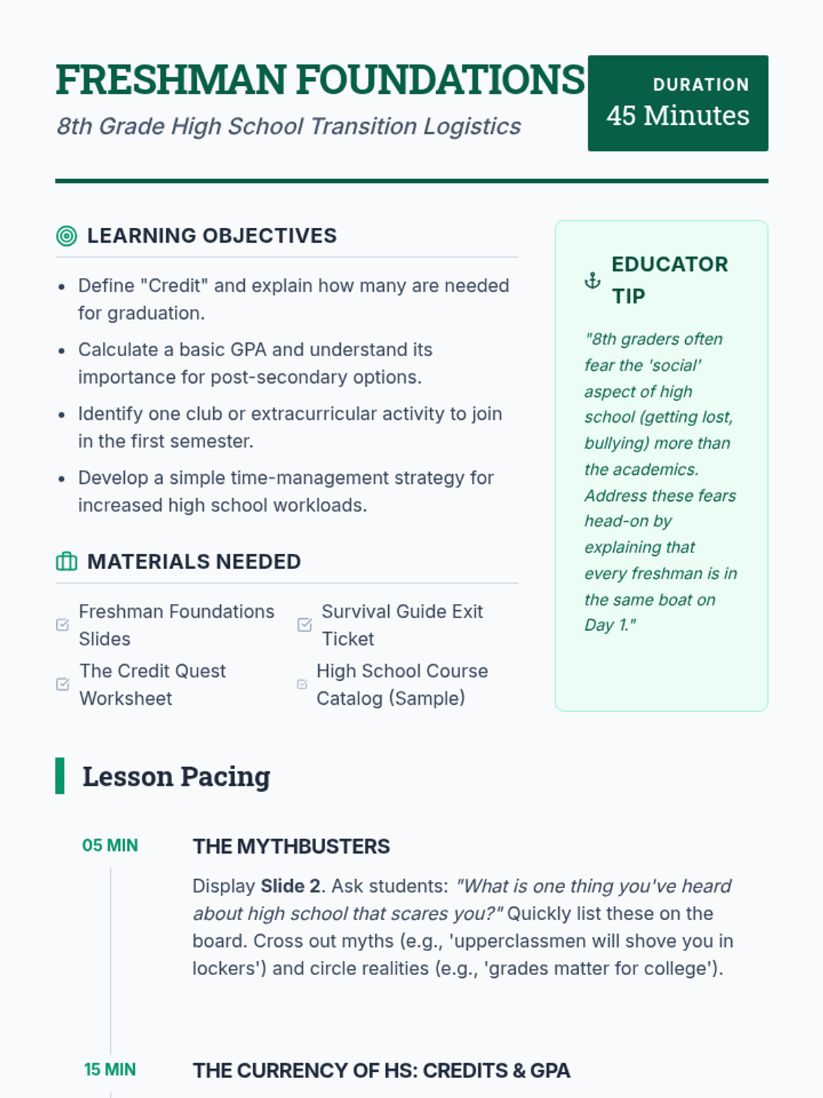 A comprehensive unit designed to prepare 8th-grade students for the academic, social, and emotional transition to high school, focusing on personal goal-setting and logistical readiness.