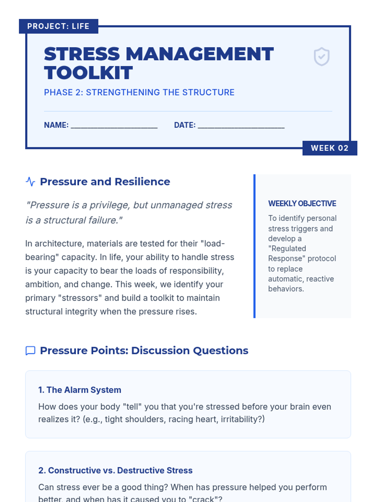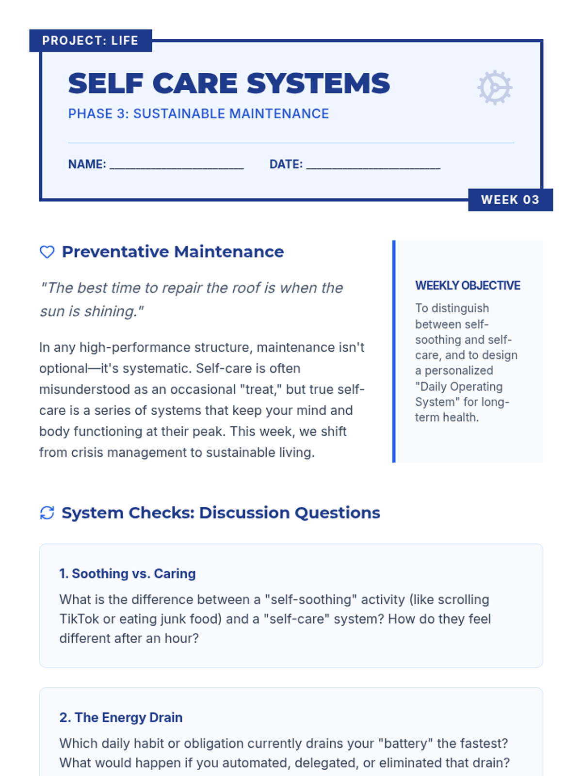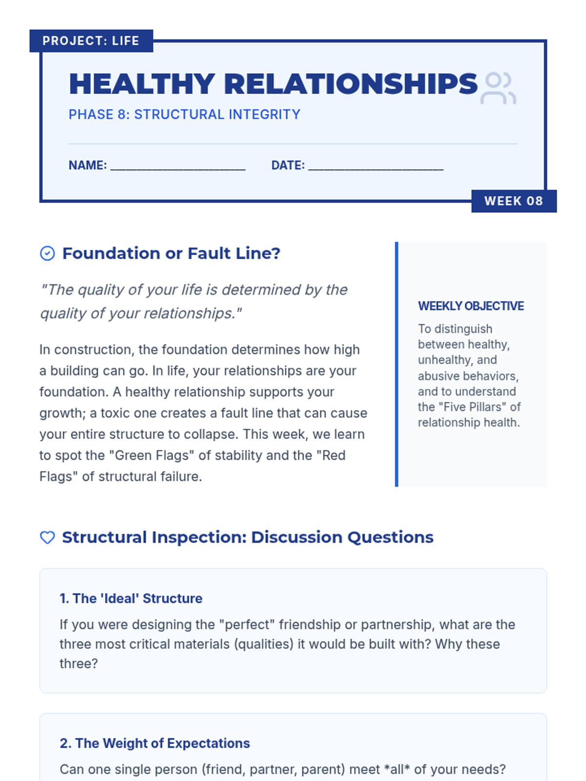 A comprehensive 9-week curriculum designed to equip young adults with essential skills for personal well-being, effective communication, and healthy relationships. This course uses a 'blueprint' theme to help students architect their own futures through goal-setting, stress management, and interpersonal growth.