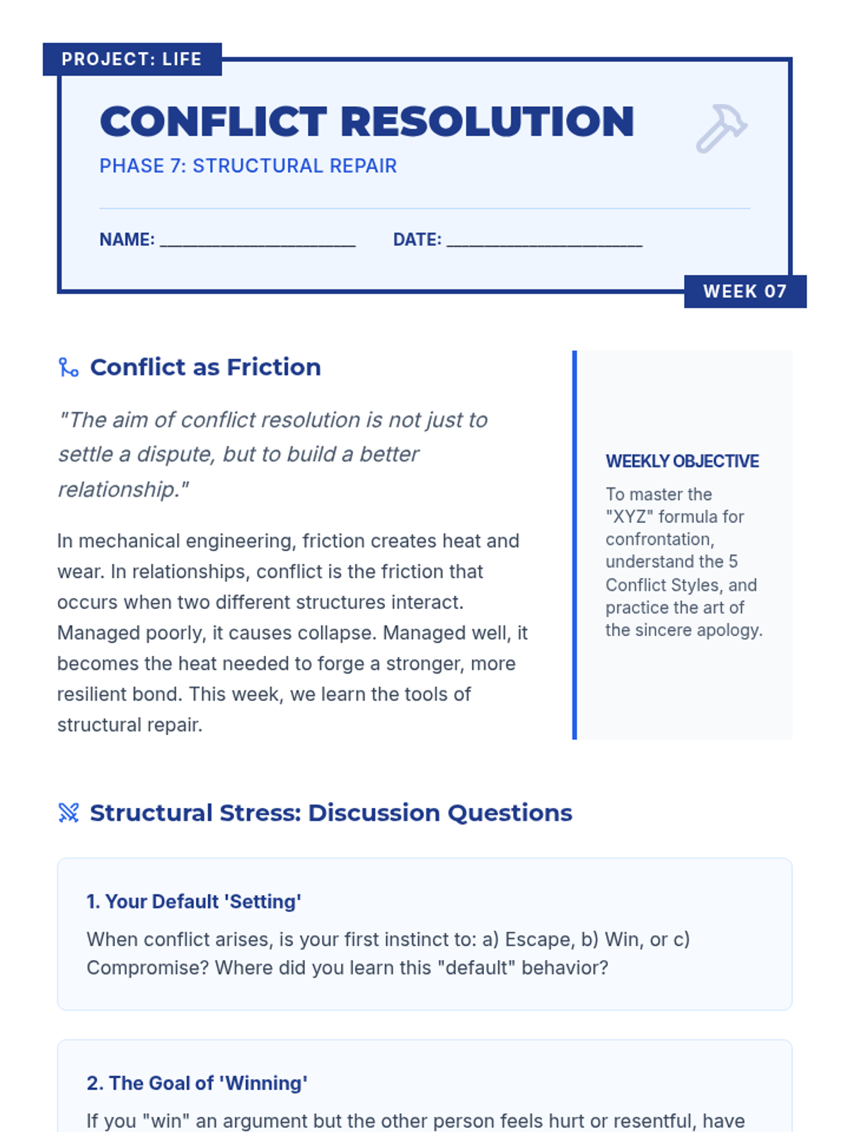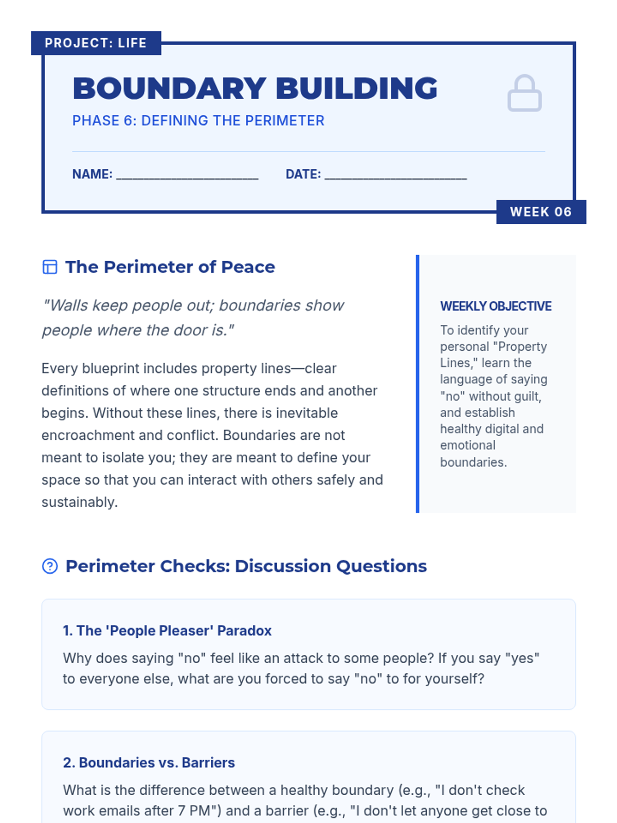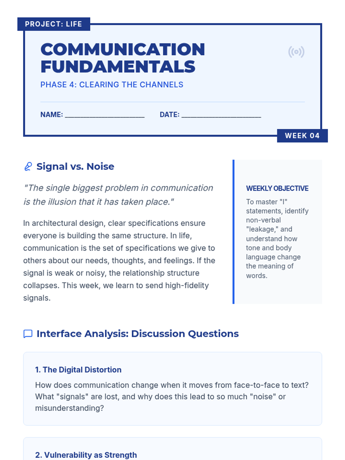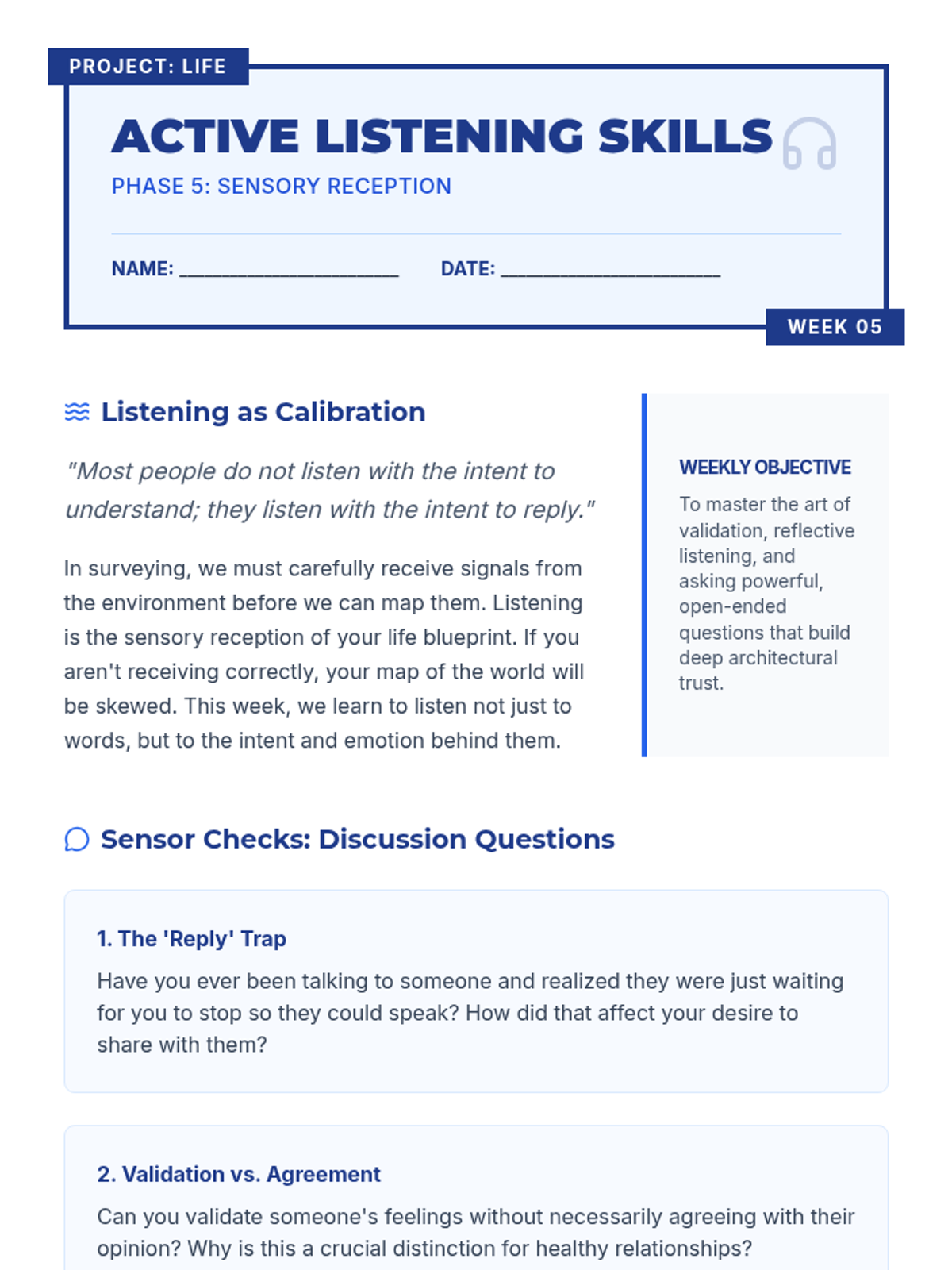 A comprehensive 9-week curriculum designed to equip young adults with essential skills for personal well-being, effective communication, and healthy relationships. This course uses a 'blueprint' theme to help students architect their own futures through goal-setting, stress management, and interpersonal growth.