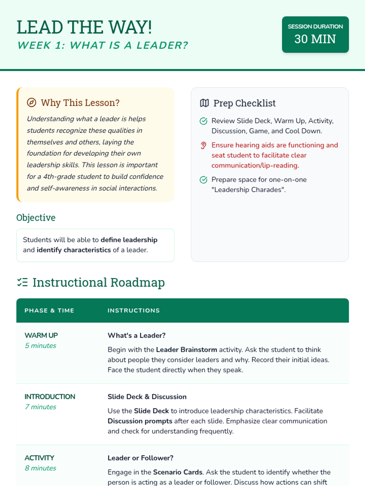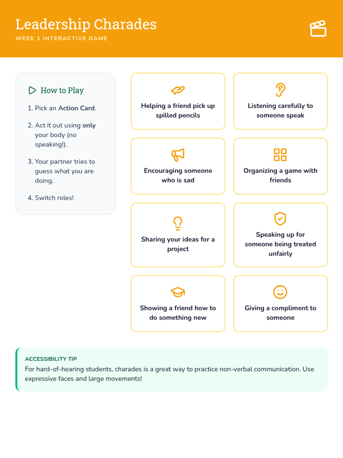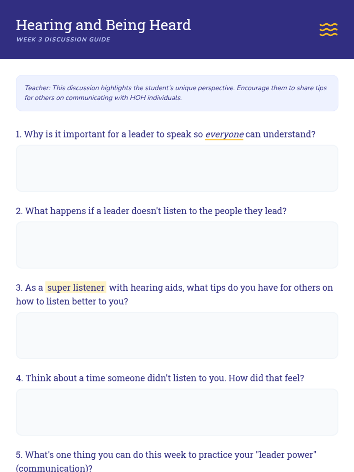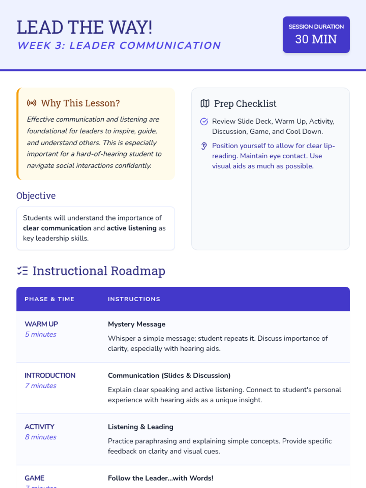 A 5-week leadership development series for 4th-grade students, specifically designed to be accessible for students who are hard of hearing. This sequence focuses on initiative, communication, problem-solving, empathy, and confidence.