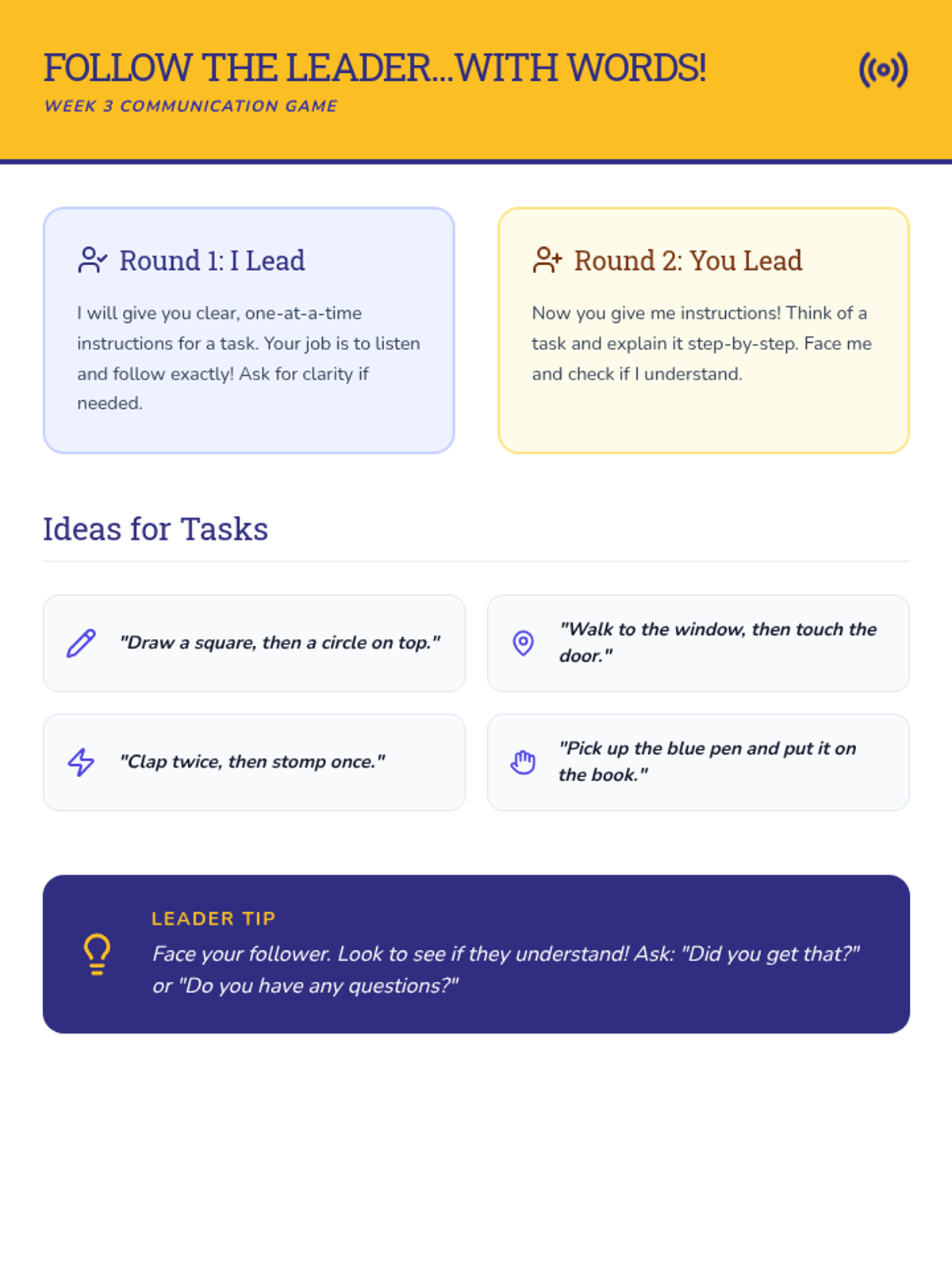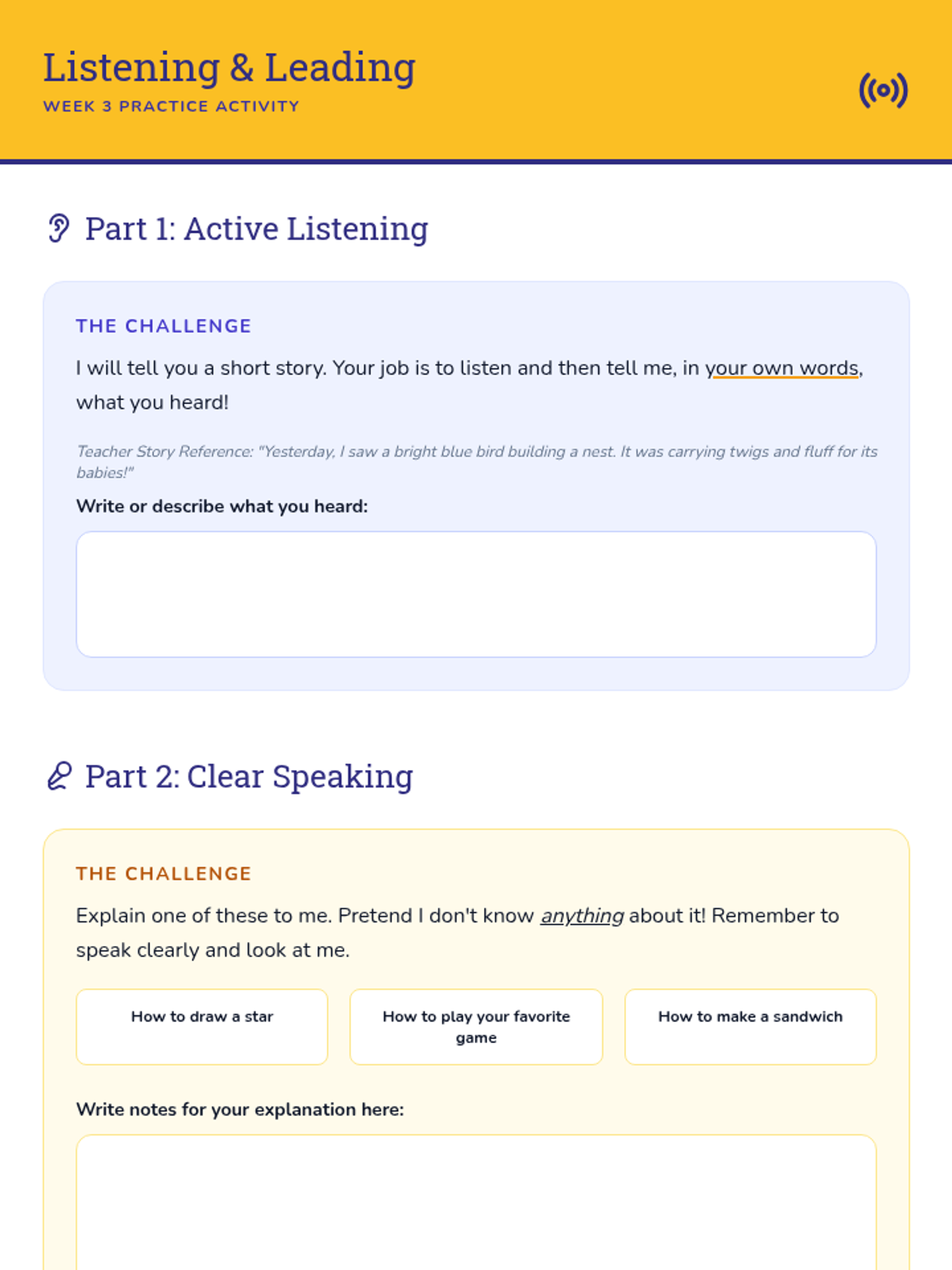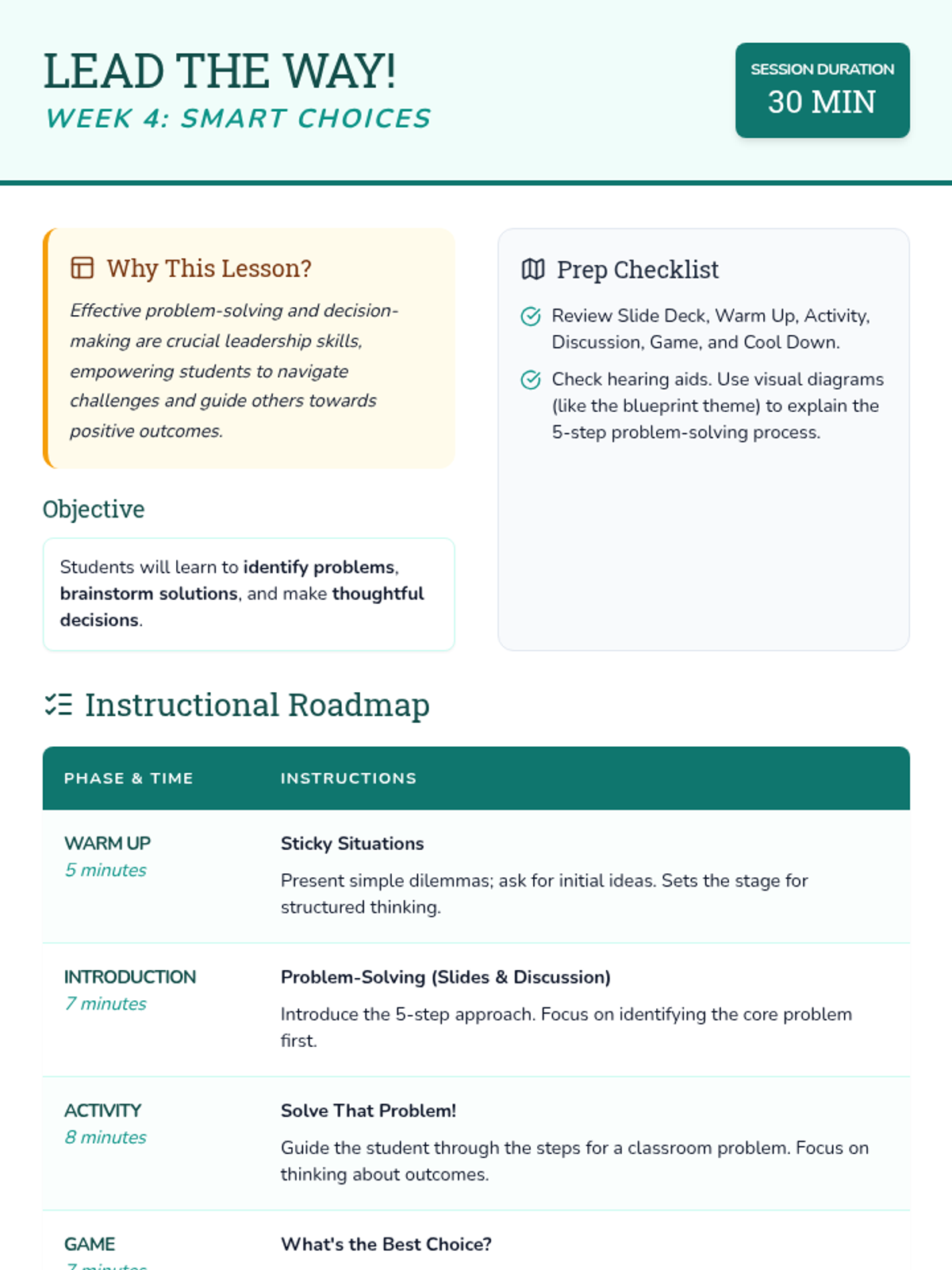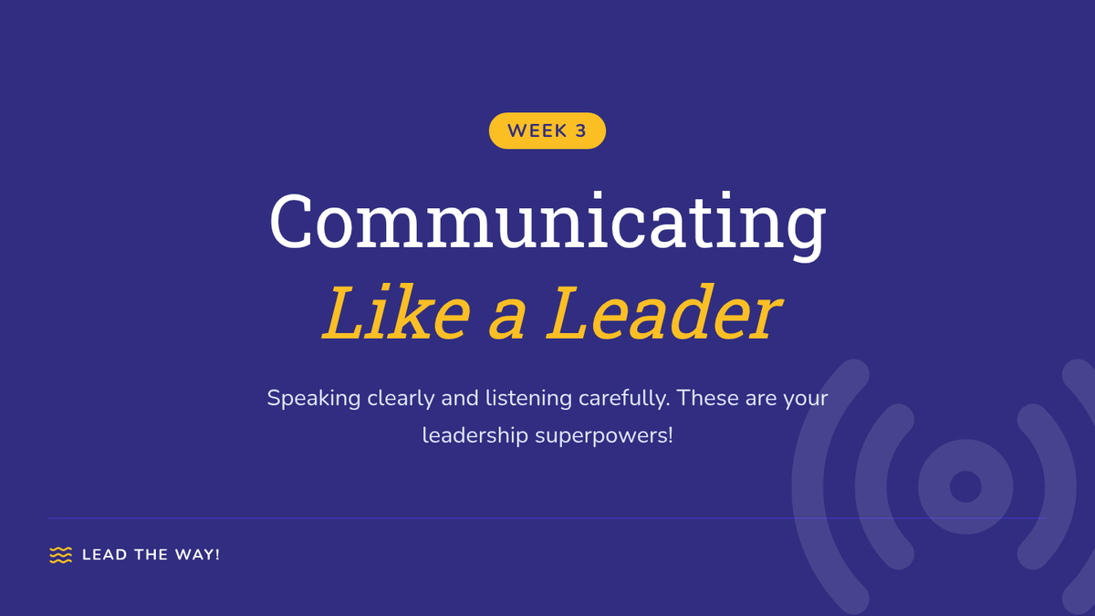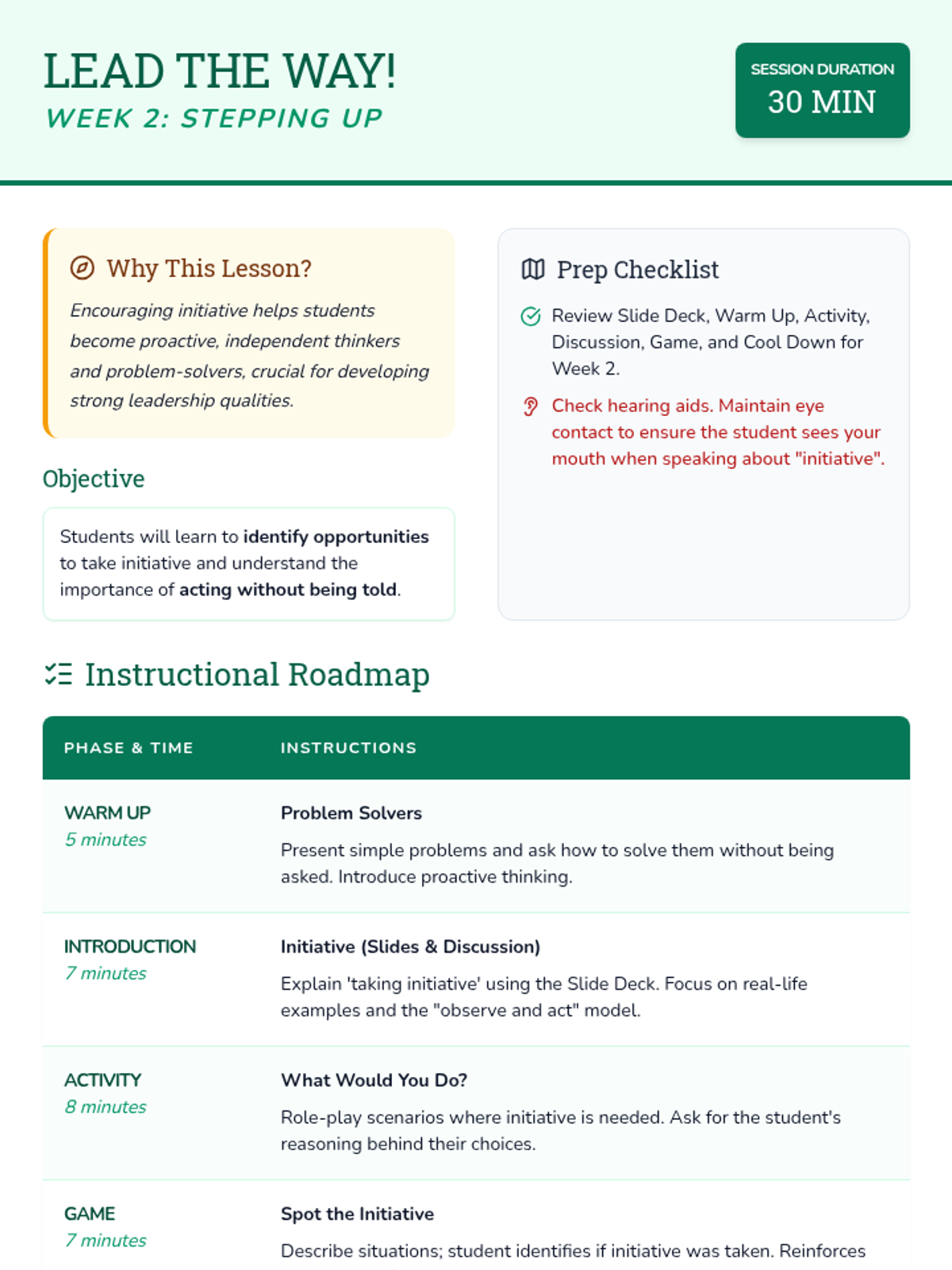 A 5-week leadership development series for 4th-grade students, specifically designed to be accessible for students who are hard of hearing. This sequence focuses on initiative, communication, problem-solving, empathy, and confidence.