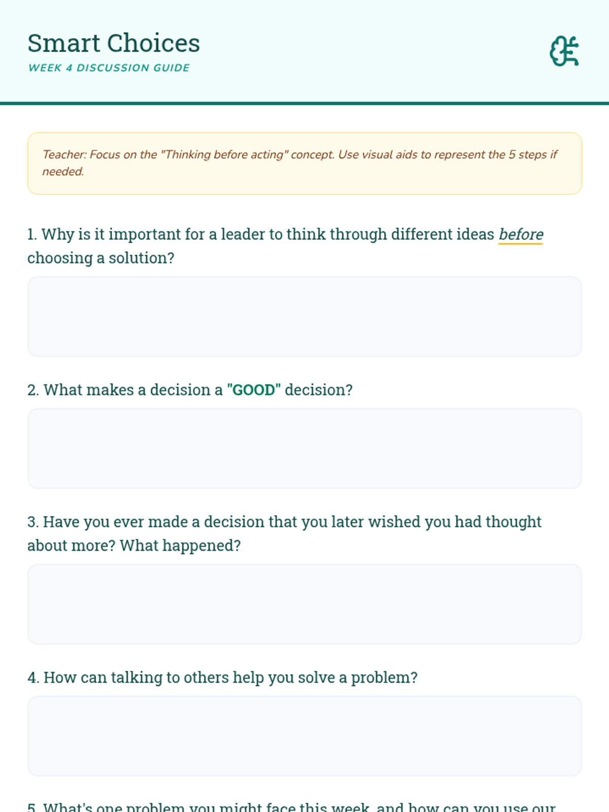 A comprehensive 8-session program designed for youth ages 9-18, focusing on essential life skills including self-esteem, resilience, time management, and conflict resolution through interactive role-plays and guided instruction.
