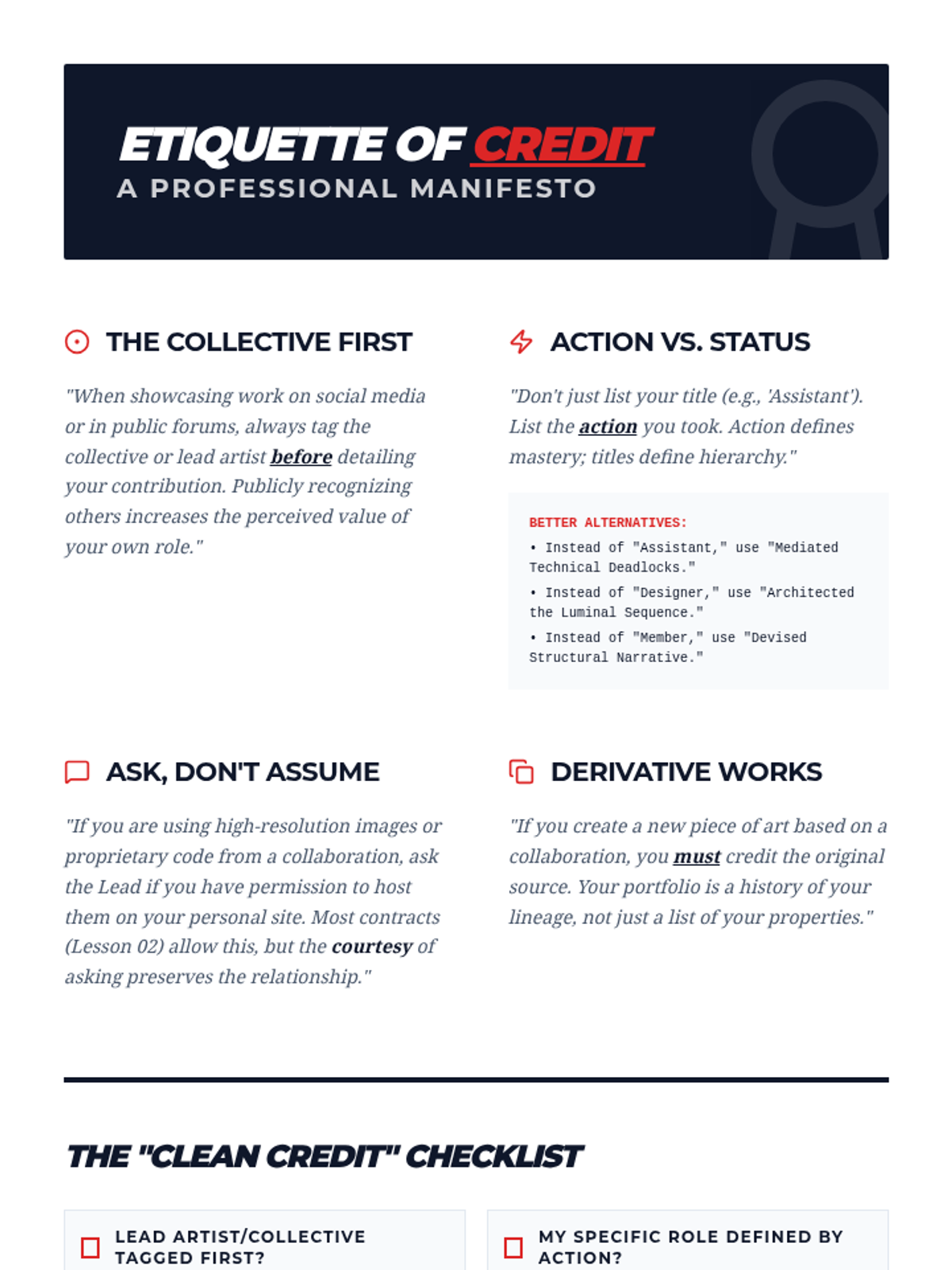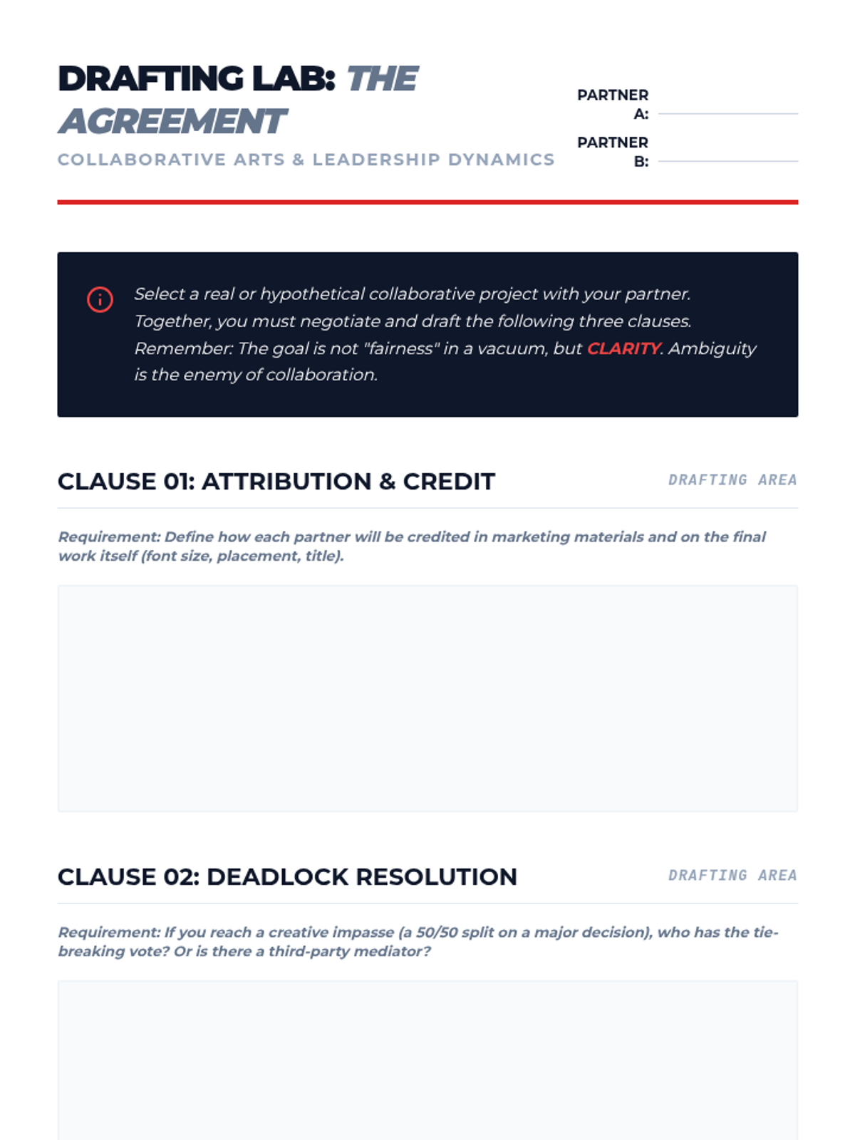 A graduate-level sequence exploring the ethical, legal, and leadership dimensions of collaborative arts practice. Students investigate authorship, intellectual property, and conflict resolution to prepare for professional creative leadership.