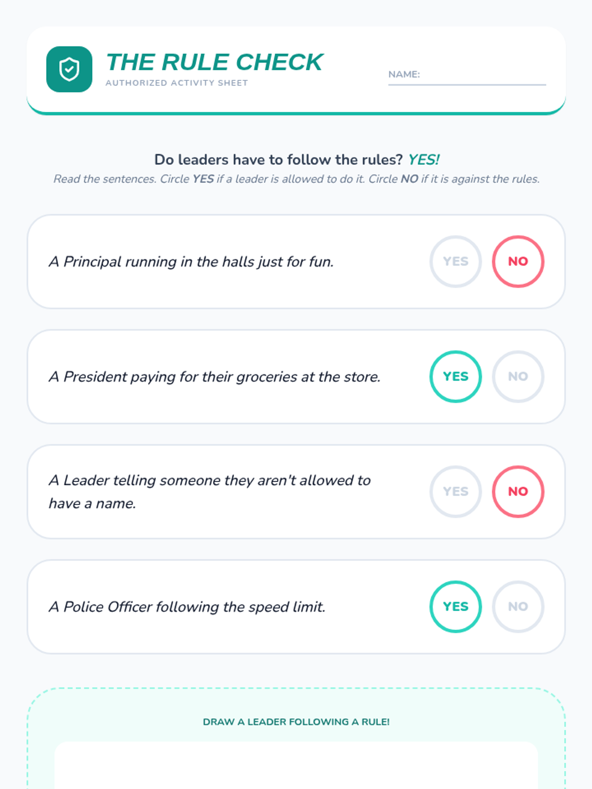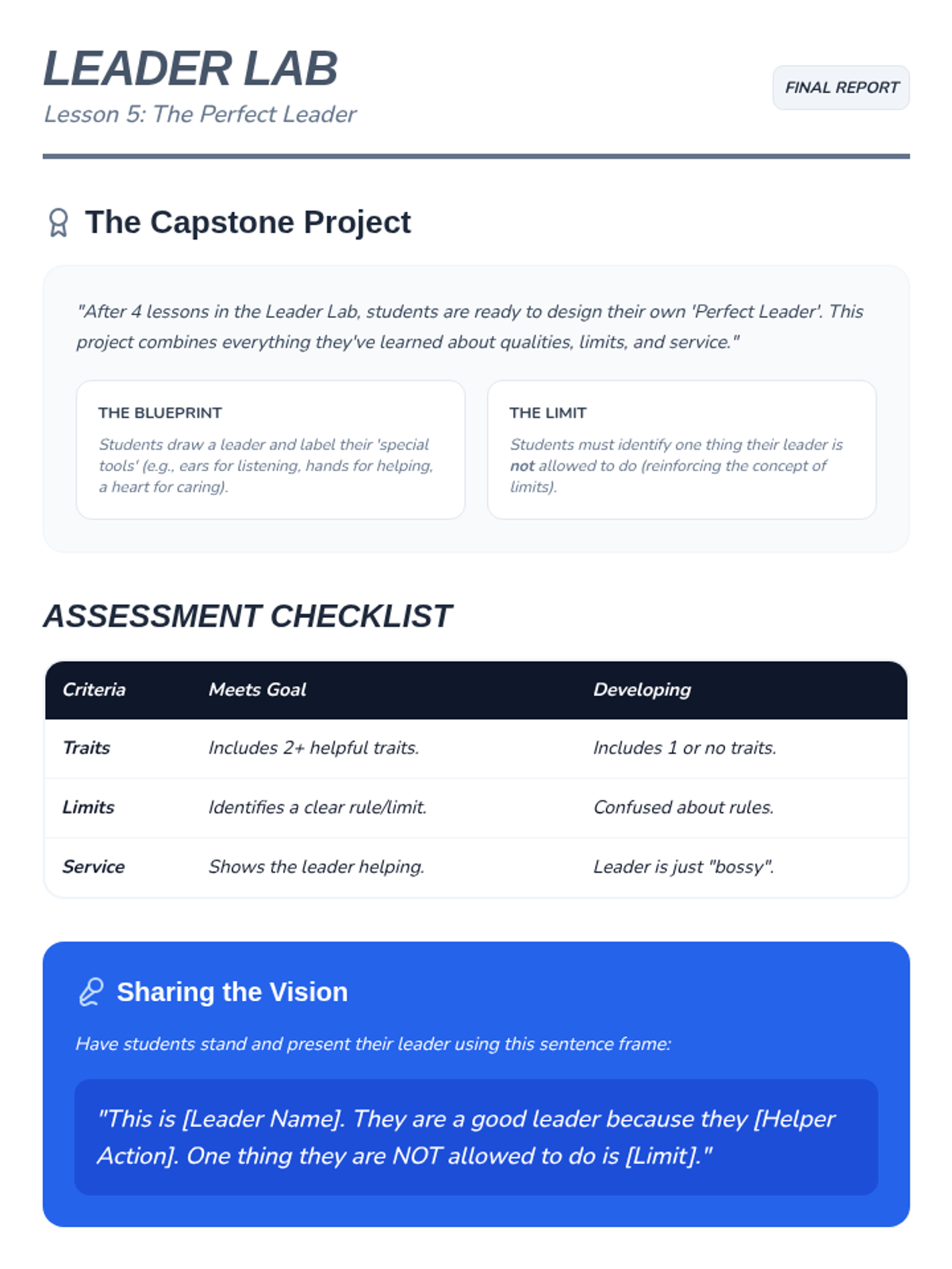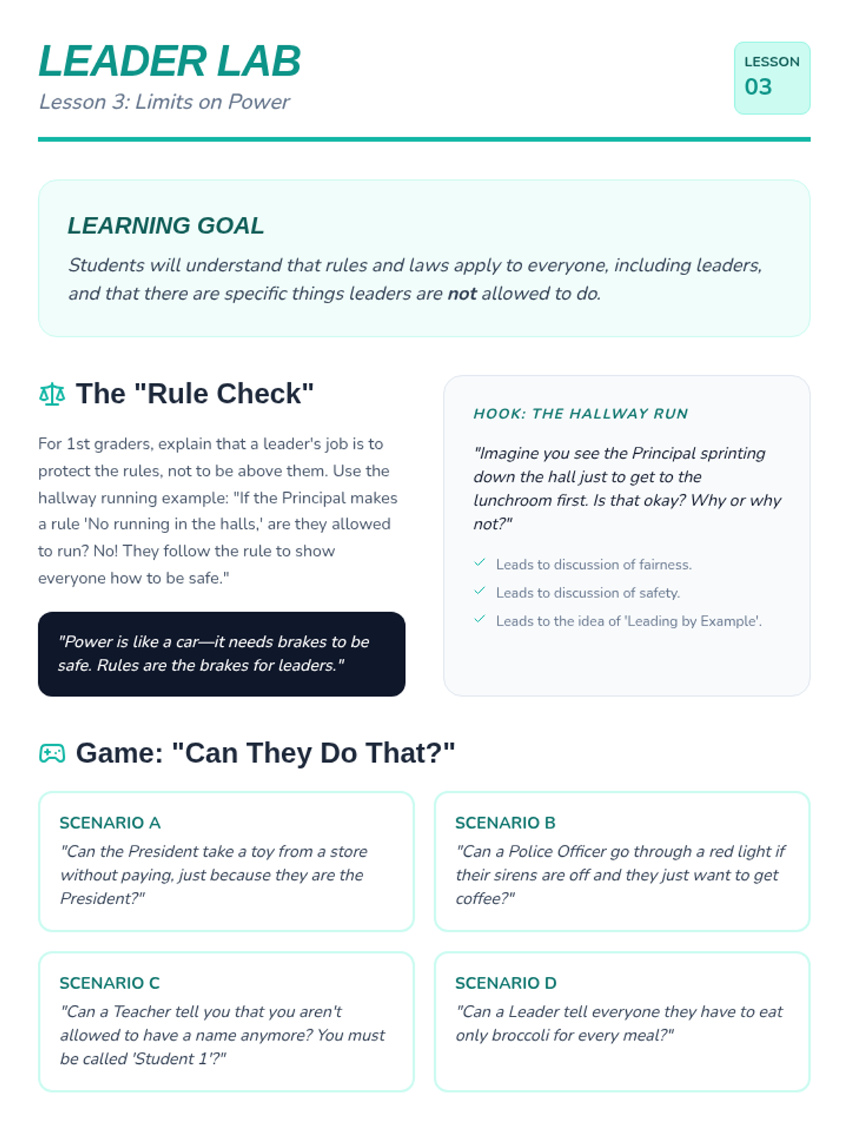 A 1st-grade civics sequence focusing on the distinction between coercive power ('bossy' behavior) and servant leadership ('helpful' behavior), while introducing the concept that all leaders are subject to limits and laws.