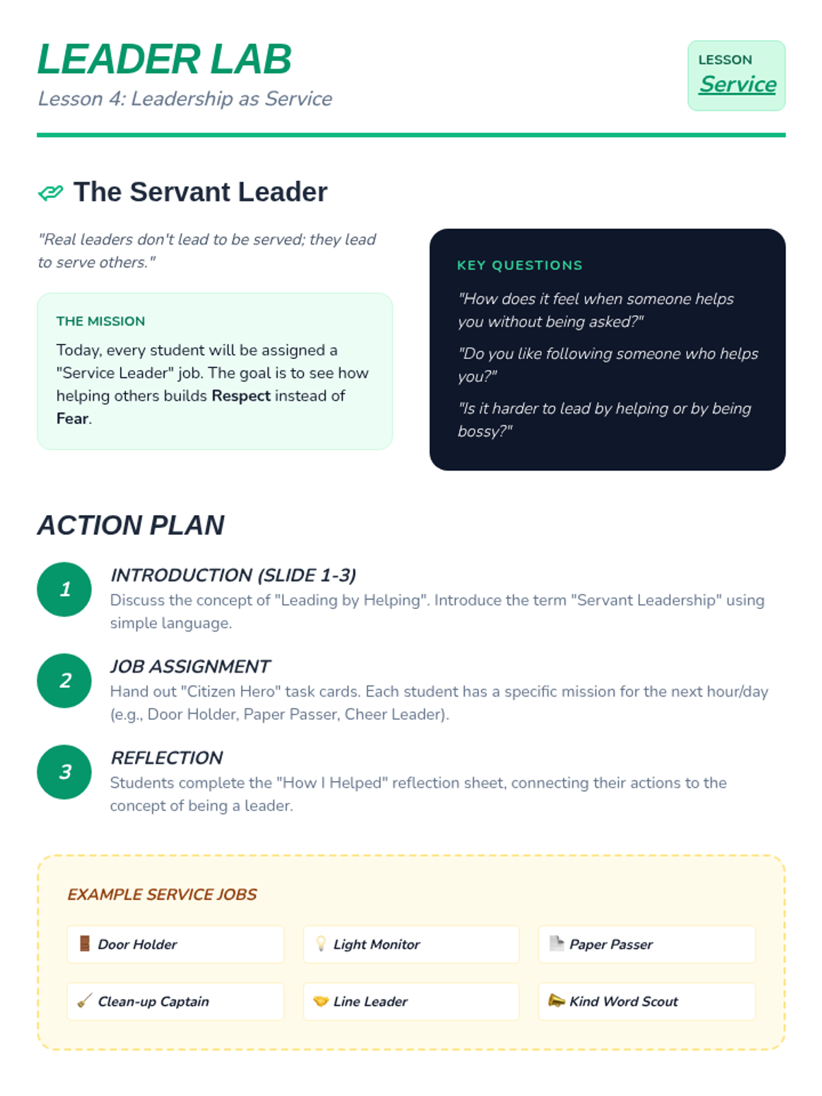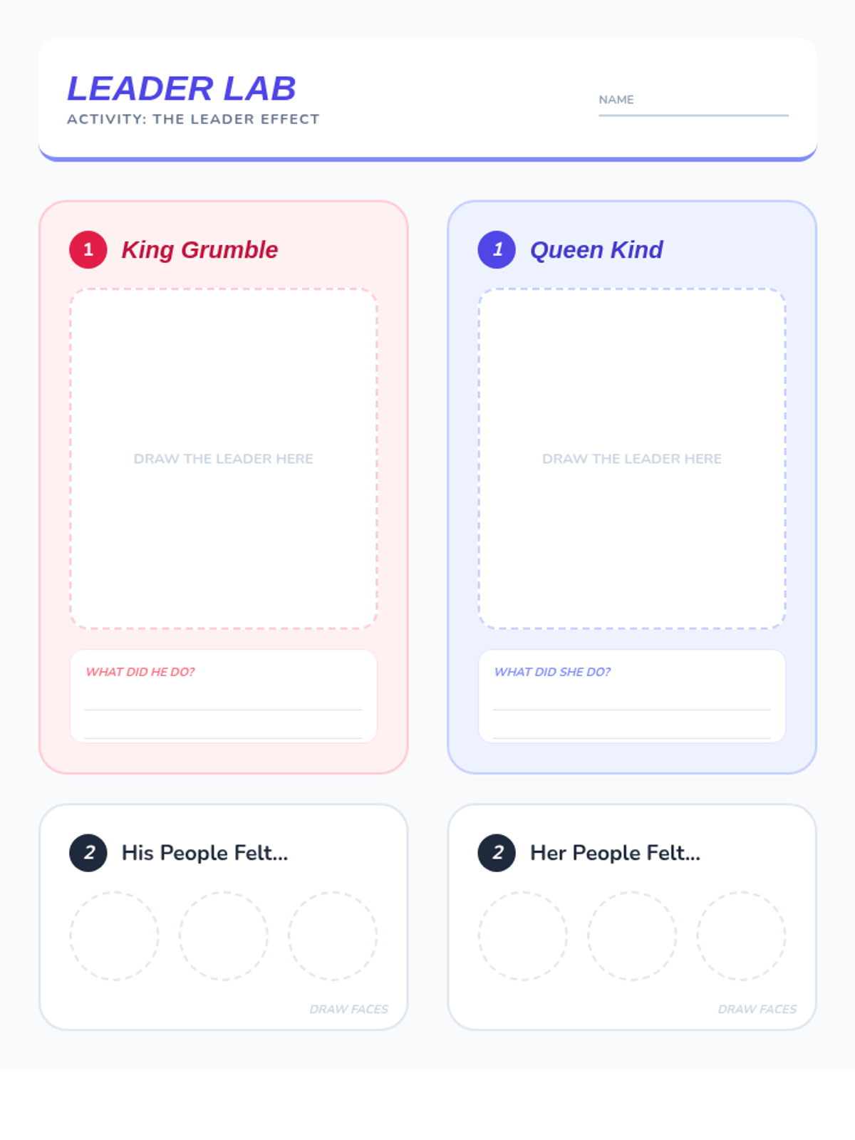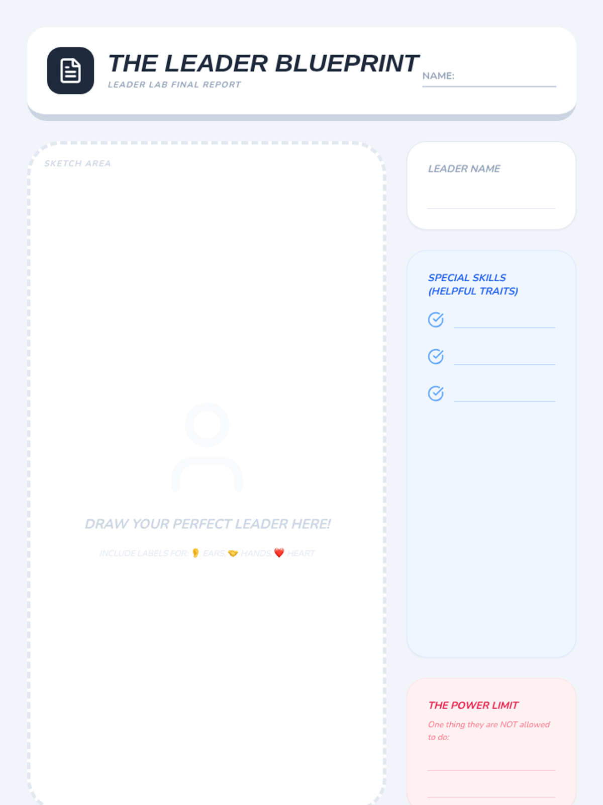 A 1st-grade civics sequence focusing on the distinction between coercive power ('bossy' behavior) and servant leadership ('helpful' behavior), while introducing the concept that all leaders are subject to limits and laws.