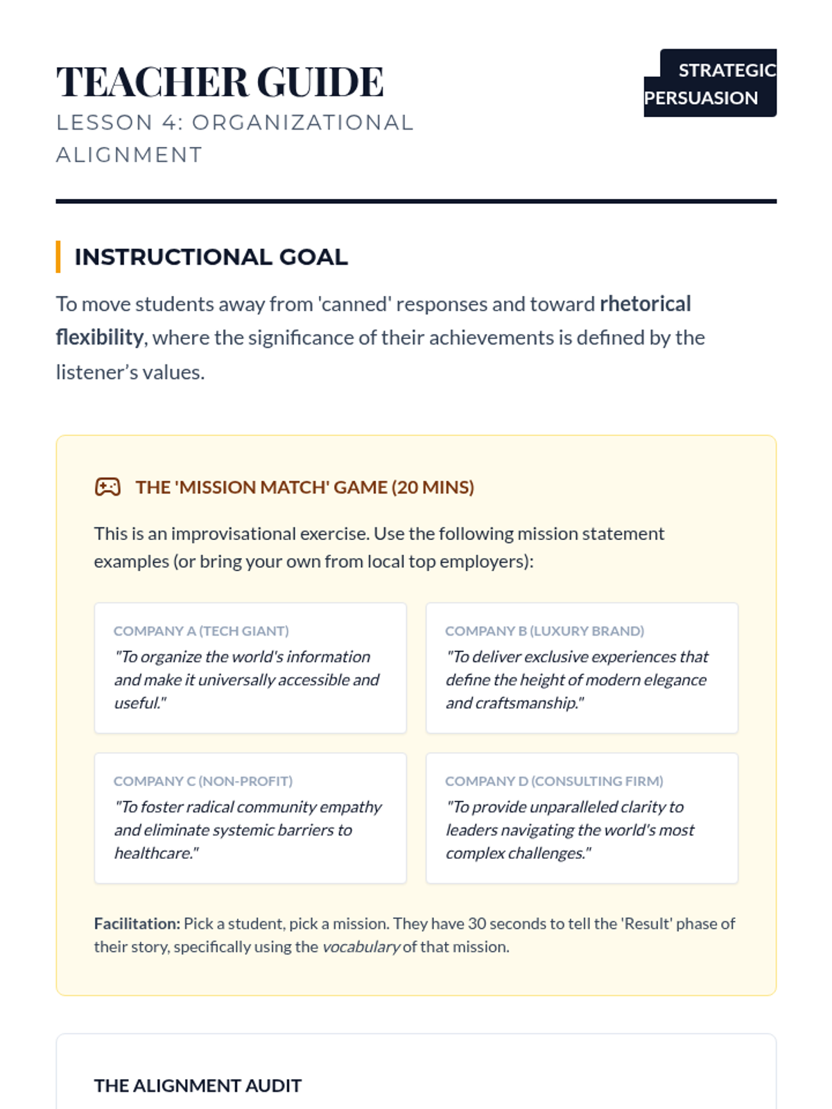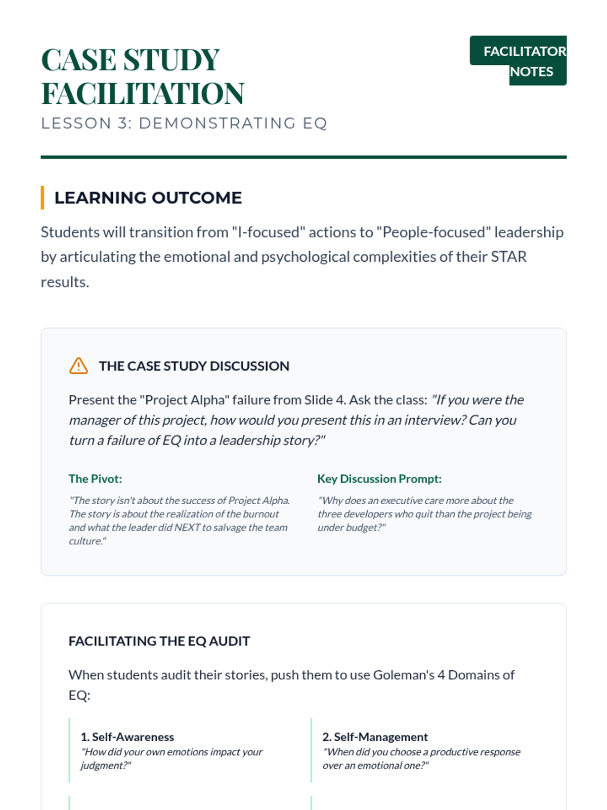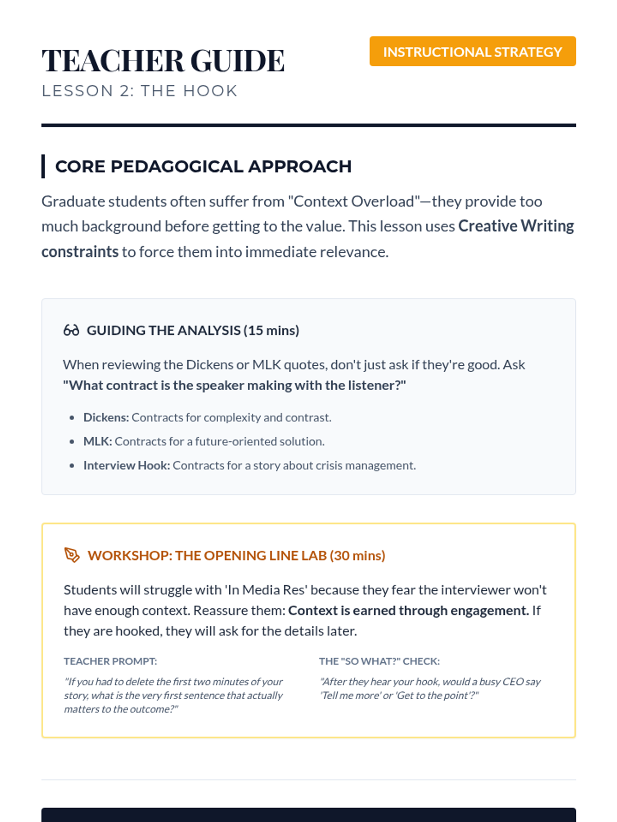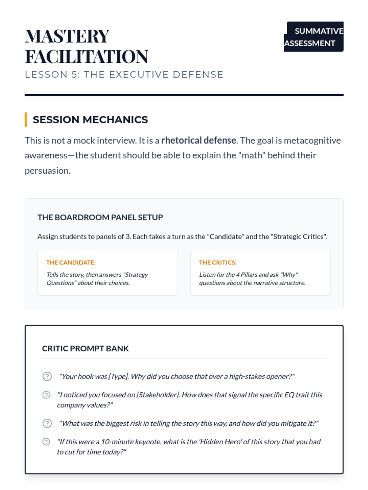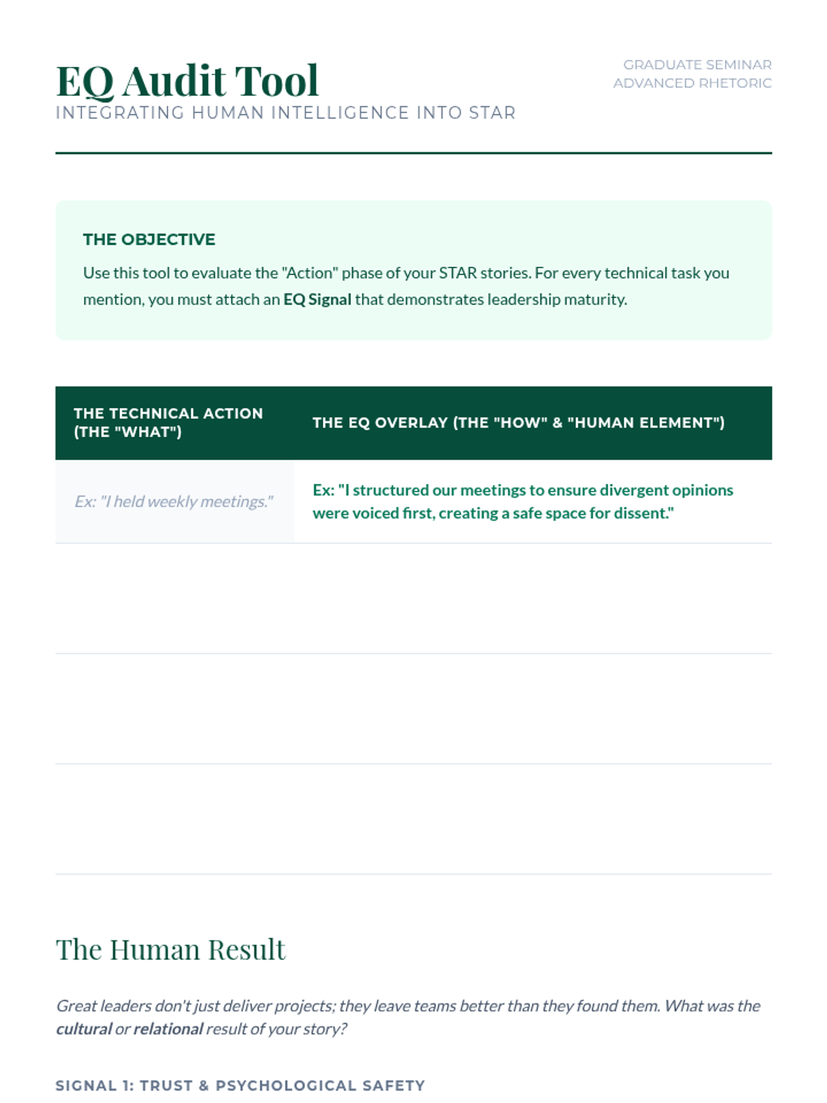 A high-level sequence for graduate students focusing on the rhetorical and leadership elements of the STAR method. Students move beyond basic reporting to craft sophisticated narratives that demonstrate vision, emotional intelligence, and organizational alignment for executive-level roles.