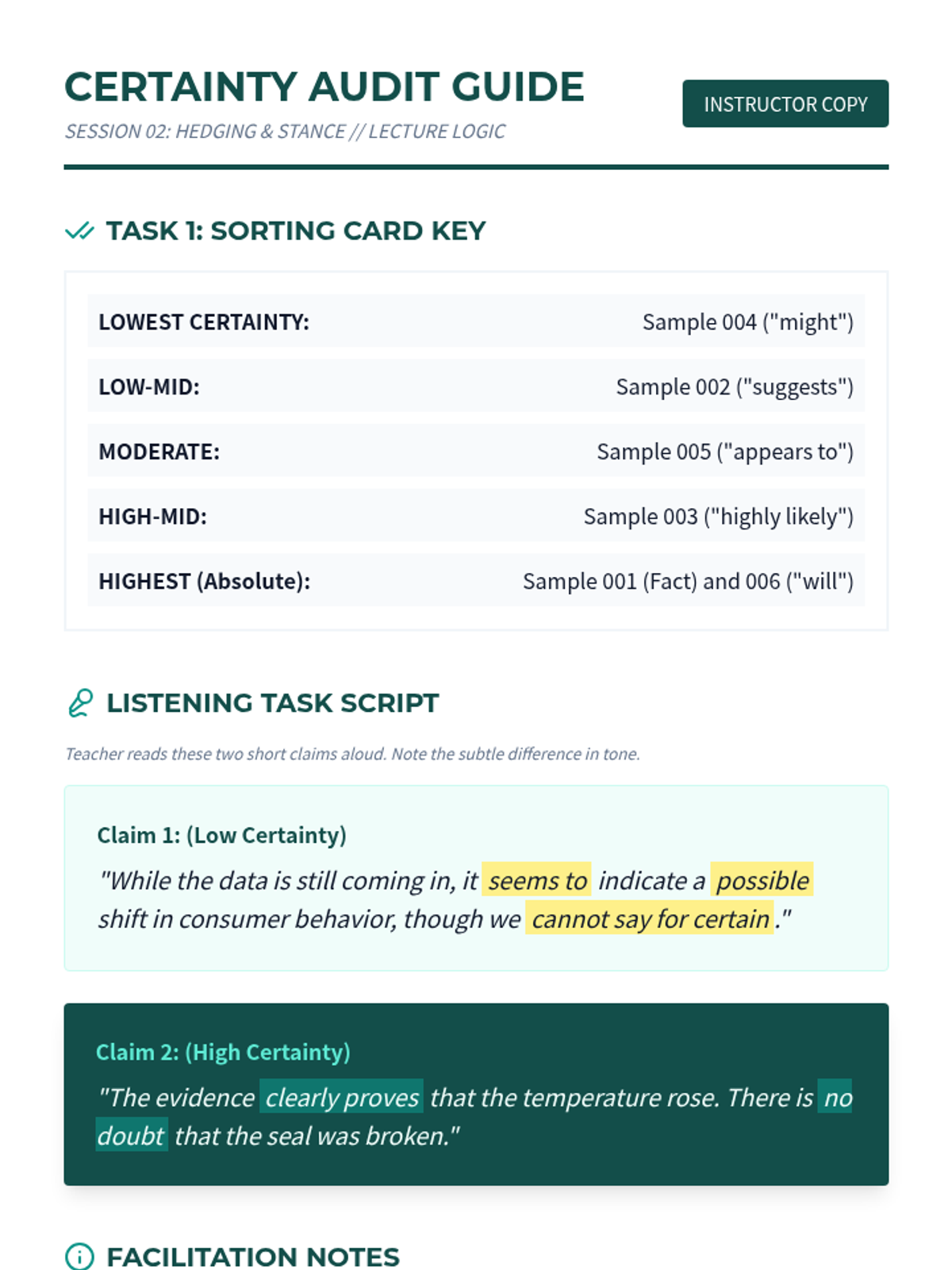 This sequence prepares intermediate ESL students for university-level academic listening by focusing on signposting language, speaker stance, hedging, and strategic note-taking. Students will move from identifying basic transitions to synthesizing complex arguments from multiple spoken sources.