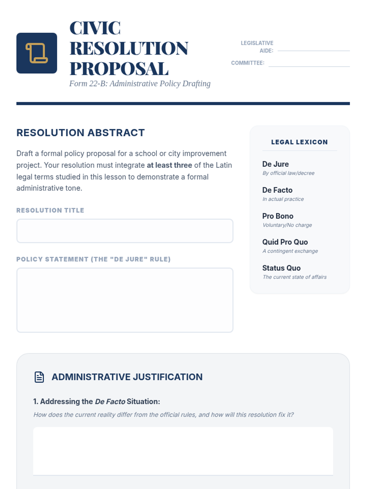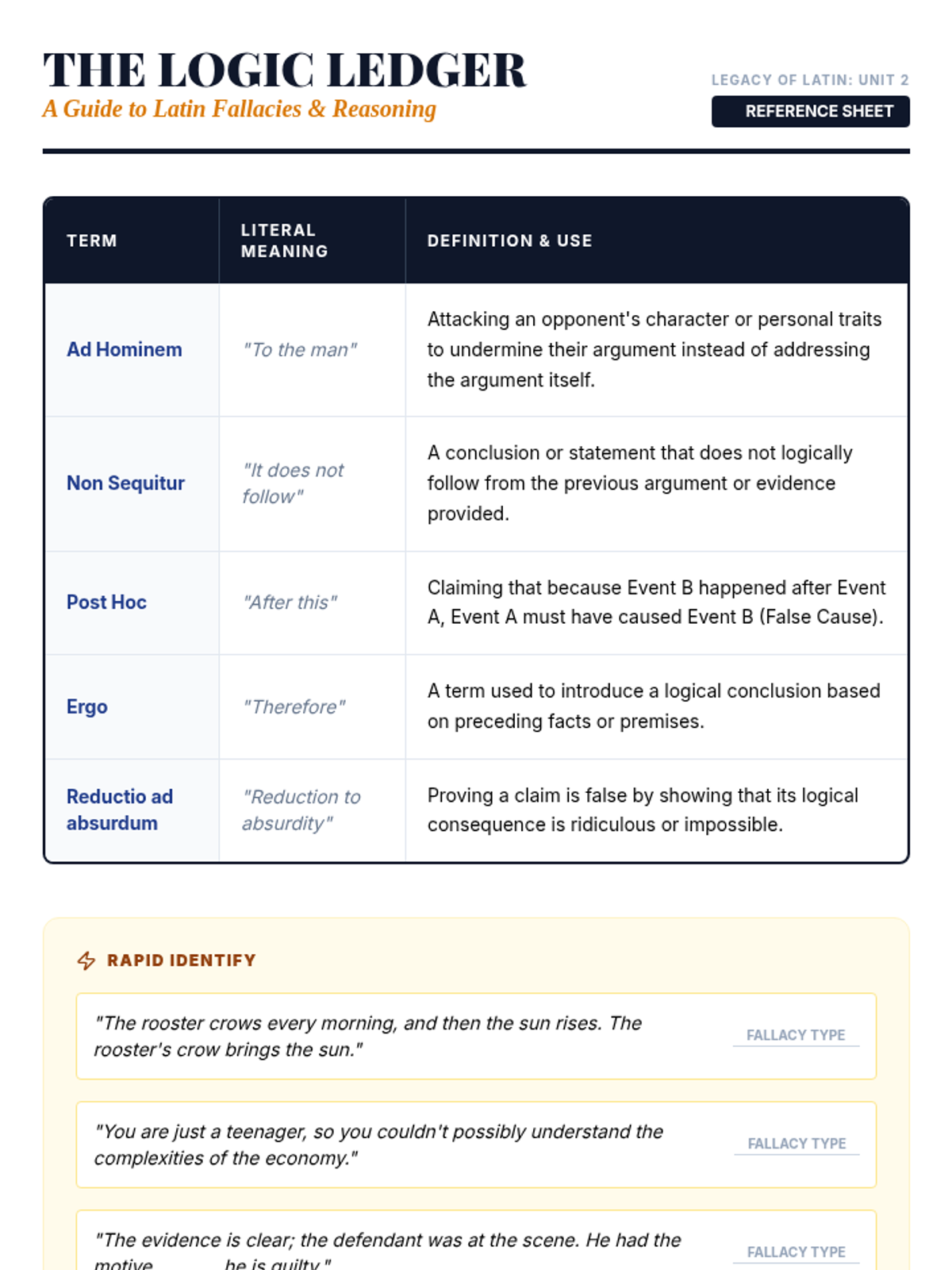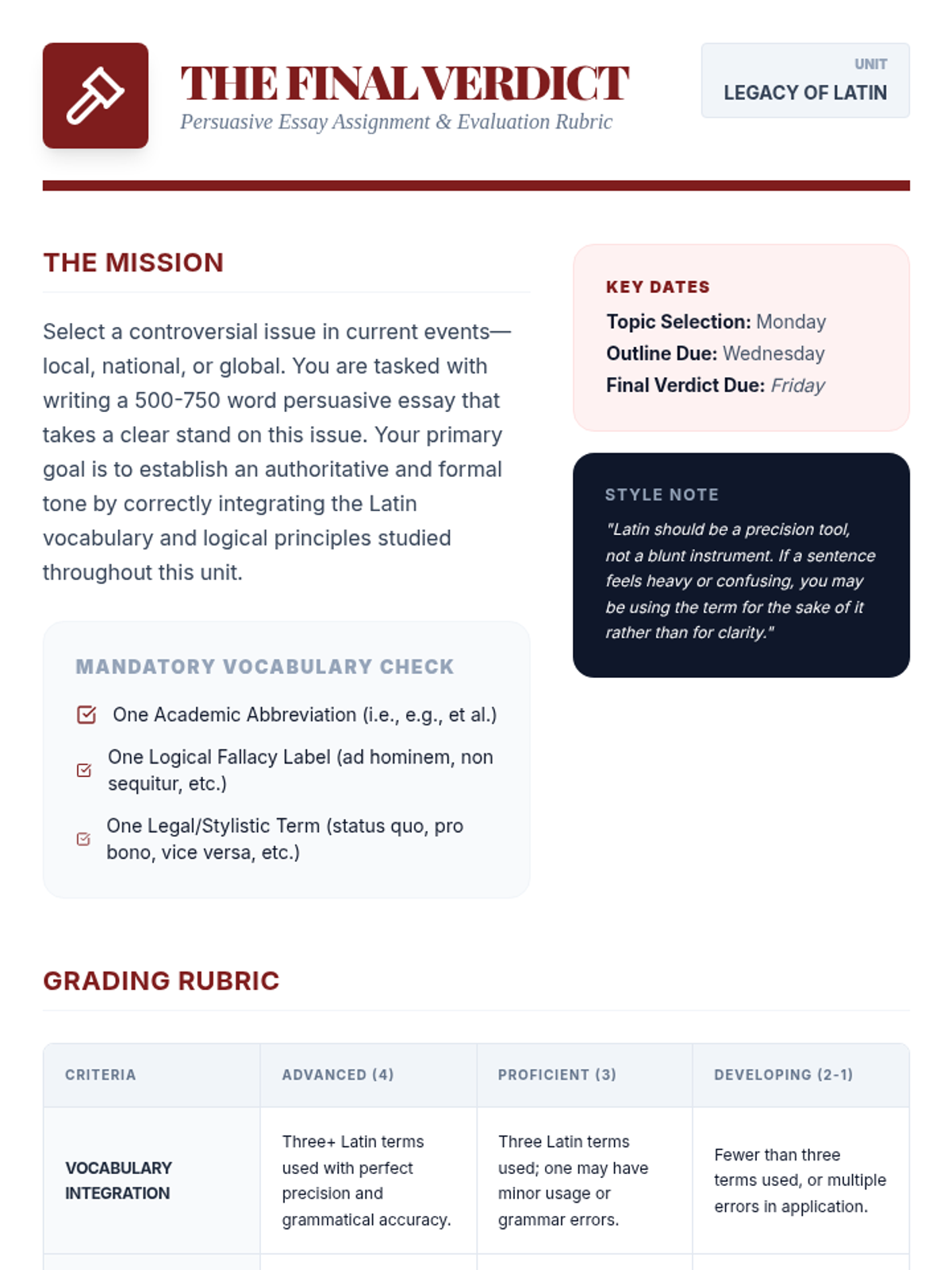 A comprehensive 10th Grade ELA unit exploring the use of Latin terminology in formal writing, logic, and law. Students progress from basic abbreviations to complex logical fallacies and administrative terms, culminating in a persuasive writing project.