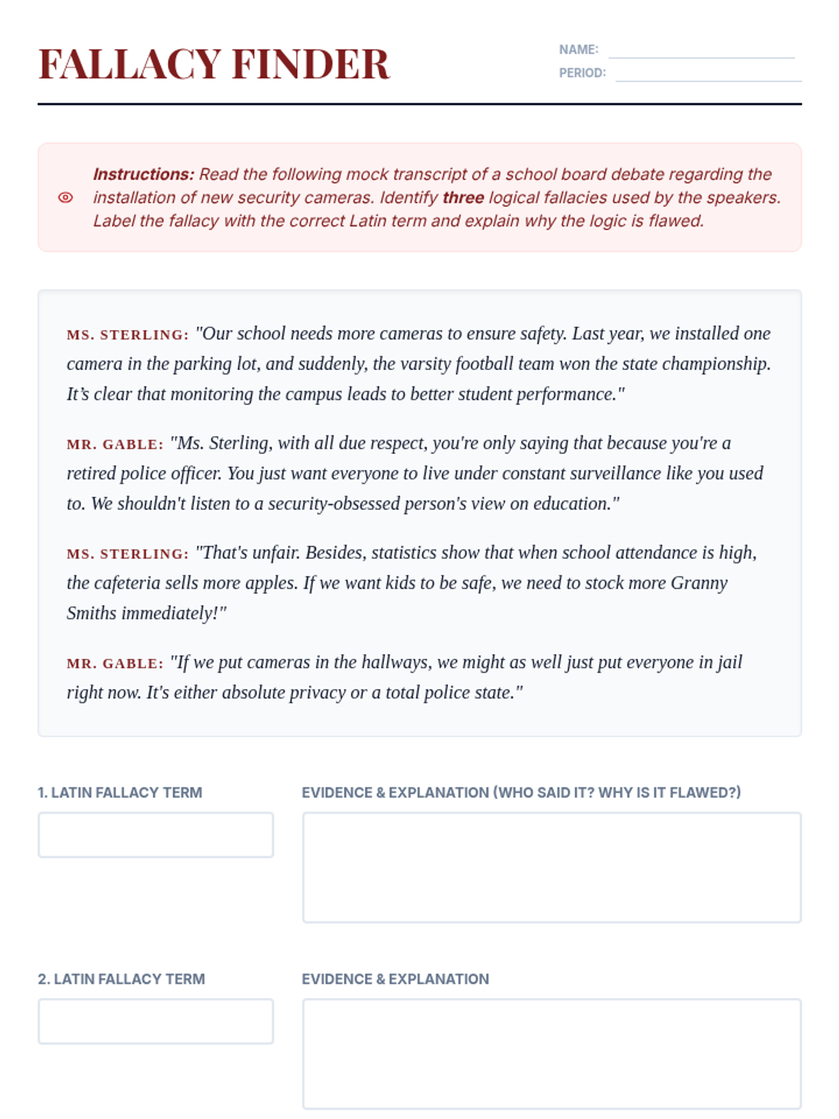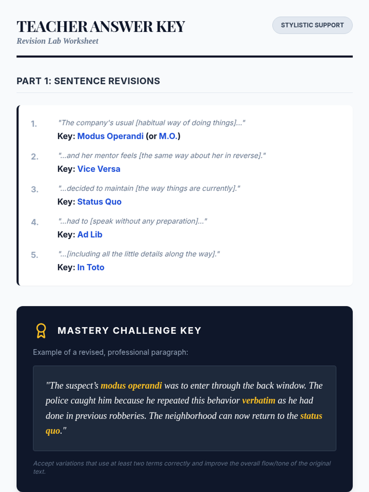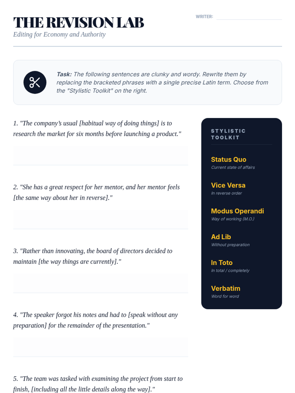 A comprehensive 10th Grade ELA unit exploring the use of Latin terminology in formal writing, logic, and law. Students progress from basic abbreviations to complex logical fallacies and administrative terms, culminating in a persuasive writing project.