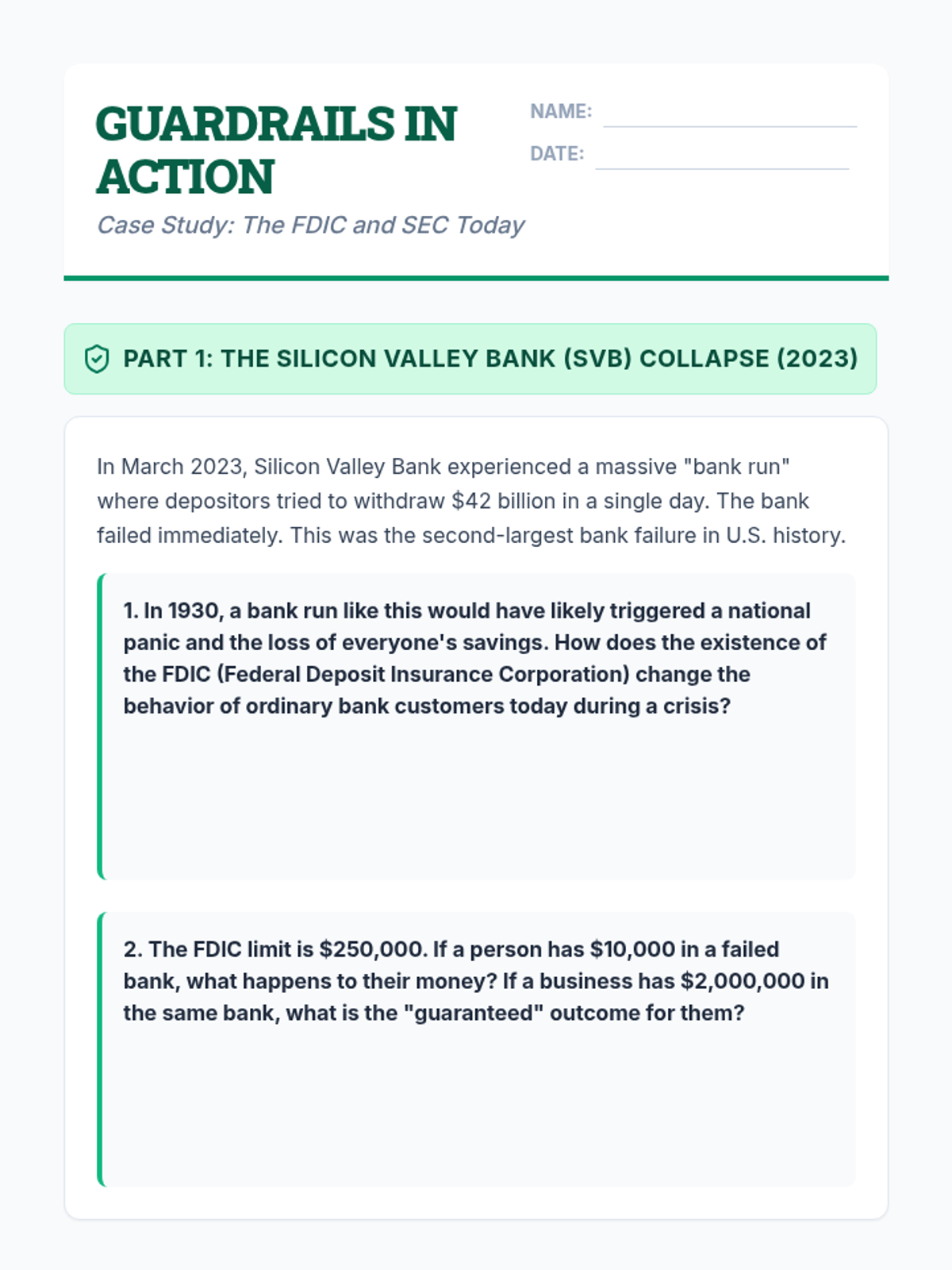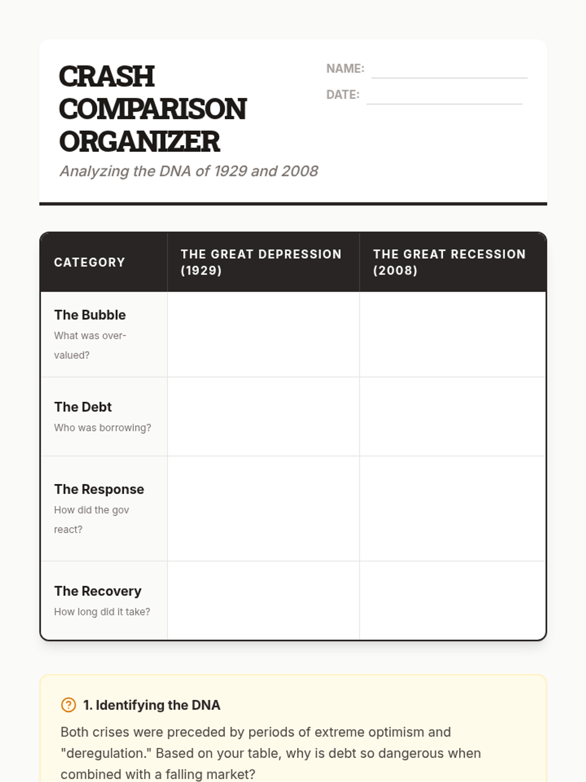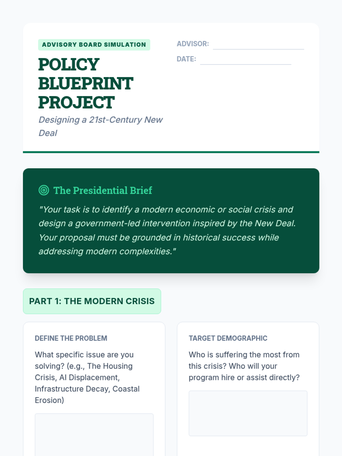 This high school history sequence examines the lasting impact of the Great Depression and New Deal on modern America, comparing 1930s reforms to the 2008 financial crisis and contemporary policy proposals.