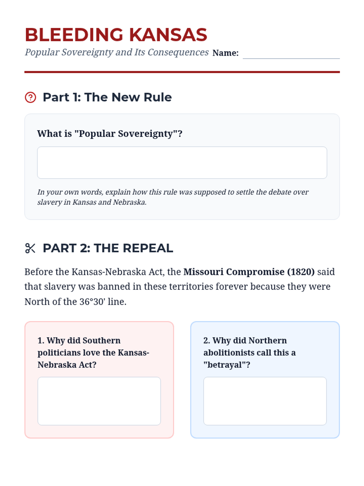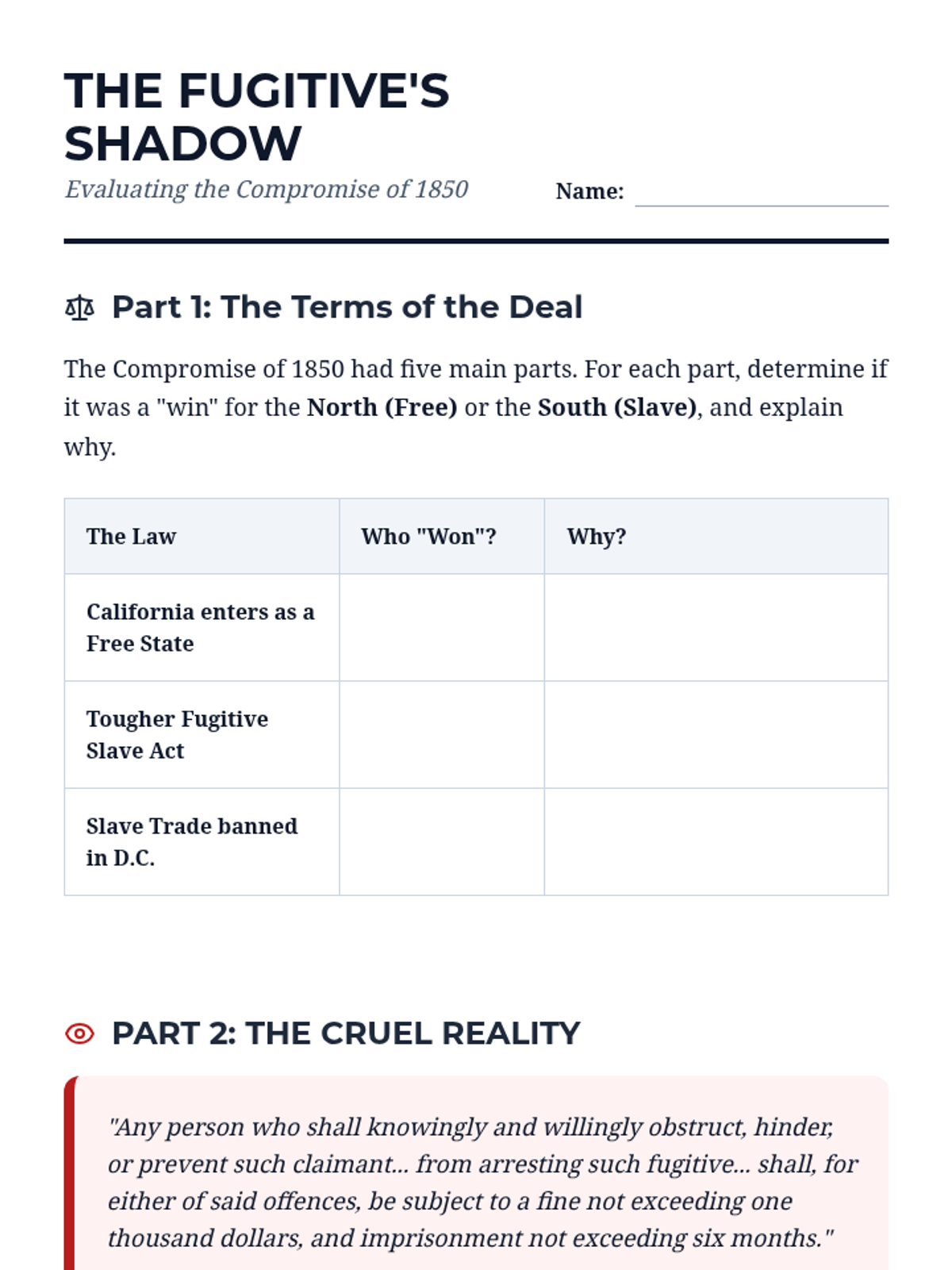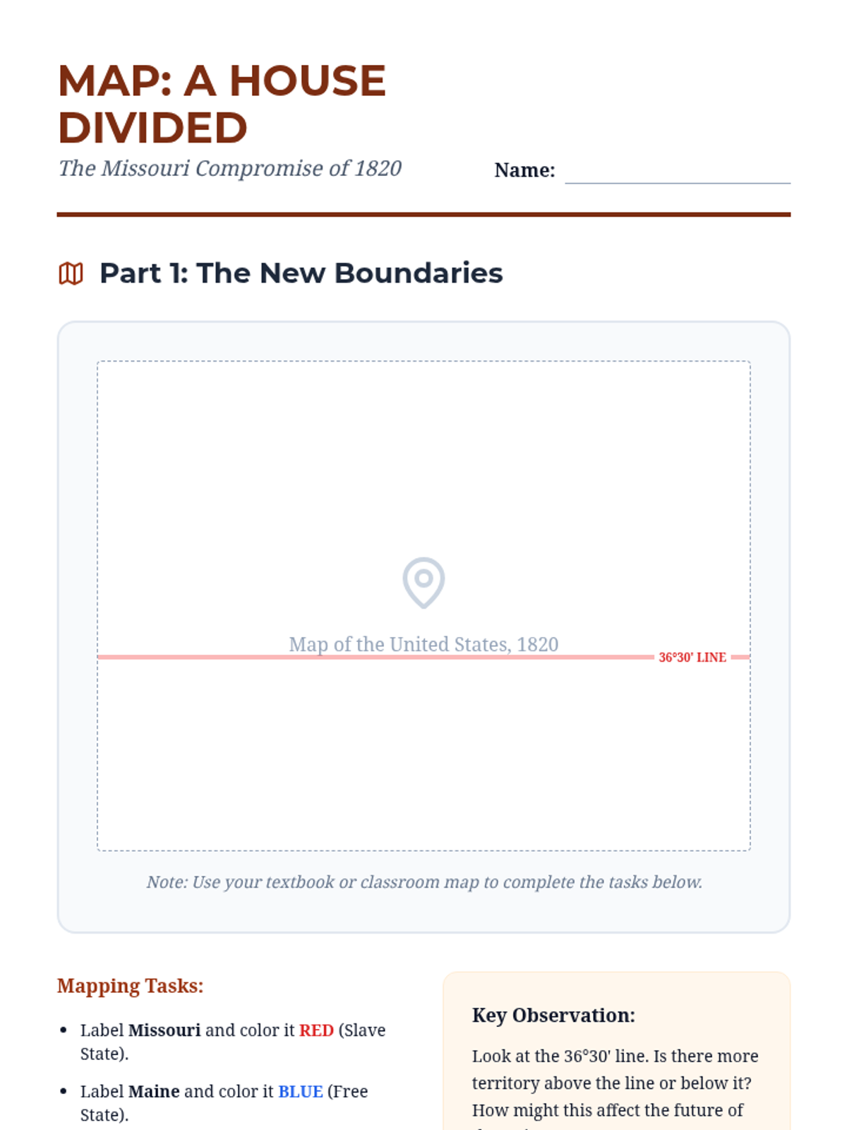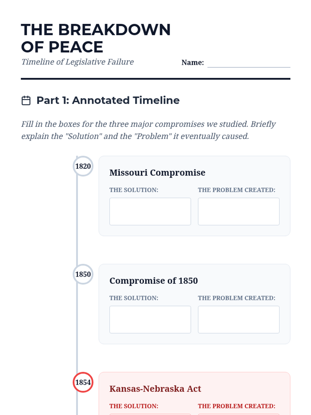 This sequence examines the major legislative attempts to resolve the conflict over slavery in the territories. Students explore the concept of 'compromise' and analyze why political solutions like the Missouri Compromise and the Kansas-Nebraska Act ultimately failed to prevent the Civil War.