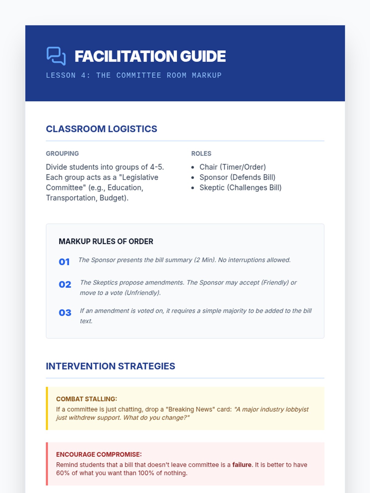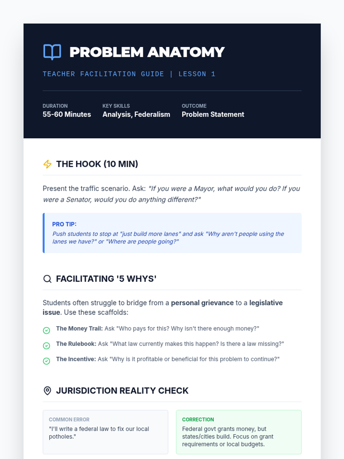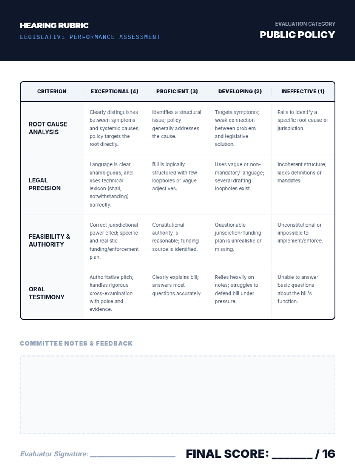 A comprehensive simulation-based unit where 12th-grade students act as legislative aides to identify social issues, analyze root causes, and draft constitutional policy solutions. The sequence guides students through stakeholder analysis, technical legal drafting, and the collaborative committee process, ending in a mock legislative hearing.