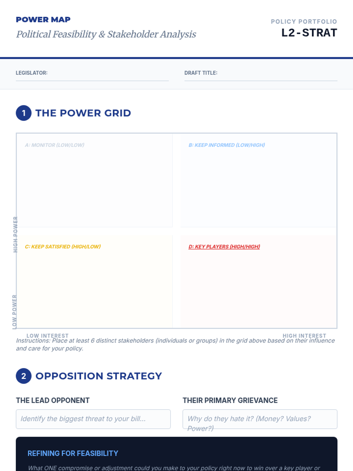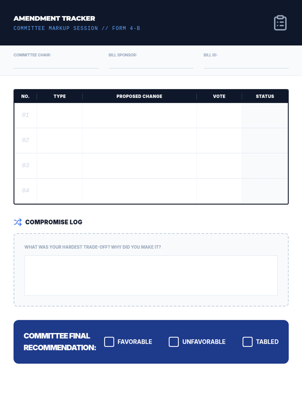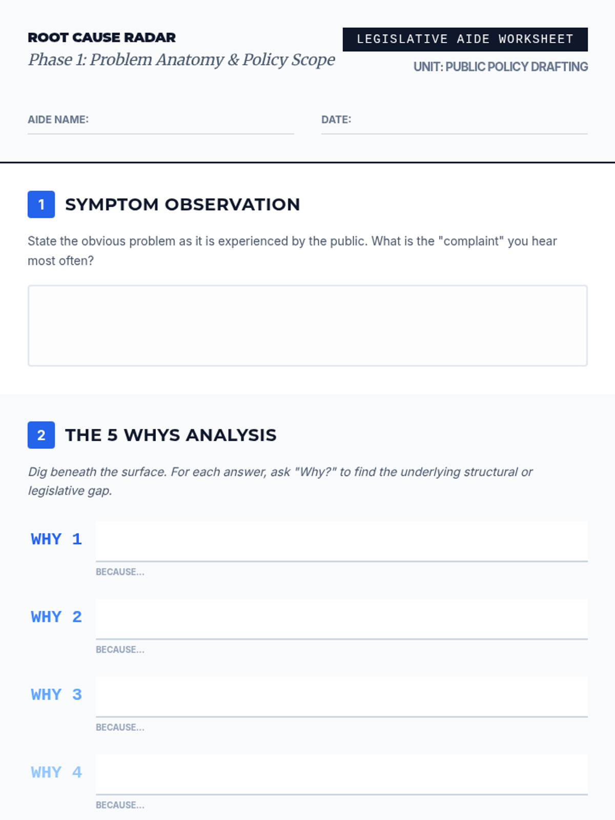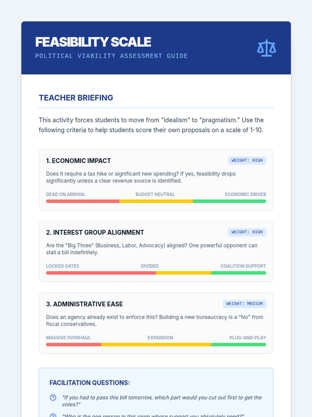 A comprehensive simulation-based unit where 12th-grade students act as legislative aides to identify social issues, analyze root causes, and draft constitutional policy solutions. The sequence guides students through stakeholder analysis, technical legal drafting, and the collaborative committee process, ending in a mock legislative hearing.