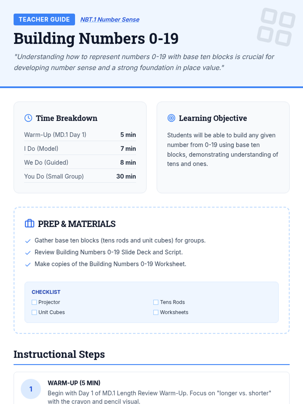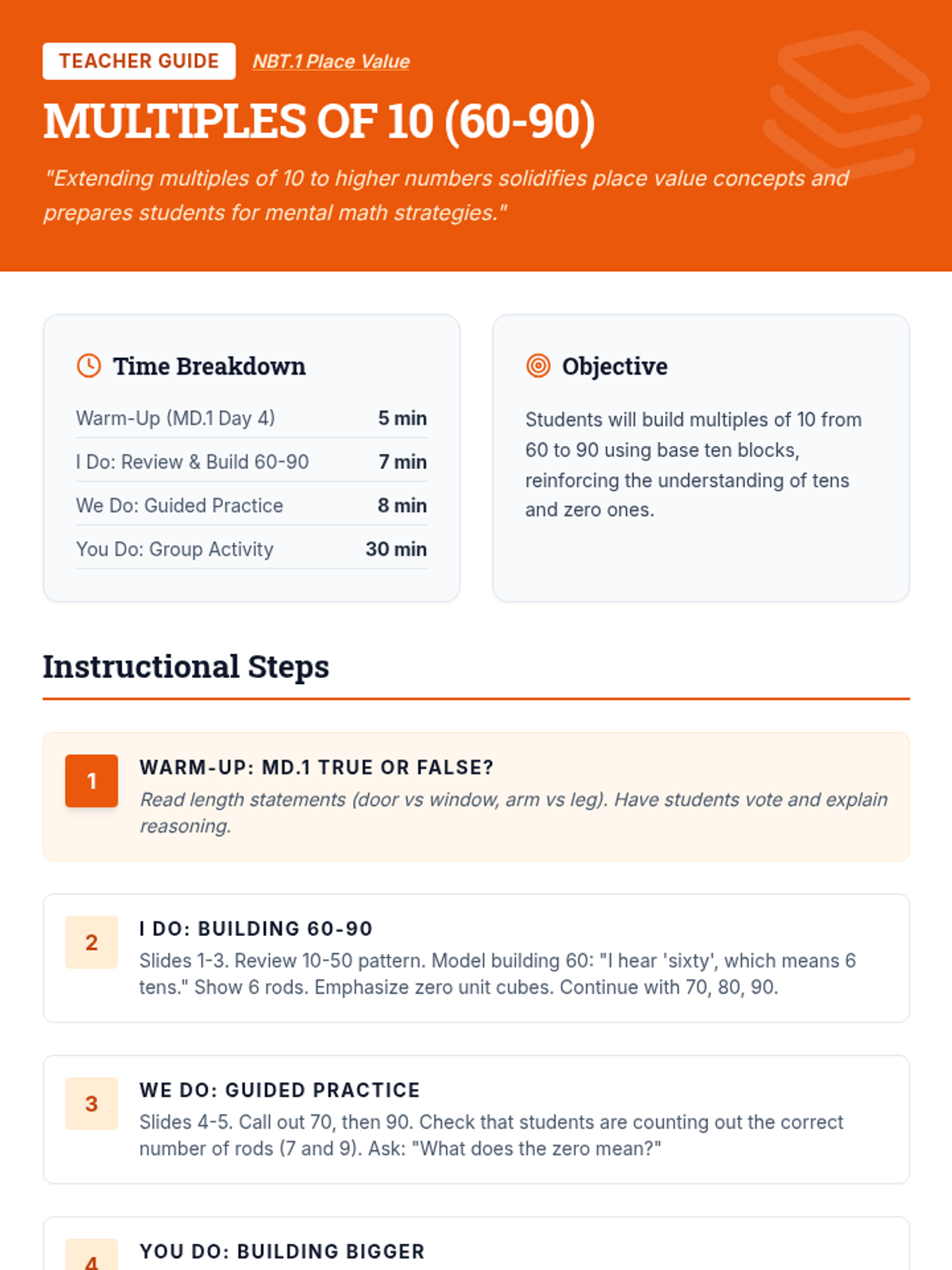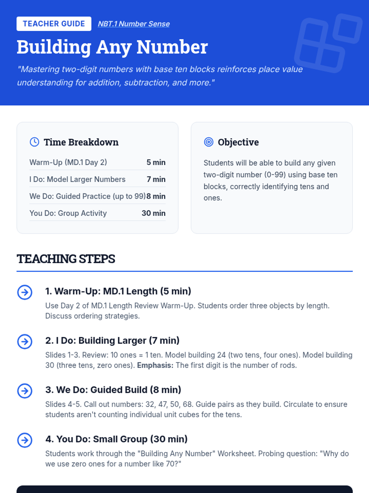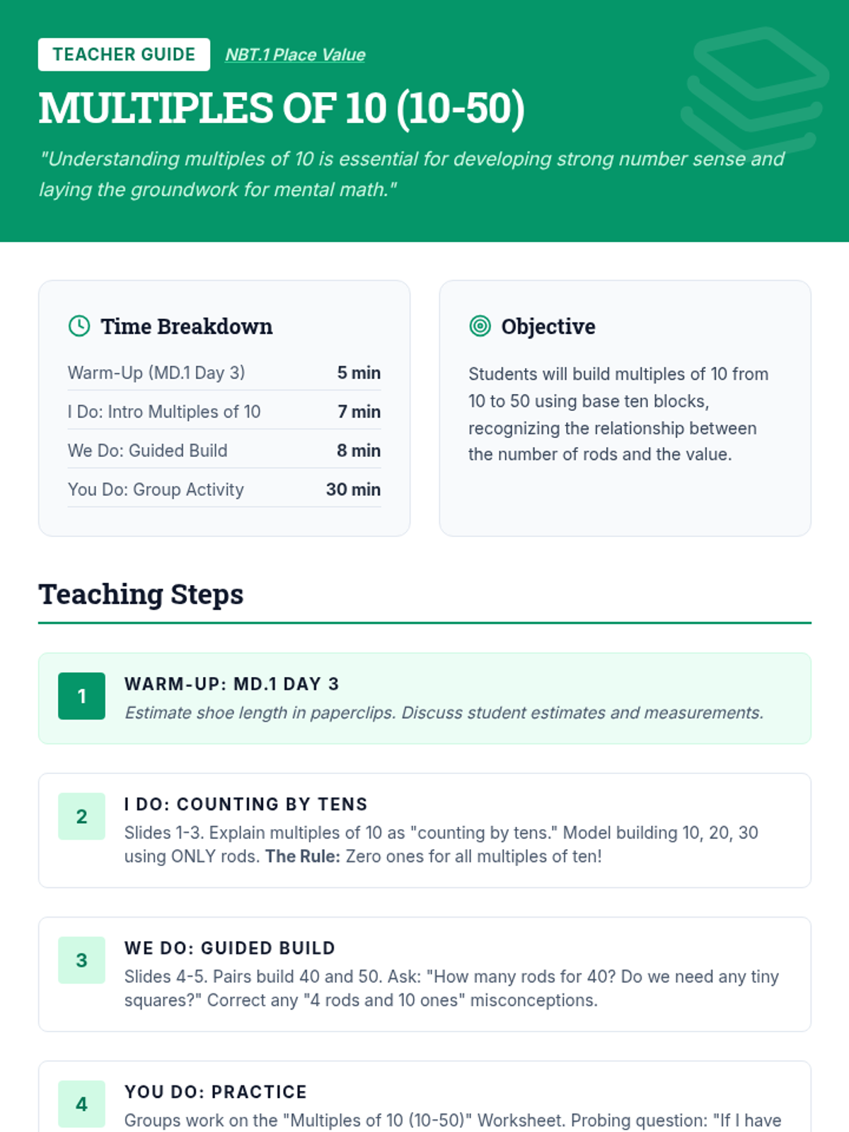 This four-day 1st-grade sequence integrates length comparison and measurement with foundational place value and number building. Students explore direct comparison, ordering, and non-standard measurement while simultaneously mastering the representation of numbers 0-99 and multiples of 10 using base ten blocks.
