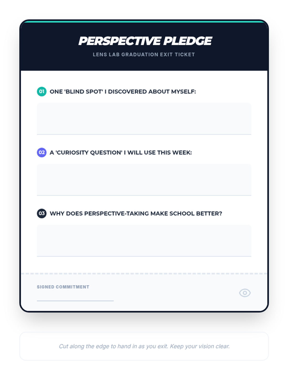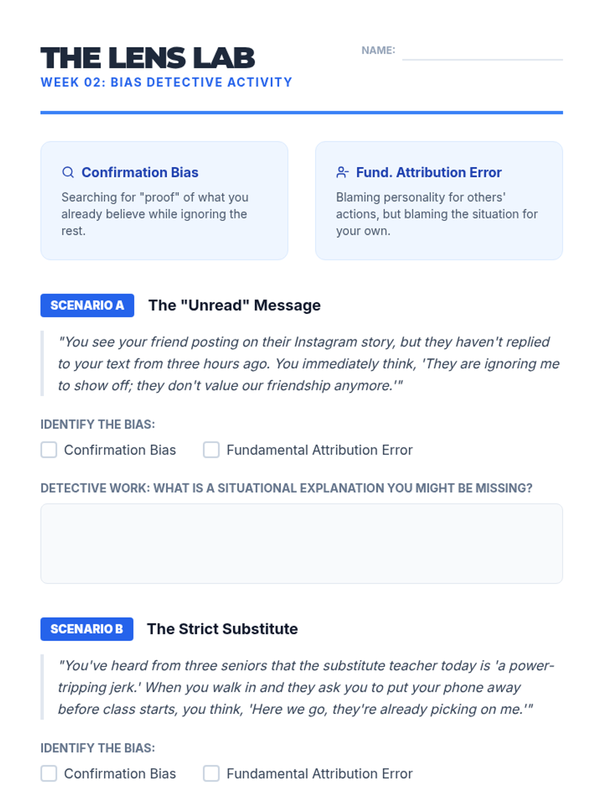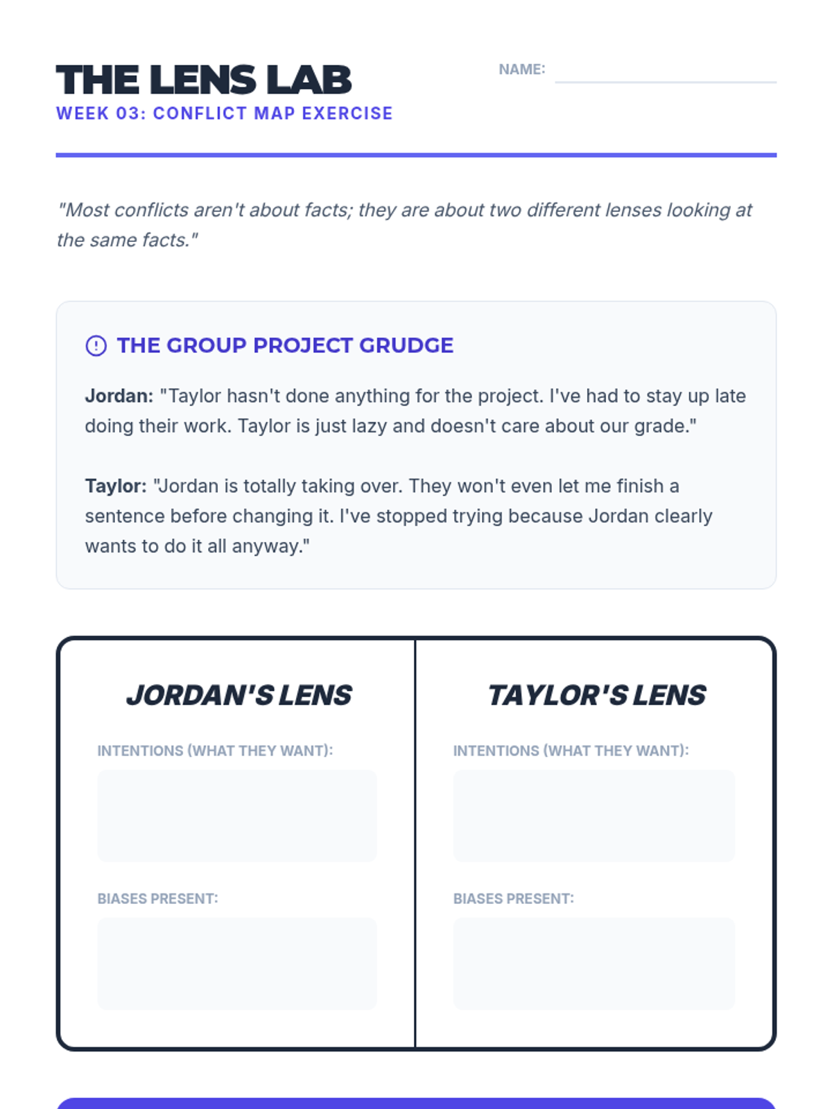 A 4-week high school curriculum exploring perspective-taking through the lens of cognitive biases and conflict resolution. Students move from individual reflection to active scenario analysis and collaborative problem-solving.
