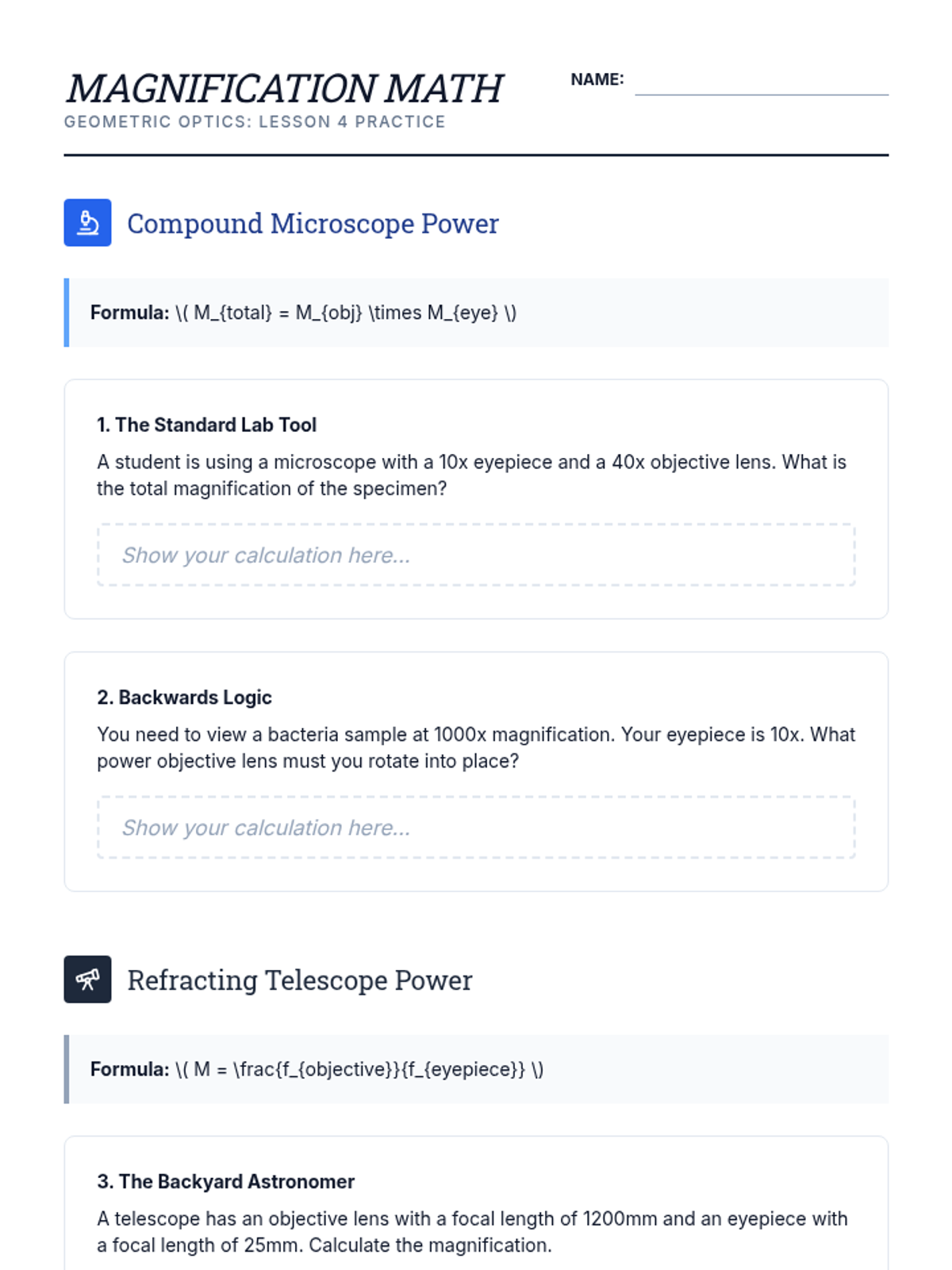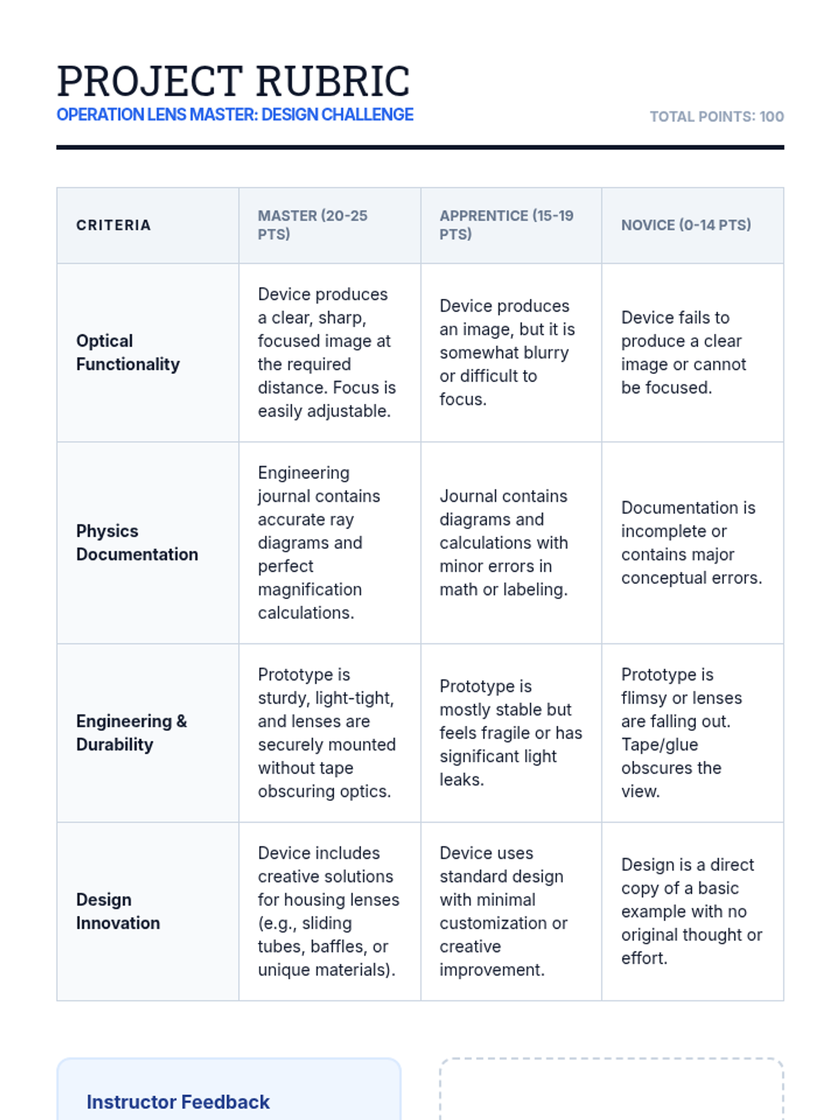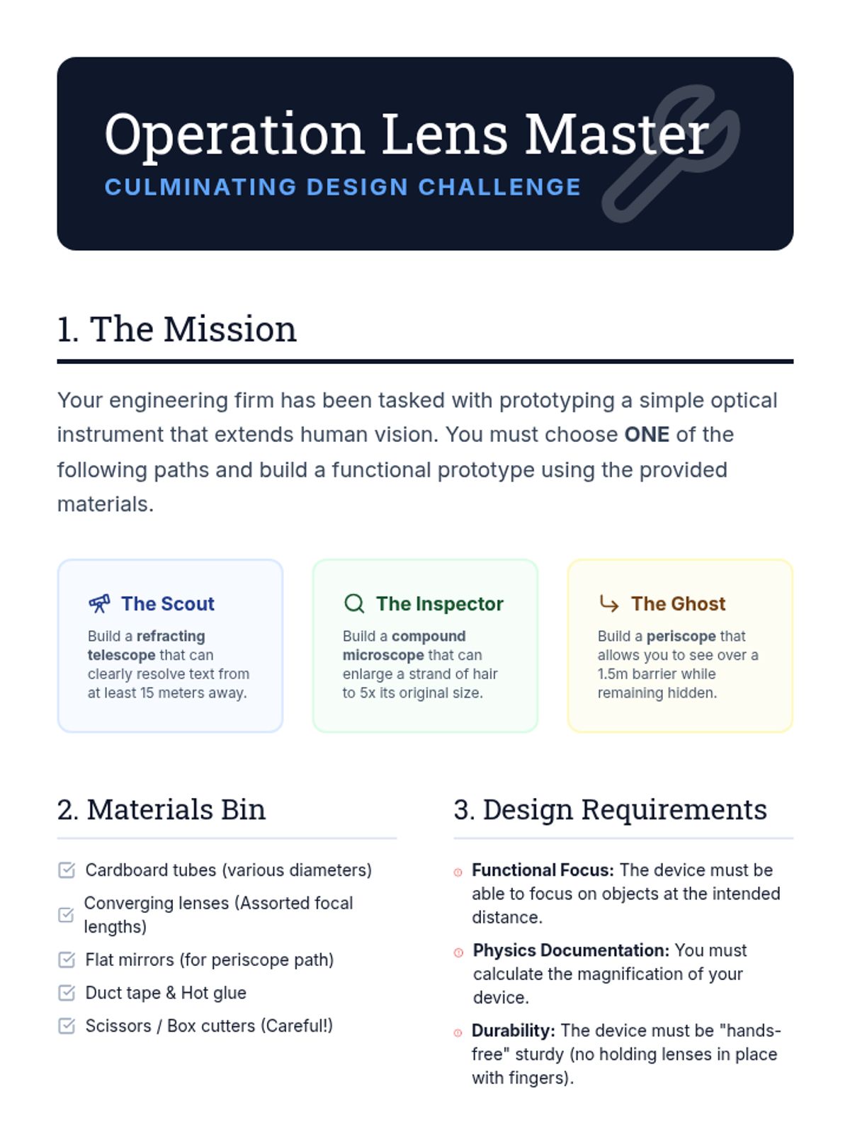 A 10th-grade physics sequence on geometric optics, focusing on the human eye, vision correction, and the engineering of compound optical instruments like telescopes and microscopes. Students apply refraction principles to real-world biological and technical systems through a culminating design challenge.
