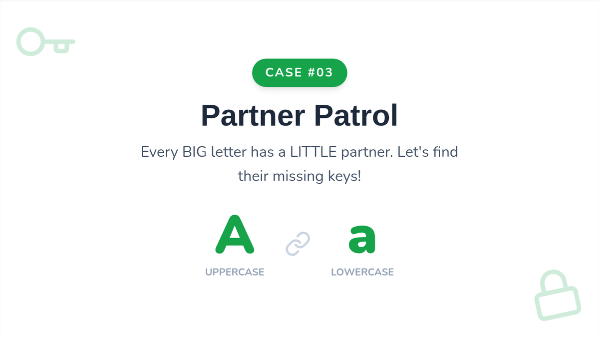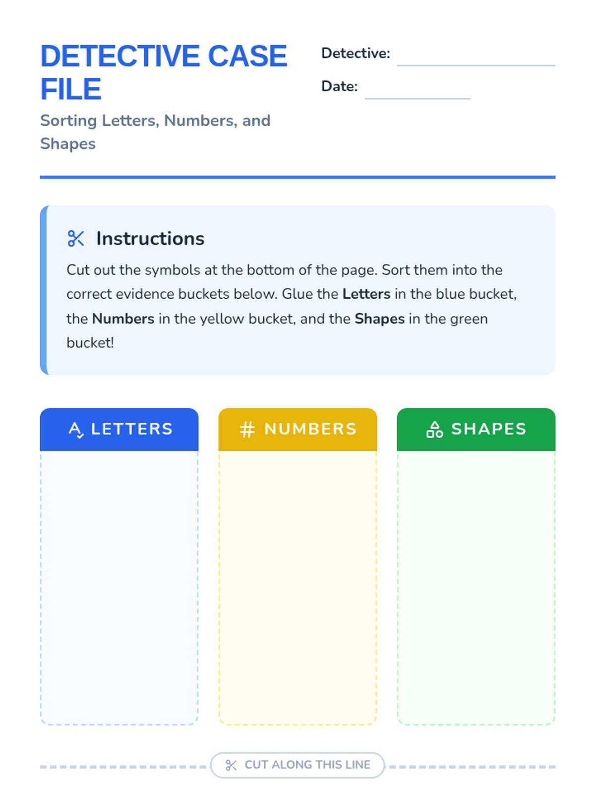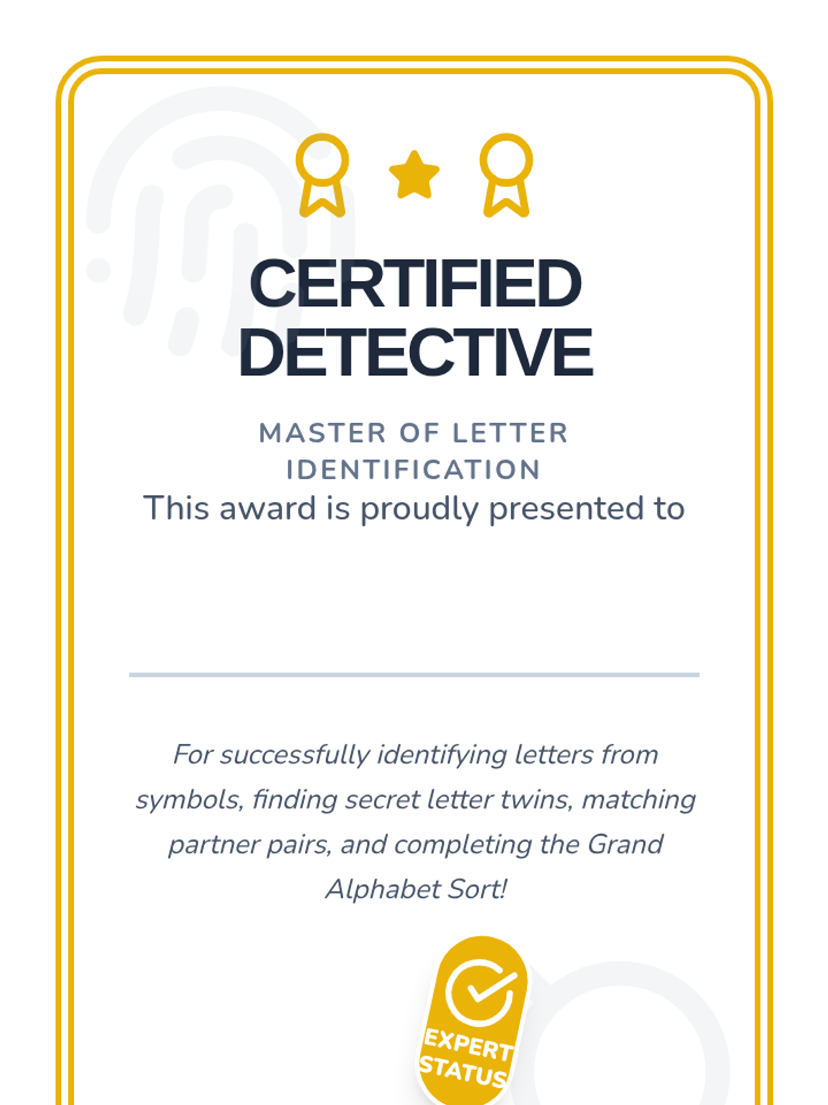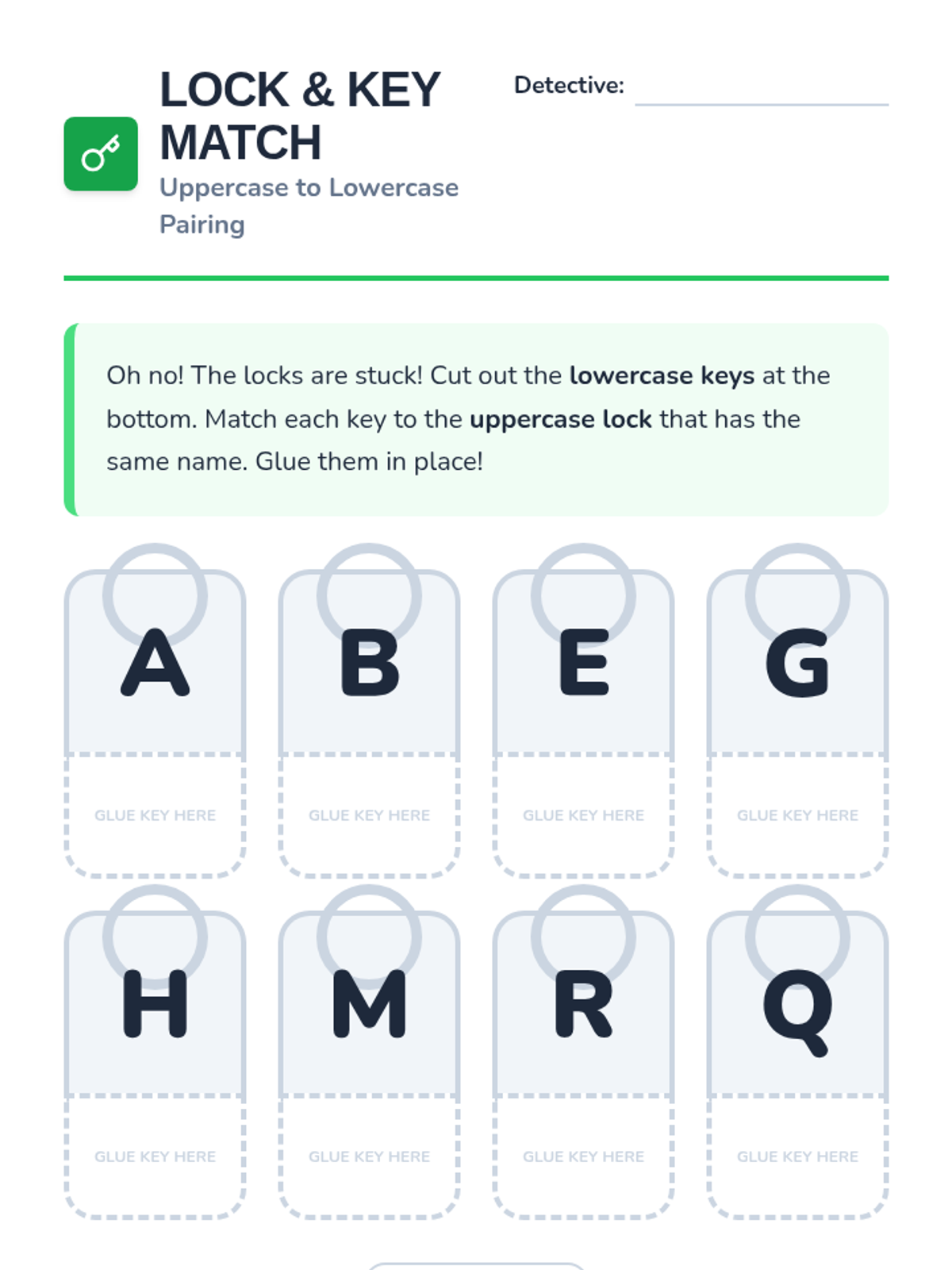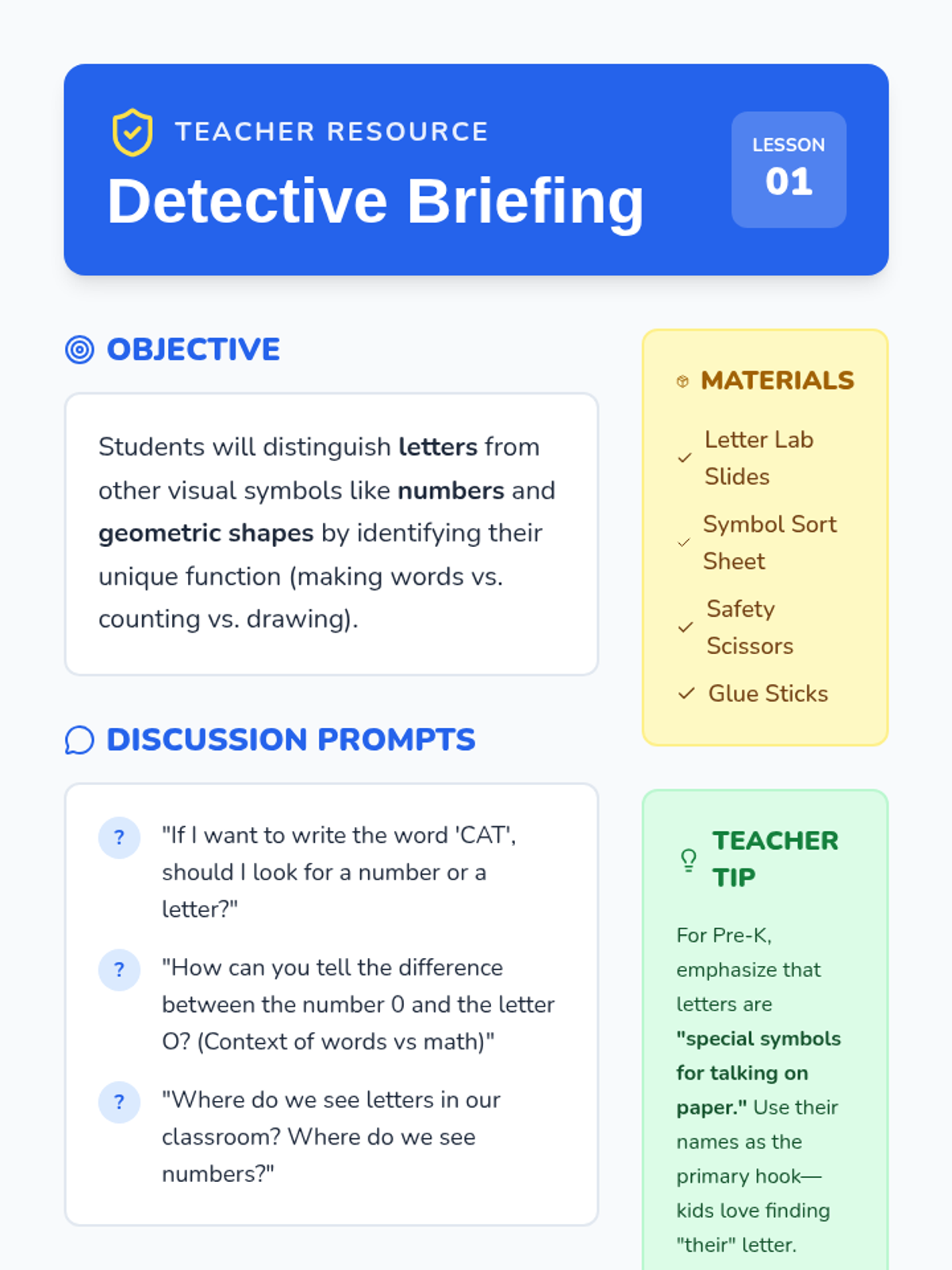This Pre-K sequence uses a 'Detective Lab' theme to help students master letter identification, visual discrimination between letters and other symbols, and matching uppercase and lowercase pairs through interactive games and hands-on activities.