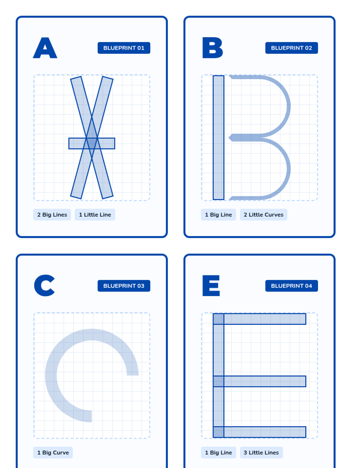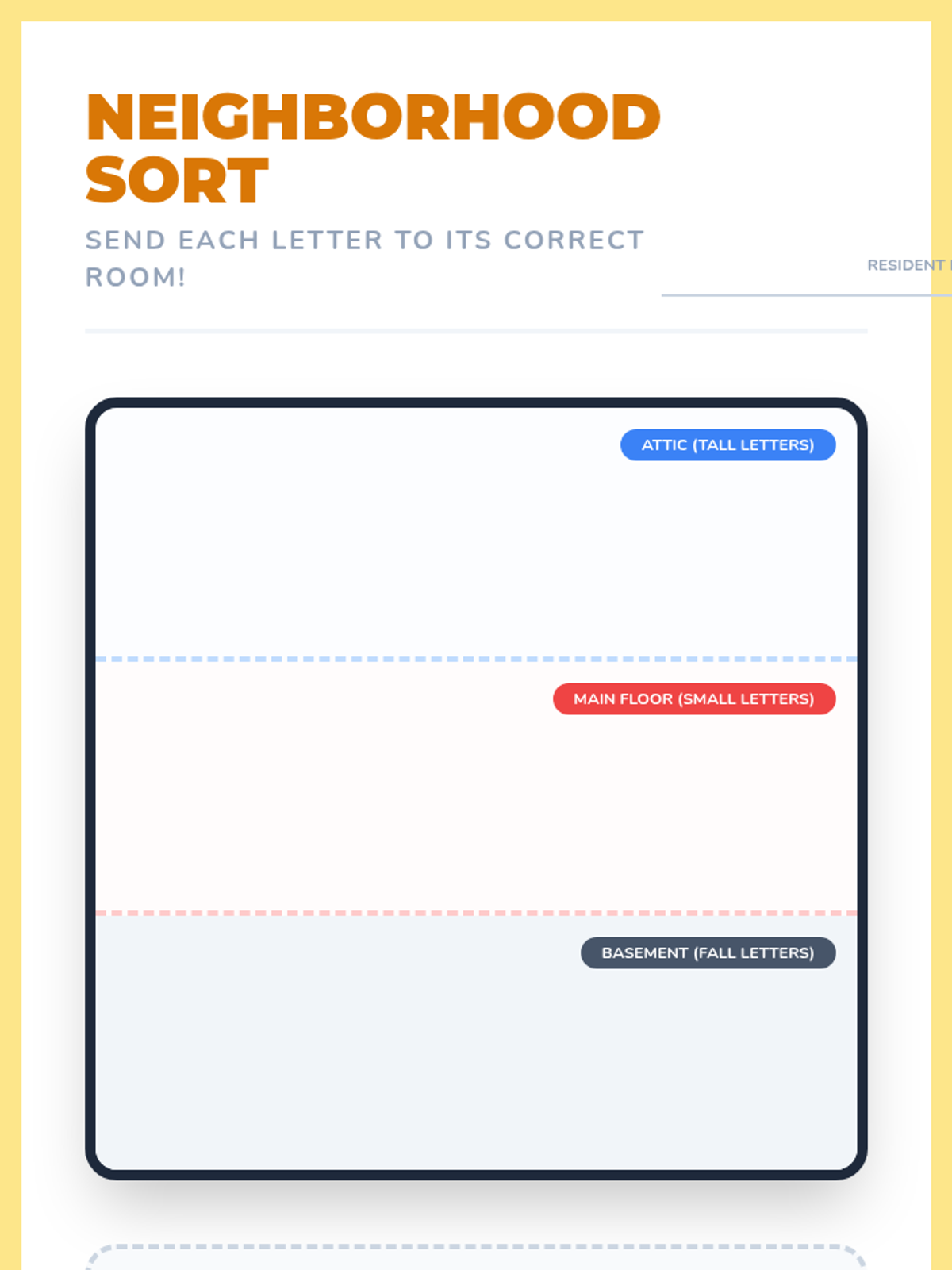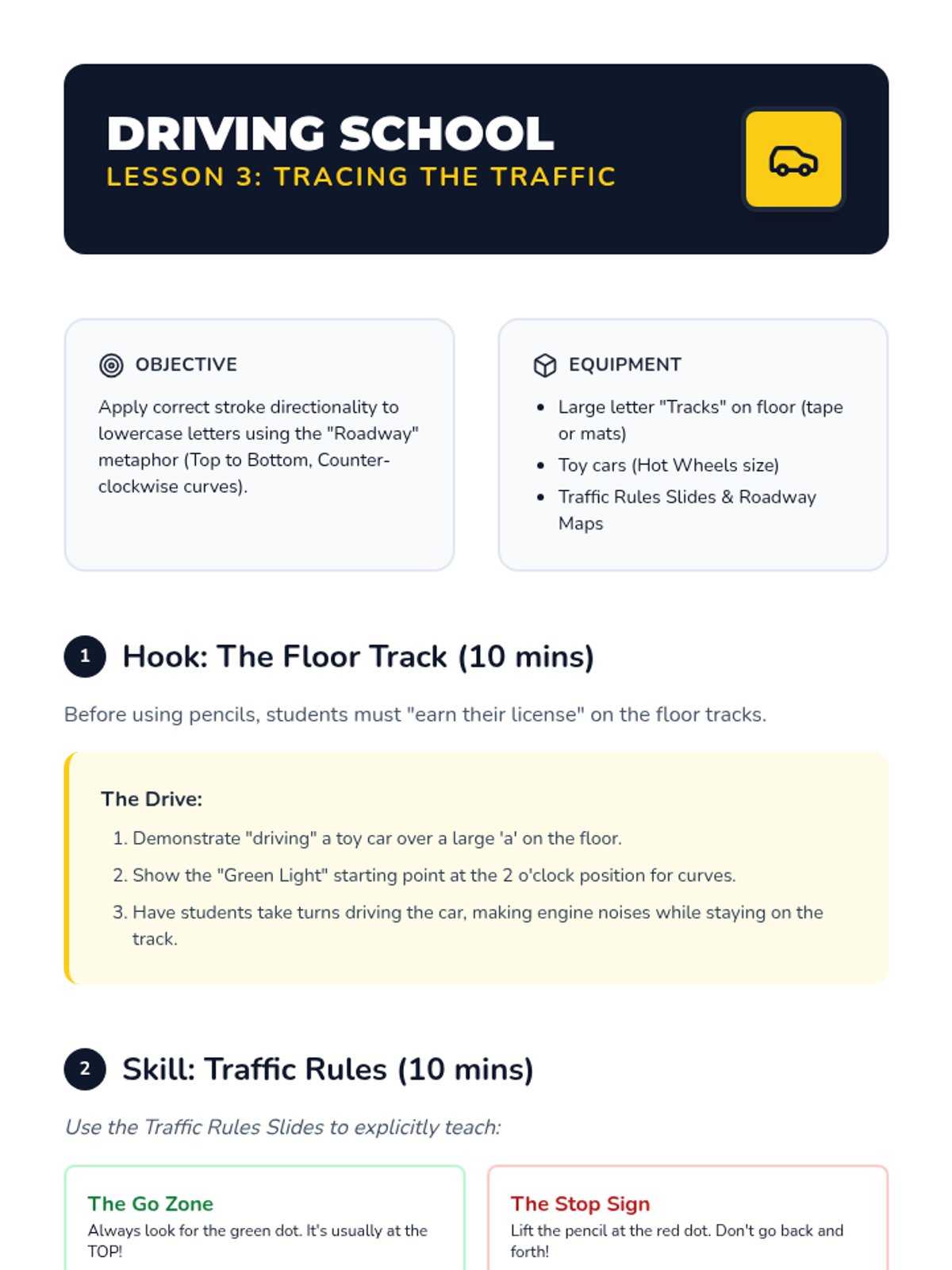A workshop-style sequence for Kindergarteners focusing on the mechanics of handwriting. Students move from gross motor sky writing to fine motor control, learning to build and categorize uppercase and lowercase letters using lines, curves, and spatial alignment.