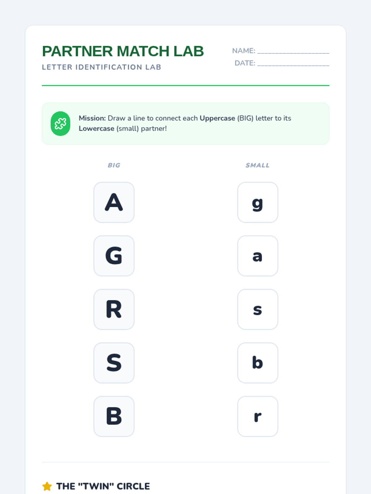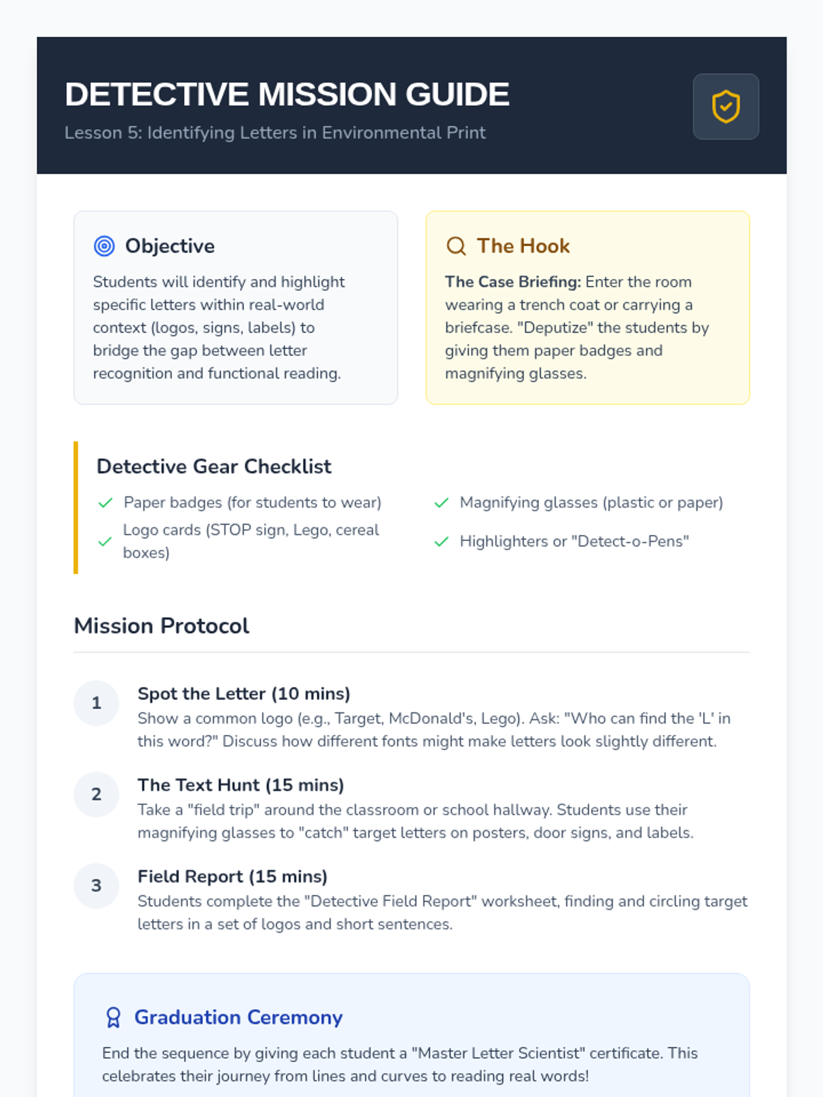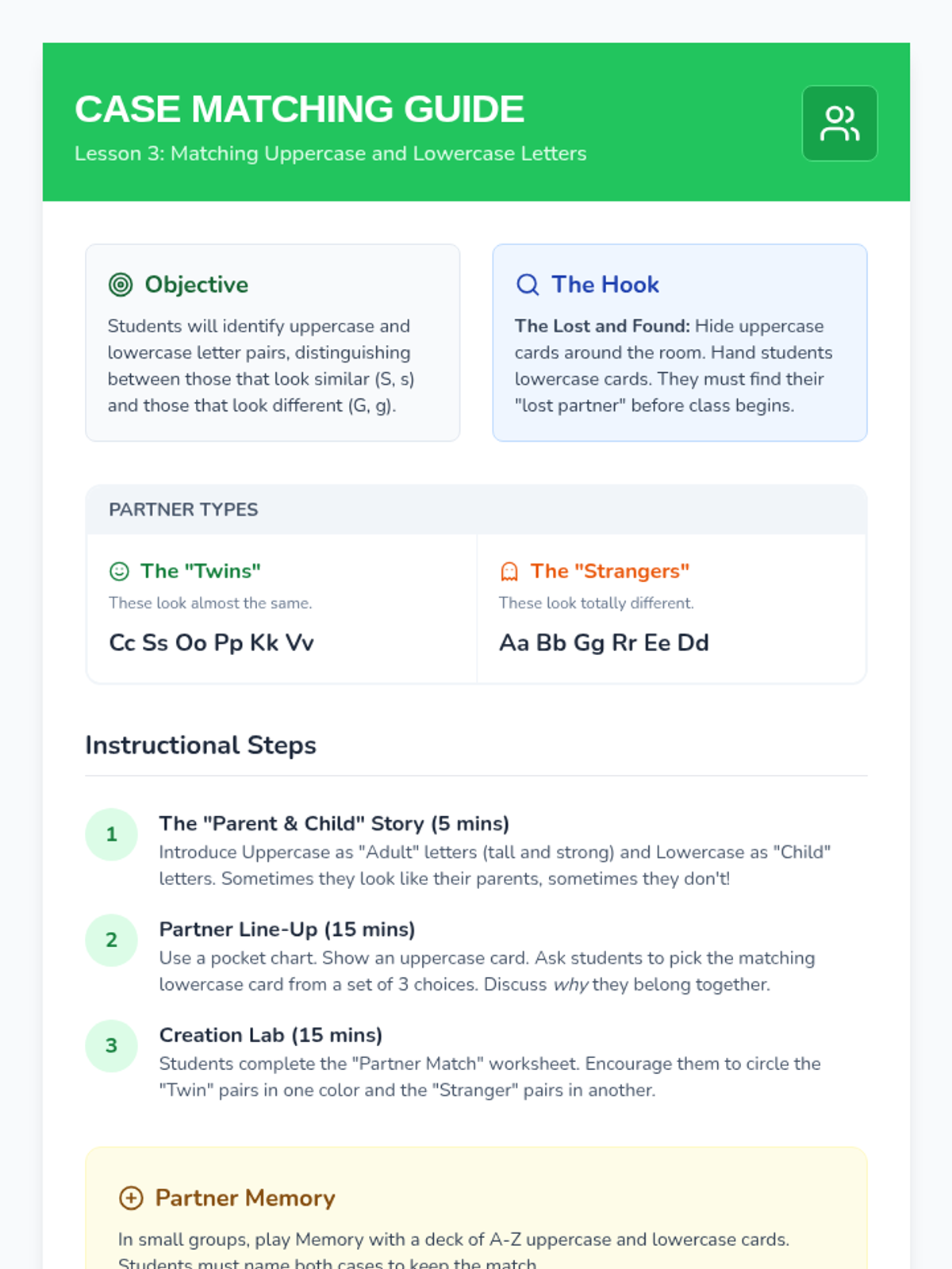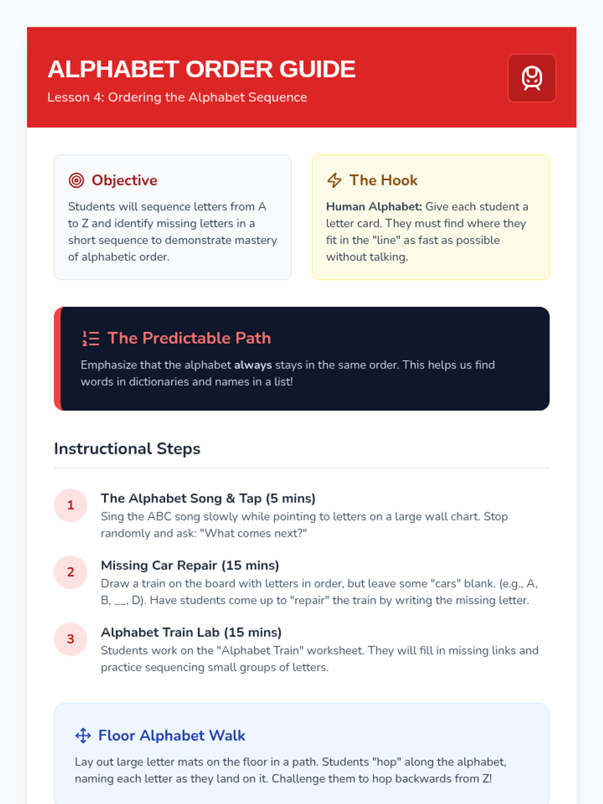 This sequence guides Kindergarten students through the visual analysis of letterforms, focusing on line types, orientation, case matching, and alphabetical order to build strong letter identification skills.