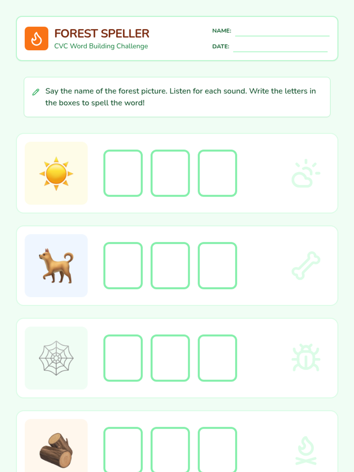 A comprehensive phonics sequence for kindergarteners focusing on CVC words, word families, digraphs, and blends through engaging forest-themed activities.