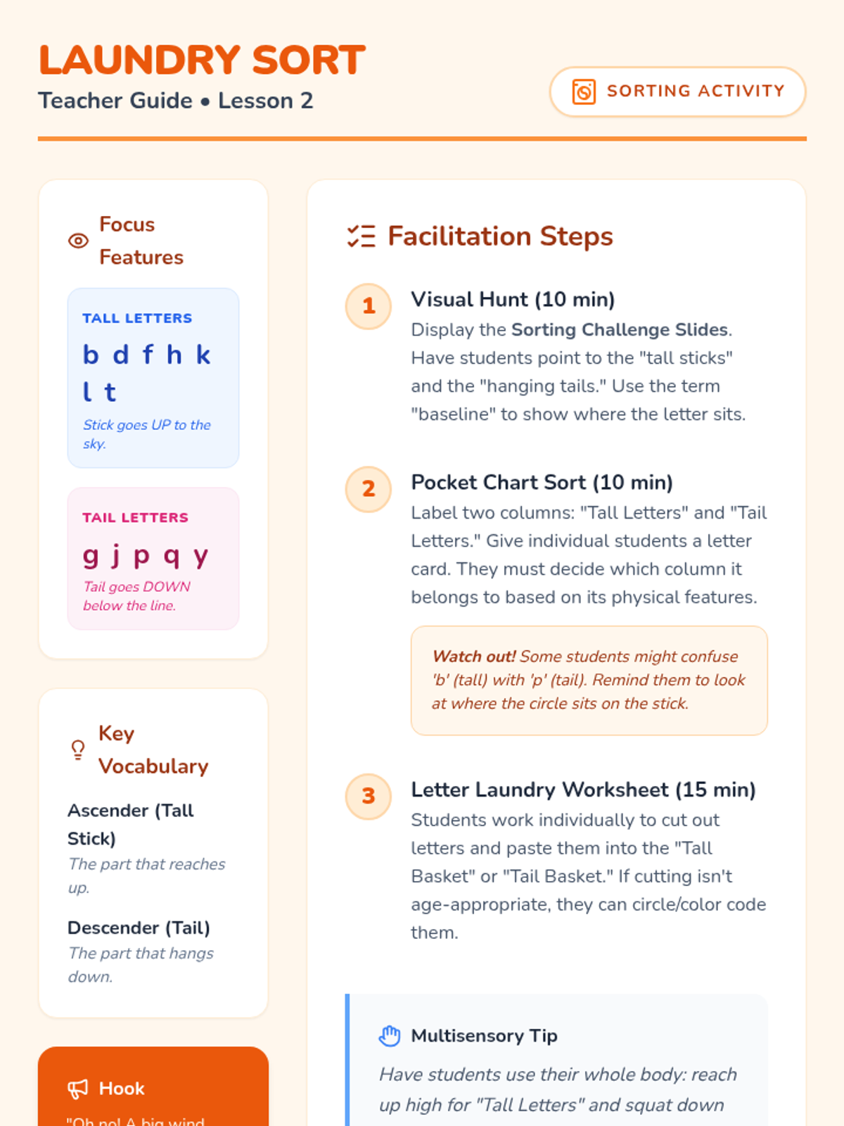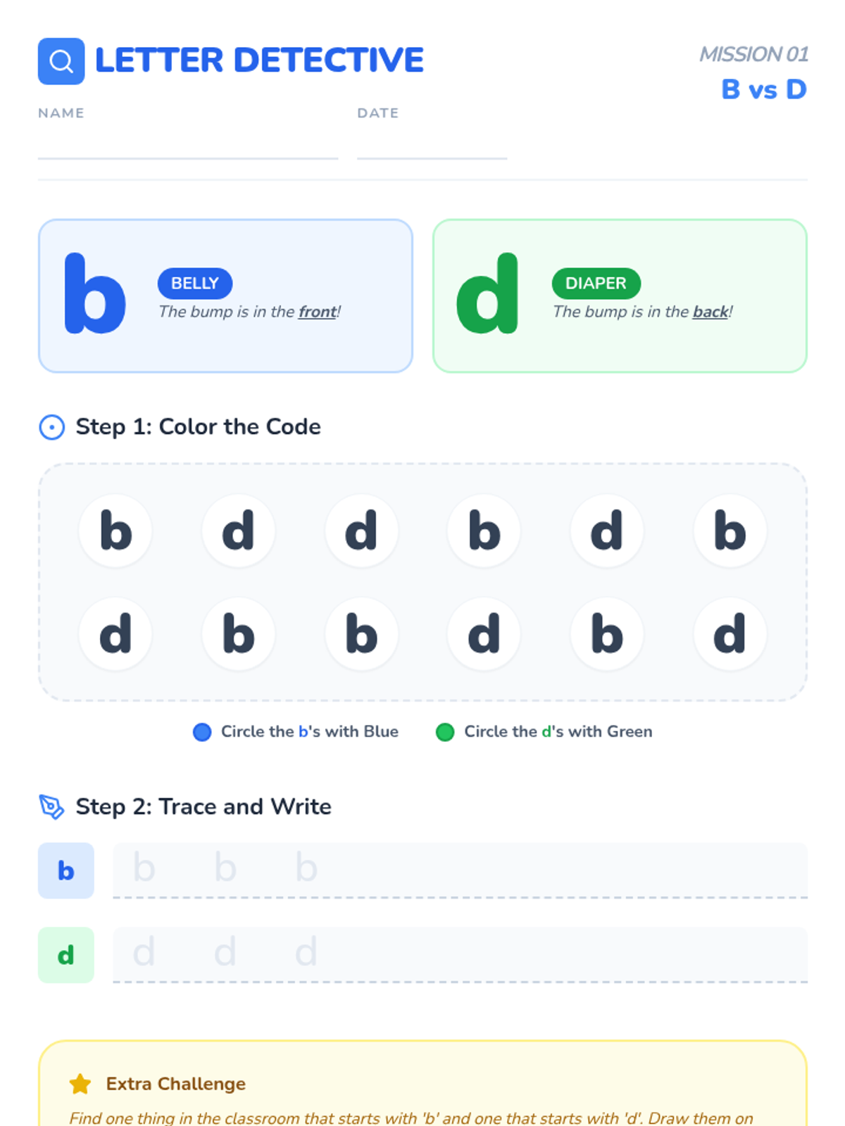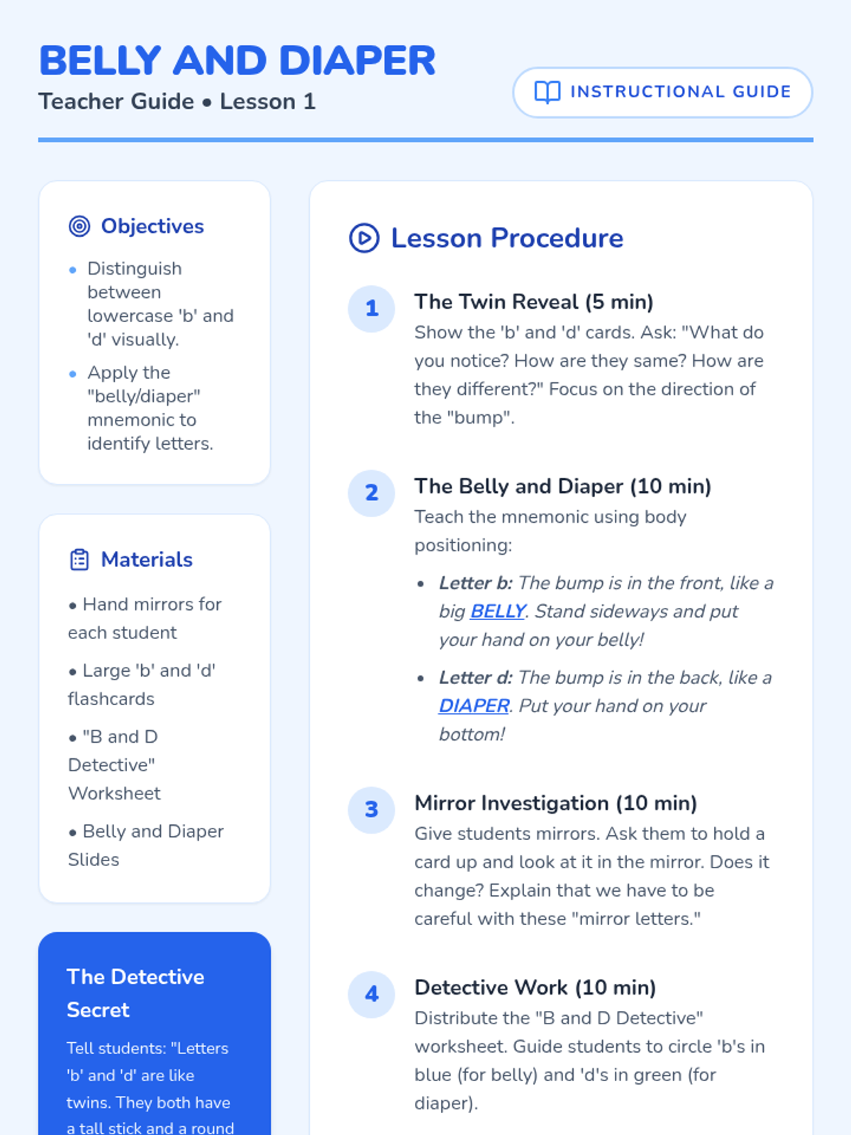 A Pre-K phonics sequence focused on distinguishing visually similar lowercase letters (b/d, p/q, m/w, n/u) through inquiry, movement, and game-based learning. Students act as 'Letter Detectives' to investigate shapes, orientations, and sounds.