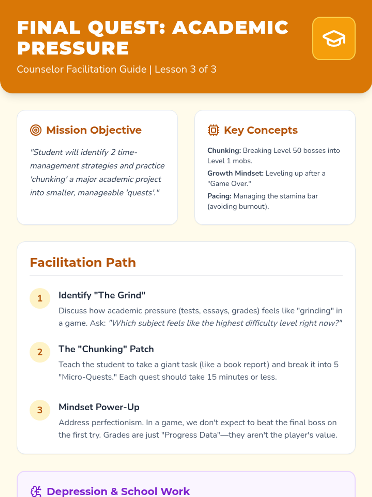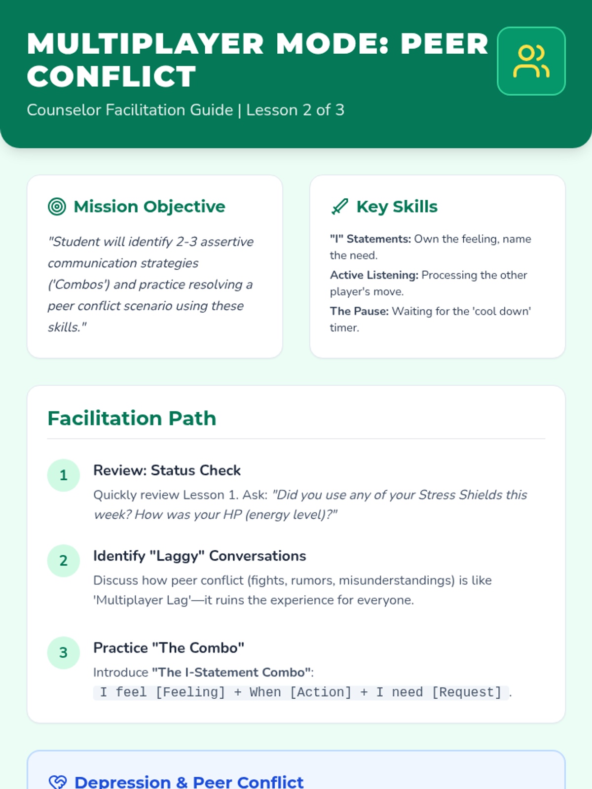A 3-lesson counseling series for 6th graders to build coping skills for stress, peer conflict, and academic pressure using an engaging "Level Up" gamer theme. Each lesson provides specific strategies to help students manage symptoms of depression and navigate middle school challenges.
